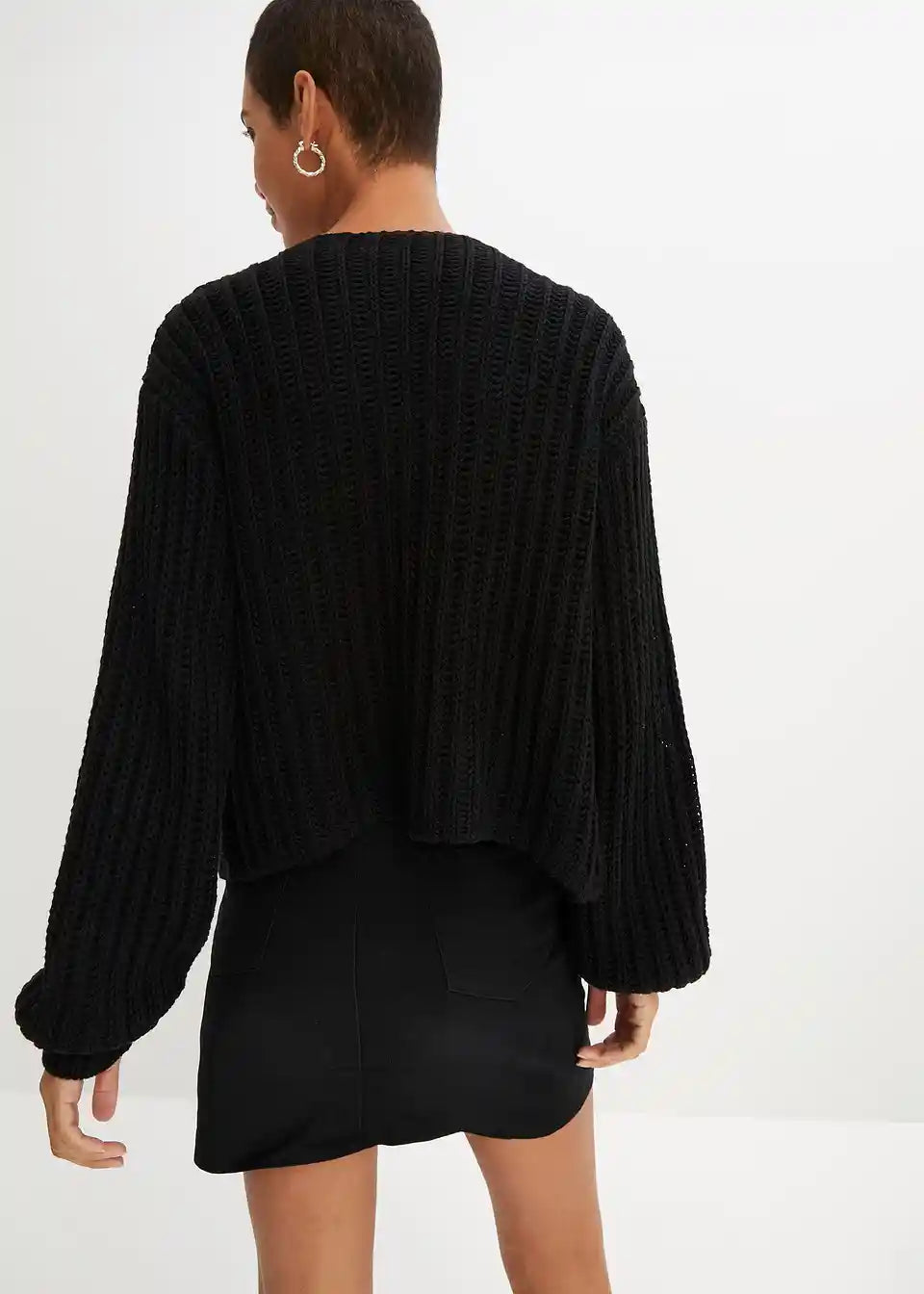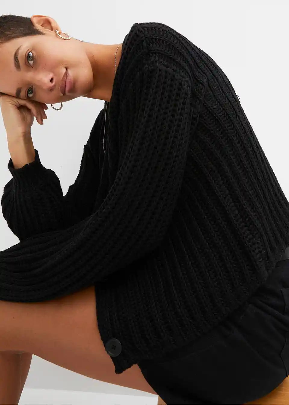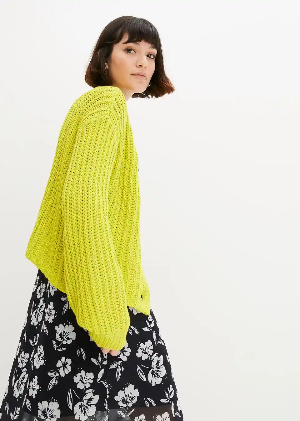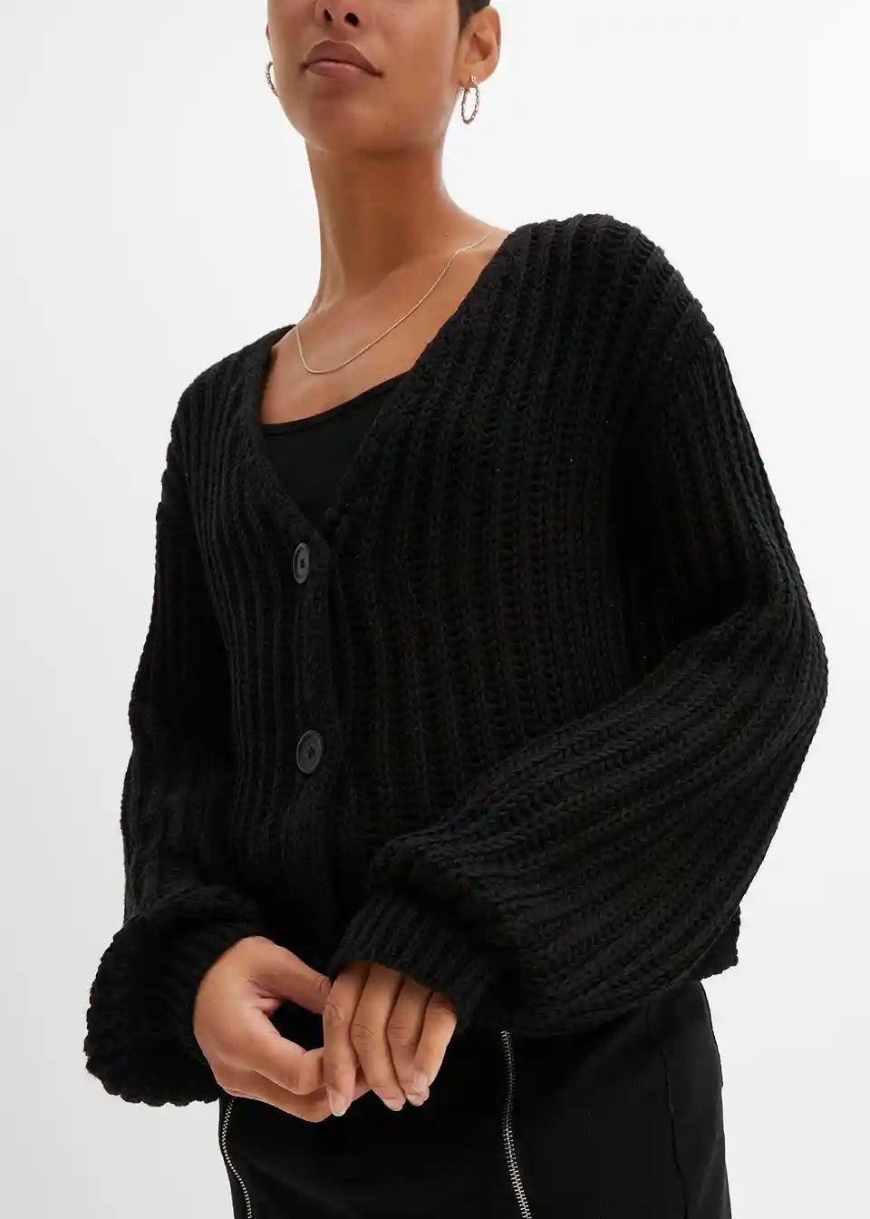 Debeli pleteni kardigan s voluminoznim rukavima i spuštenim ramenima