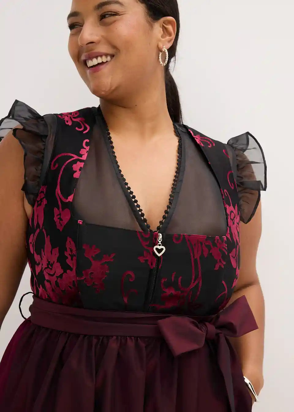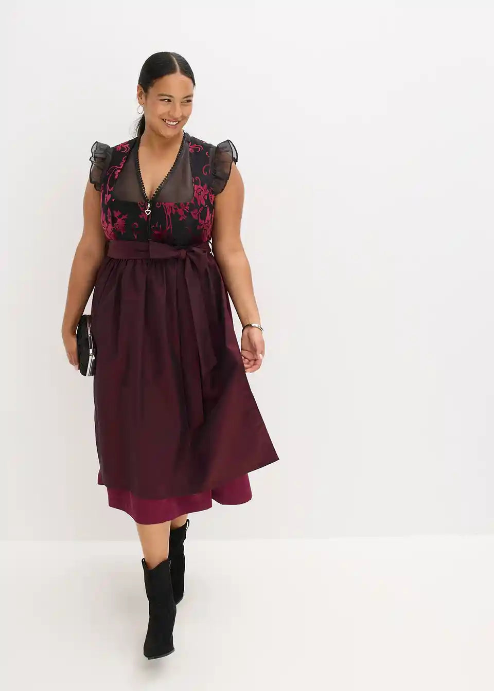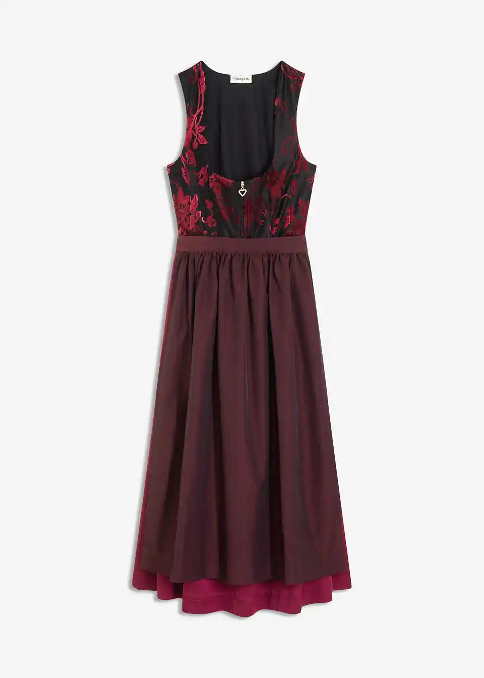 tradicionalni Dirndl s kvalitetnim korzetom od baršuna s burn-out uzorkom i svjetlucavom pregačom. Suknja s ugodnom pamučnom podstavom.