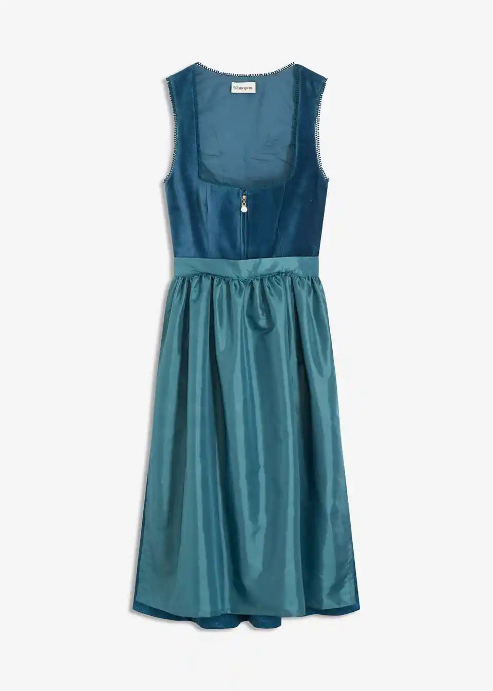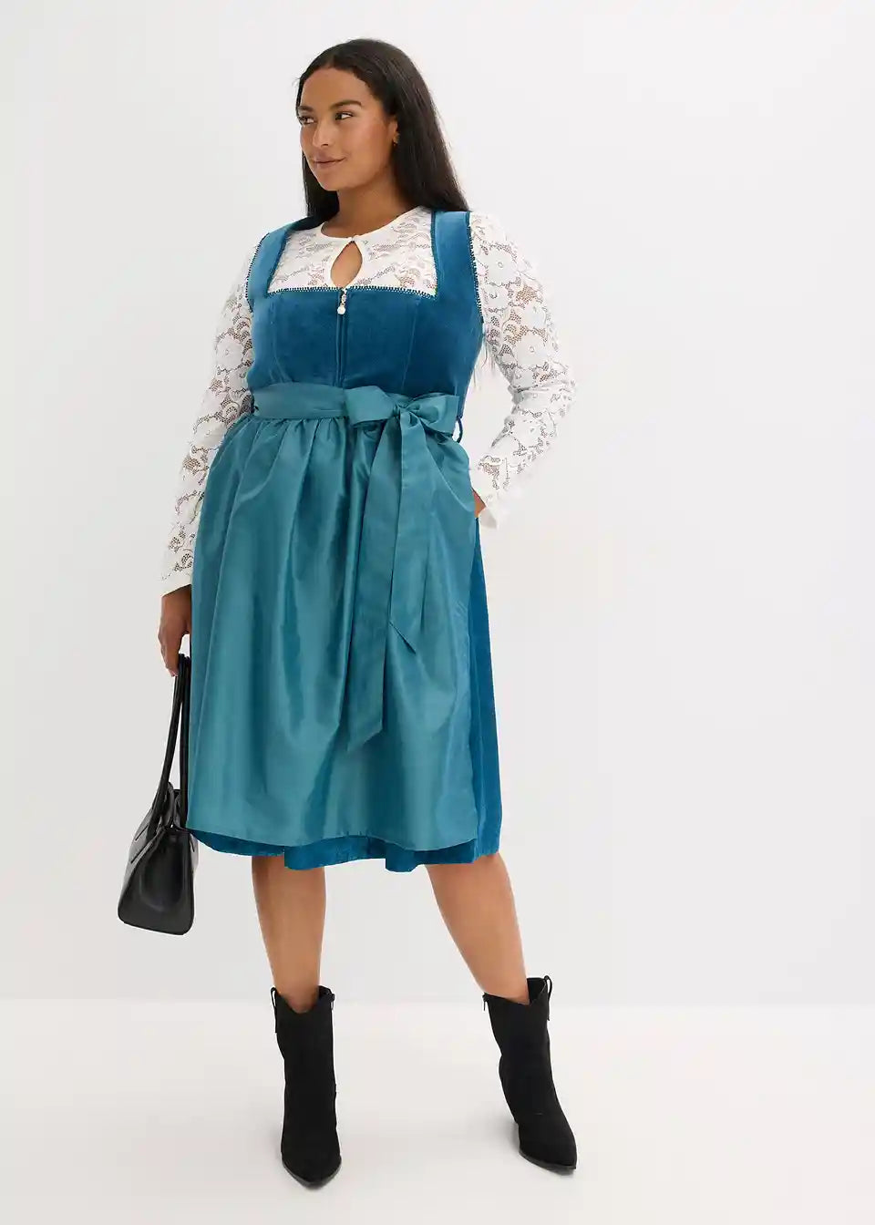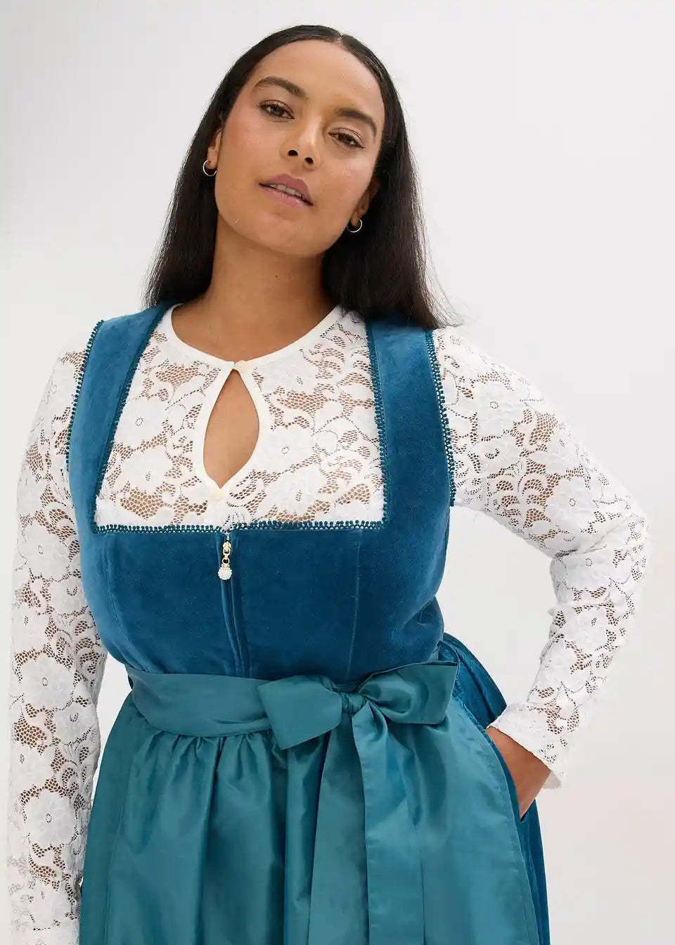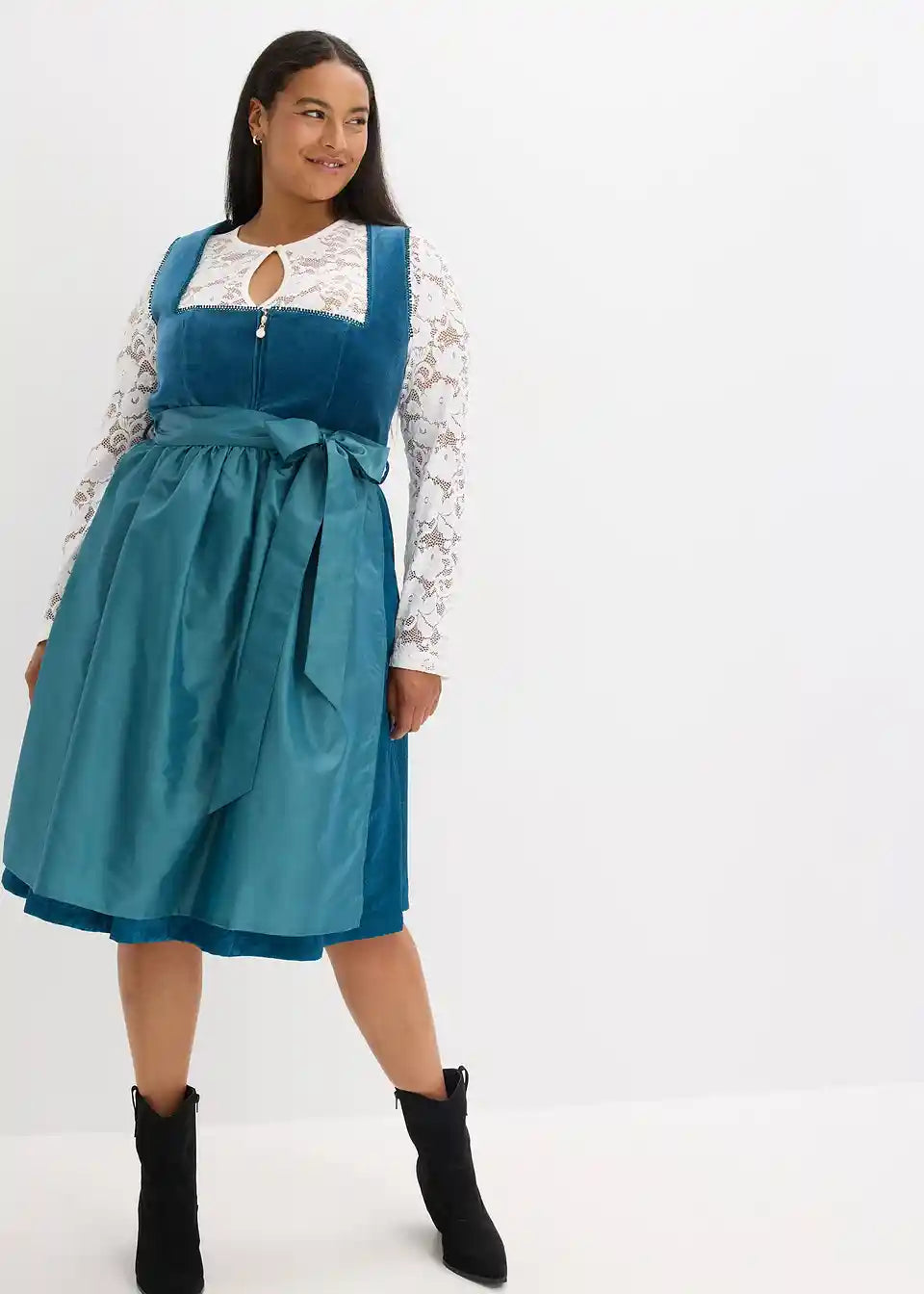 tradicionalni Dirndl s visokokvalitetnim baršunastim prslukom i svjetlucavom pregačom. Suknja je opremljena ugodnom pamučnom podstavom.
