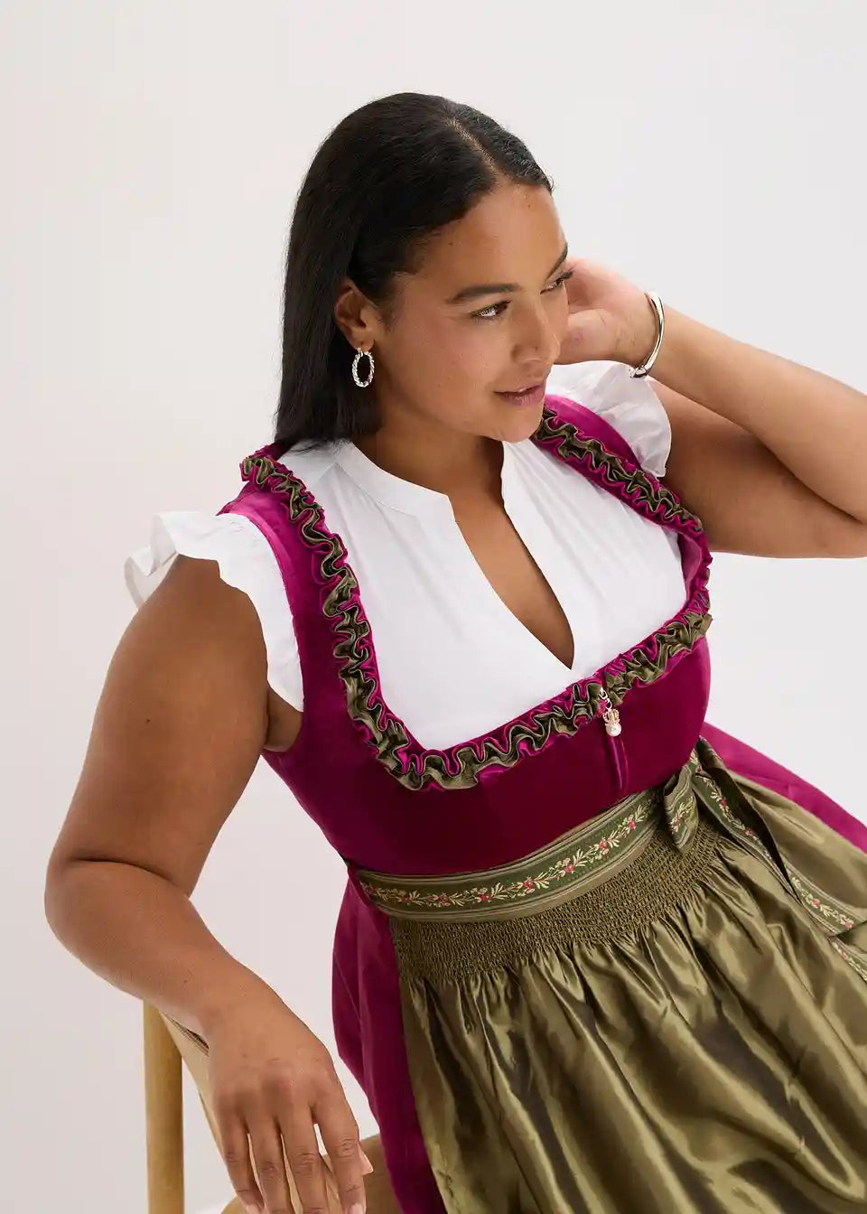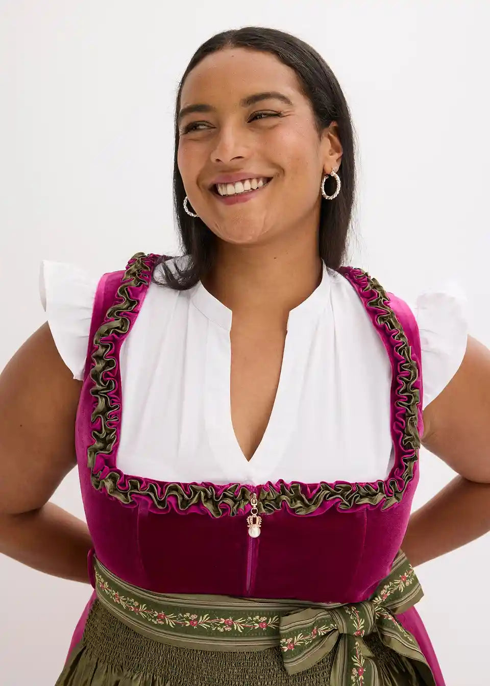 Tradicionalni dirndl s visokokvalitetnim baršunastim prslukom i mijenjajućom pregačom. Suknja je opremljena ugodnom podstavom od pamuka.