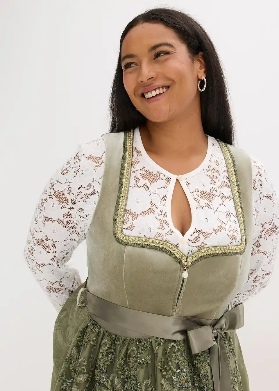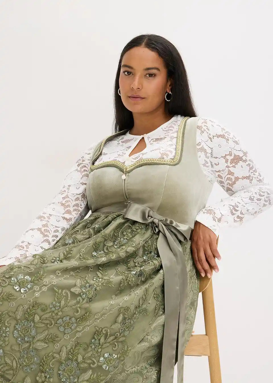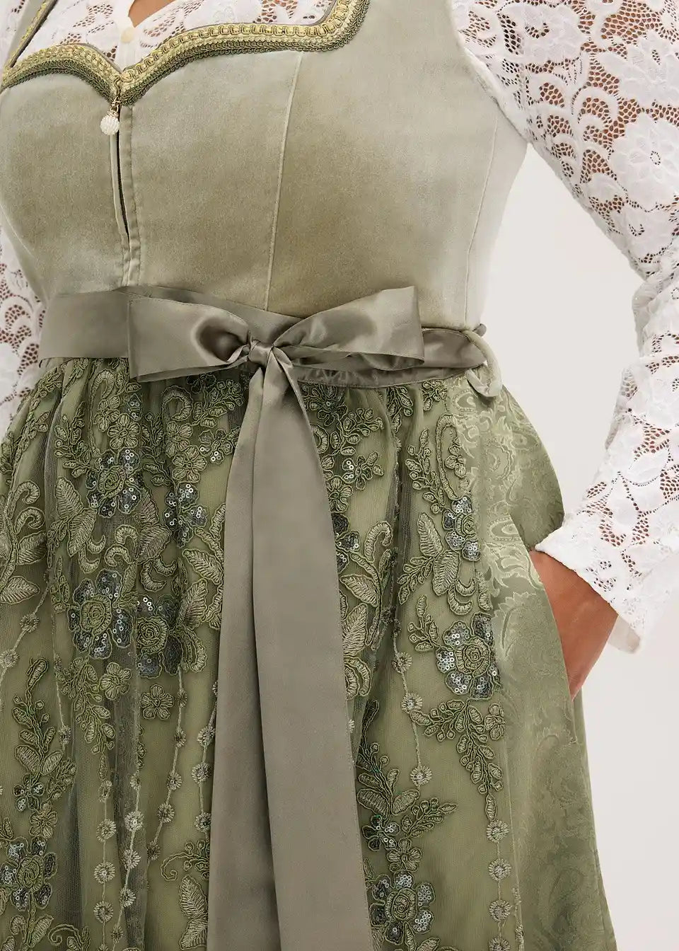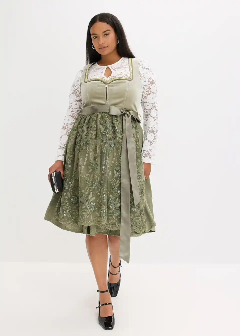 Sjajni Dirndl s baršunastim korzetom i pregačom s uzorkom vezanim šljokicama