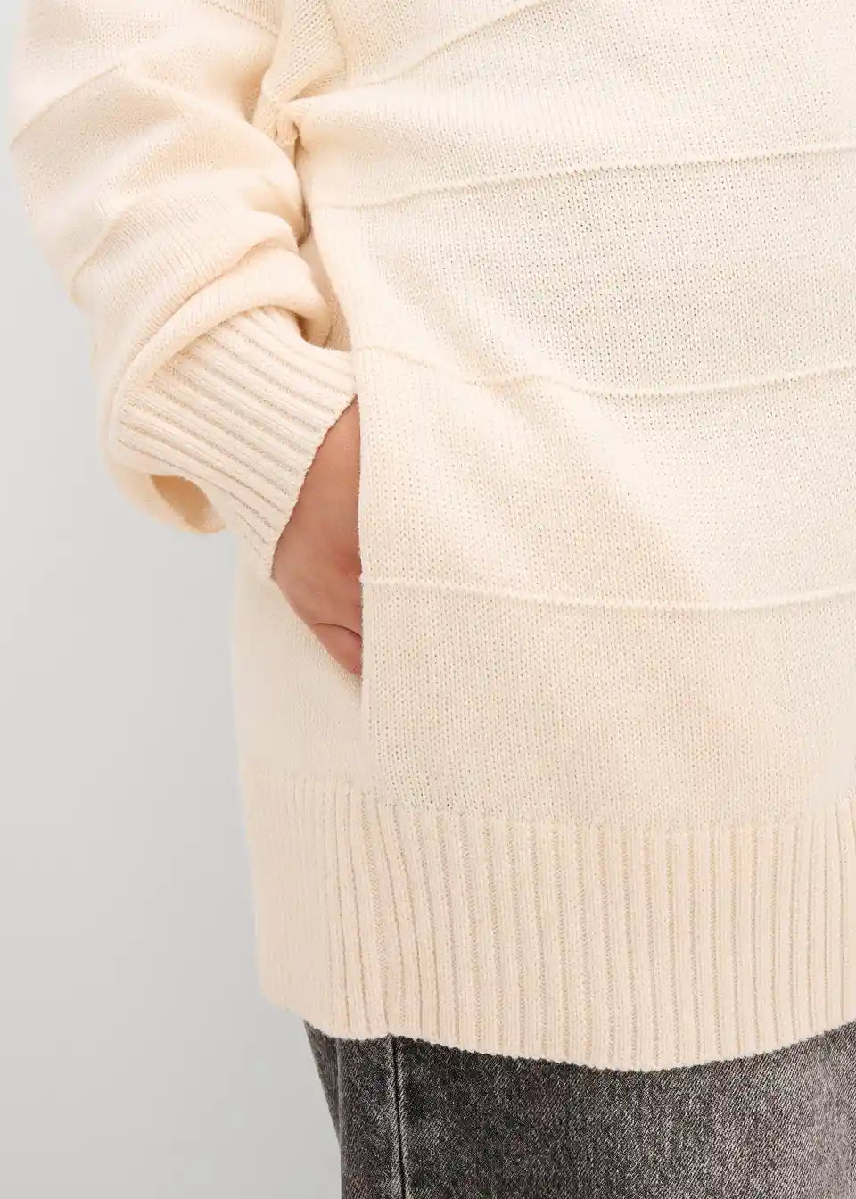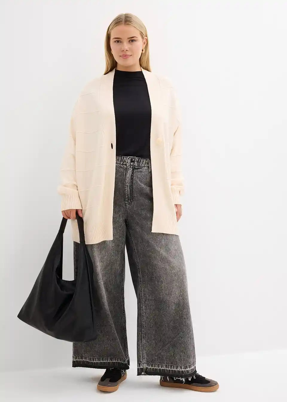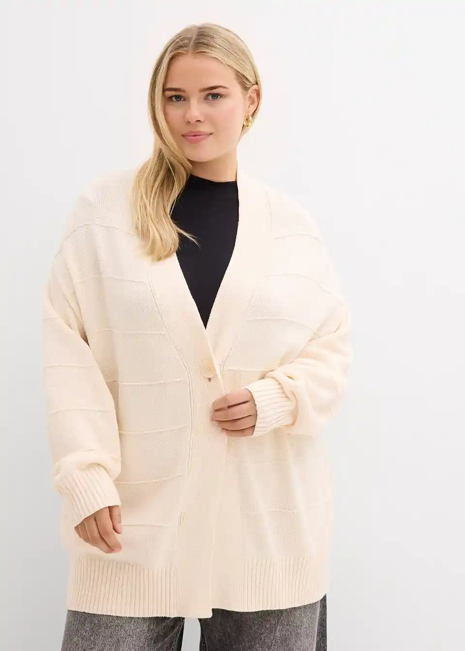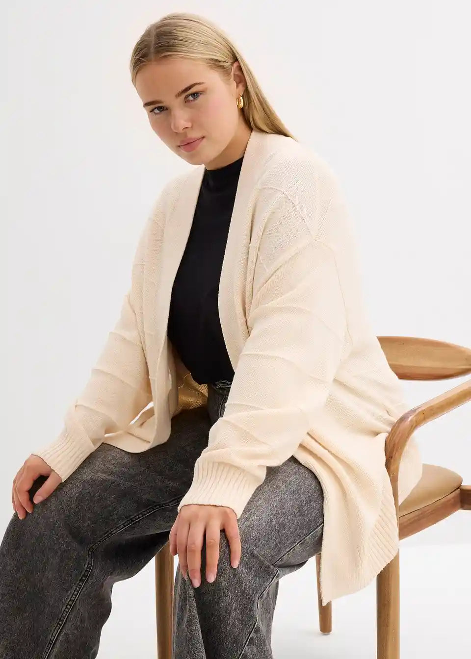 Široki pleteni kardigan s opuštenim ramenima i laganim strukturiranim uzorkom.