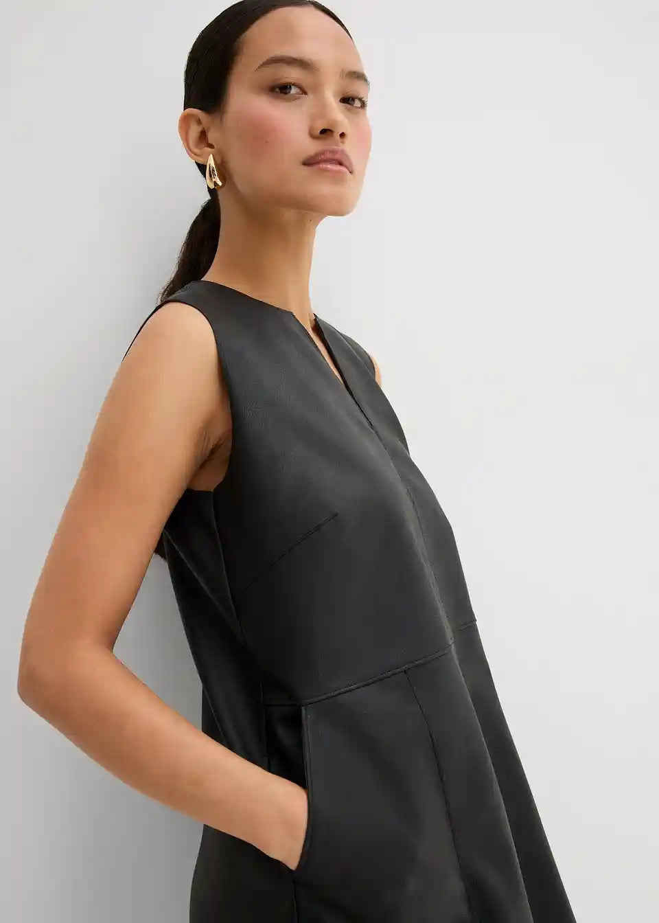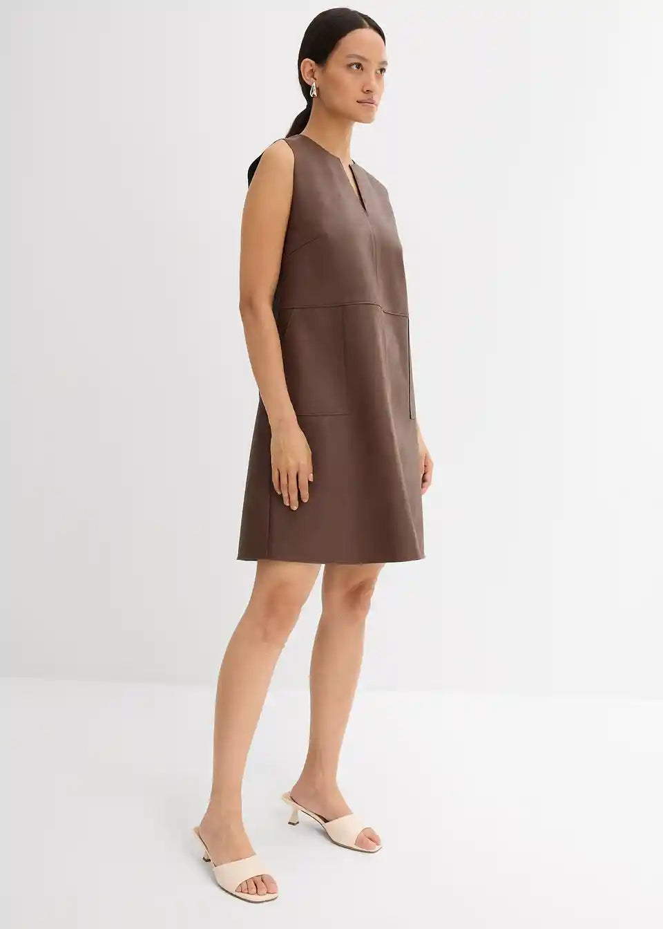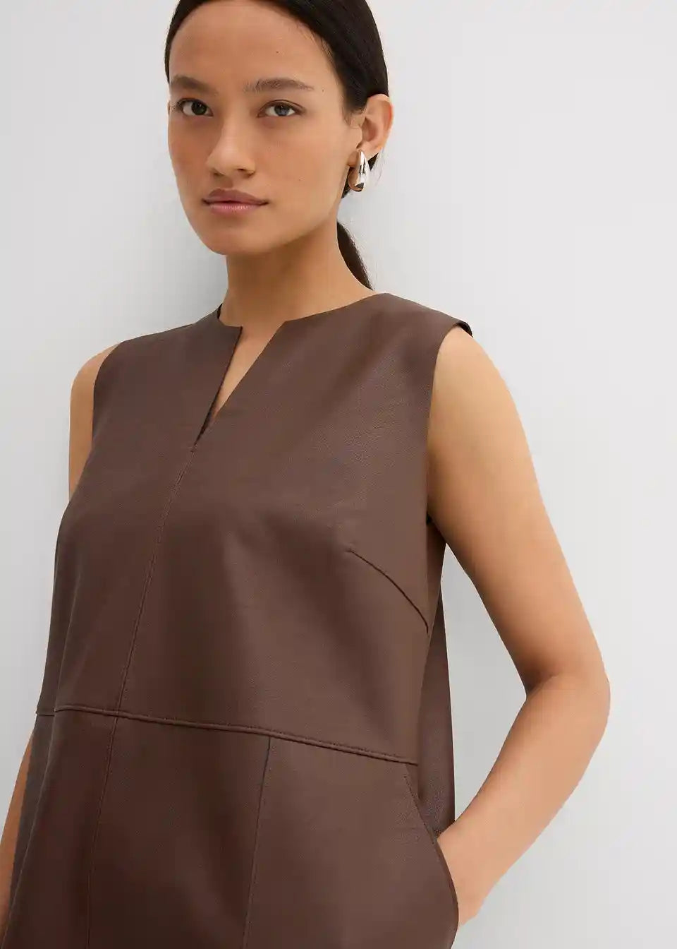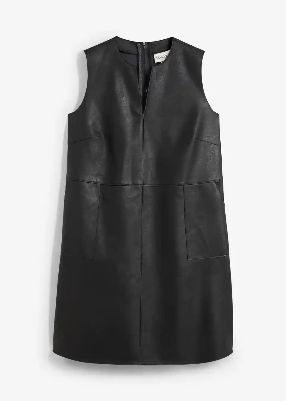 Haljina od imitacije kože bez rukava s tonalno usklađenim prošivima, našivenim džepovima sprijeda i otvorom sa zatvaračem straga