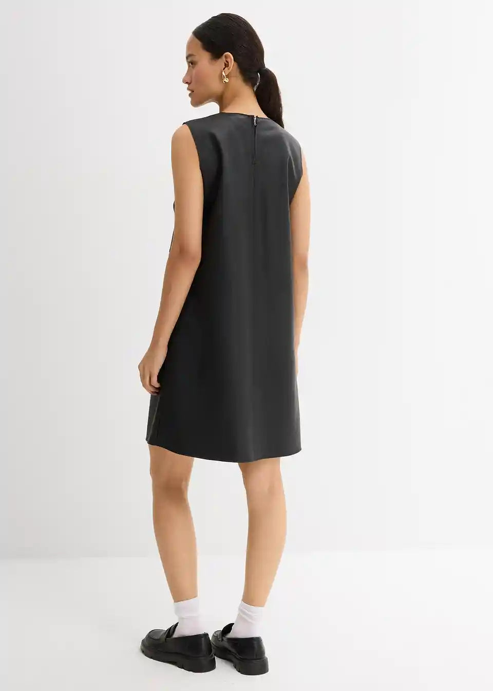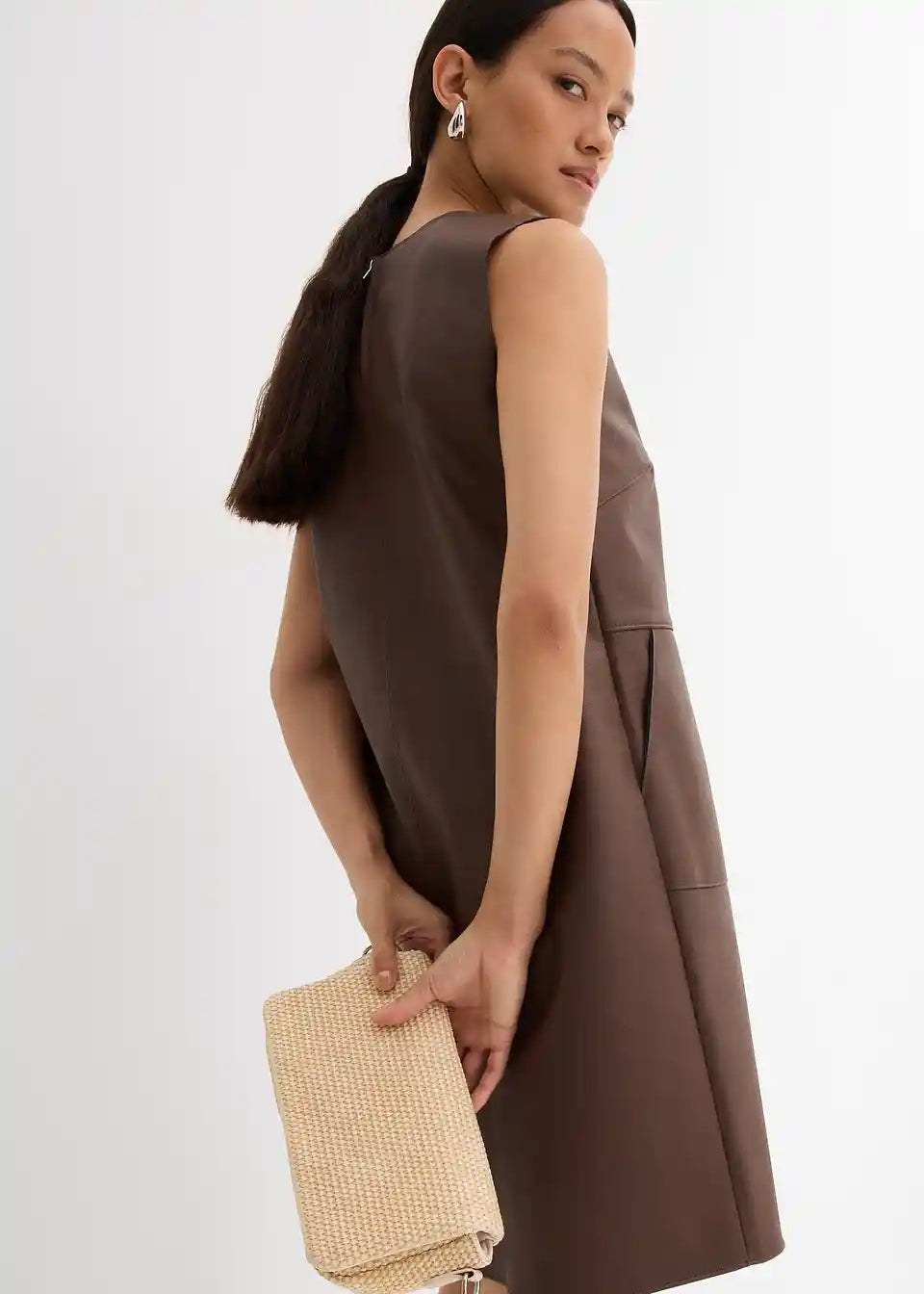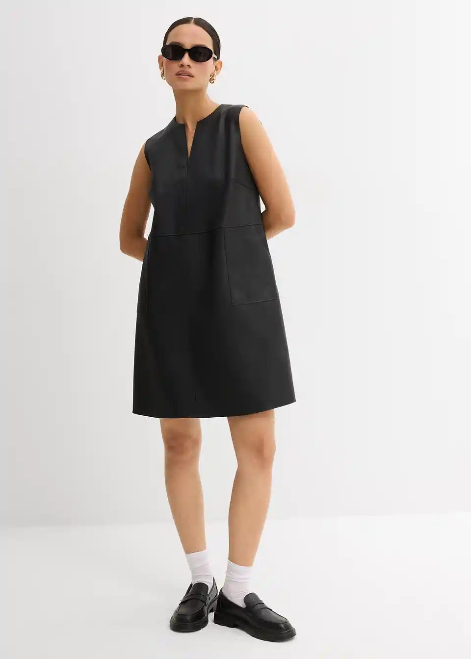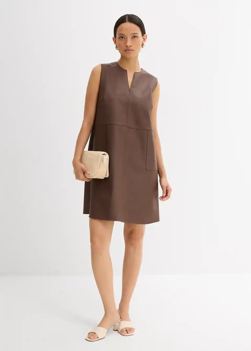 Haljina od imitacije kože bez rukava s tonalno usklađenim prošivima, našivenim džepovima sprijeda i otvorom sa zatvaračem straga
