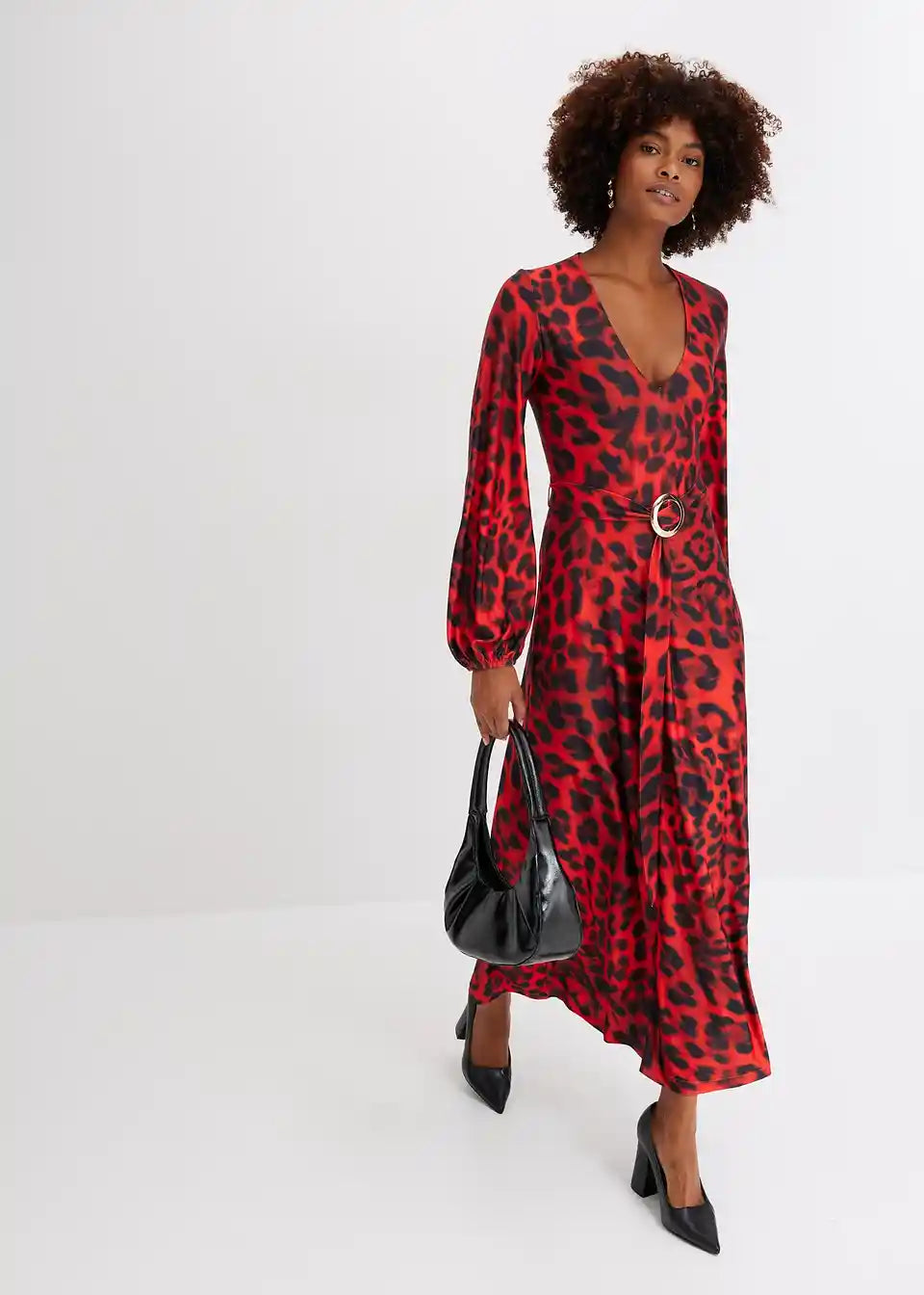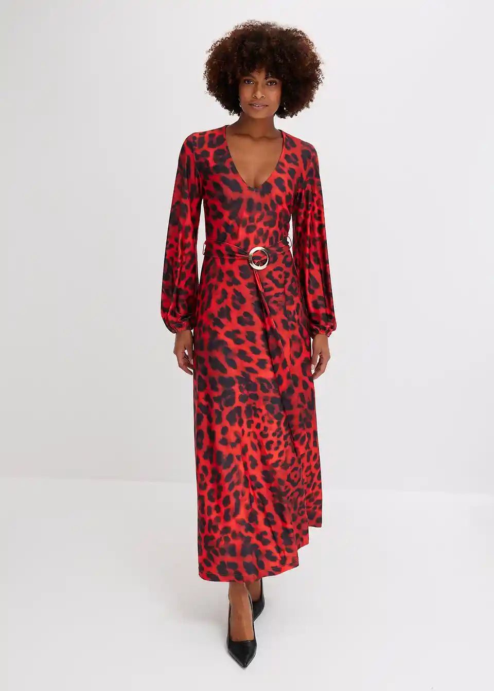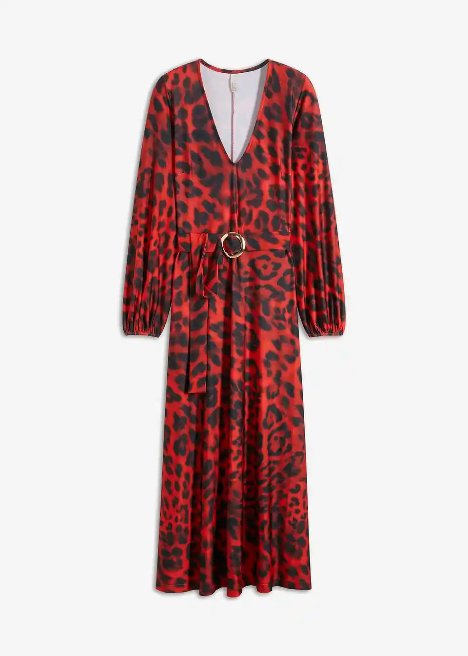 Moderna i ženstvena: maxi haljina od jerseya s pojasom u struku i metalnim prstenom.