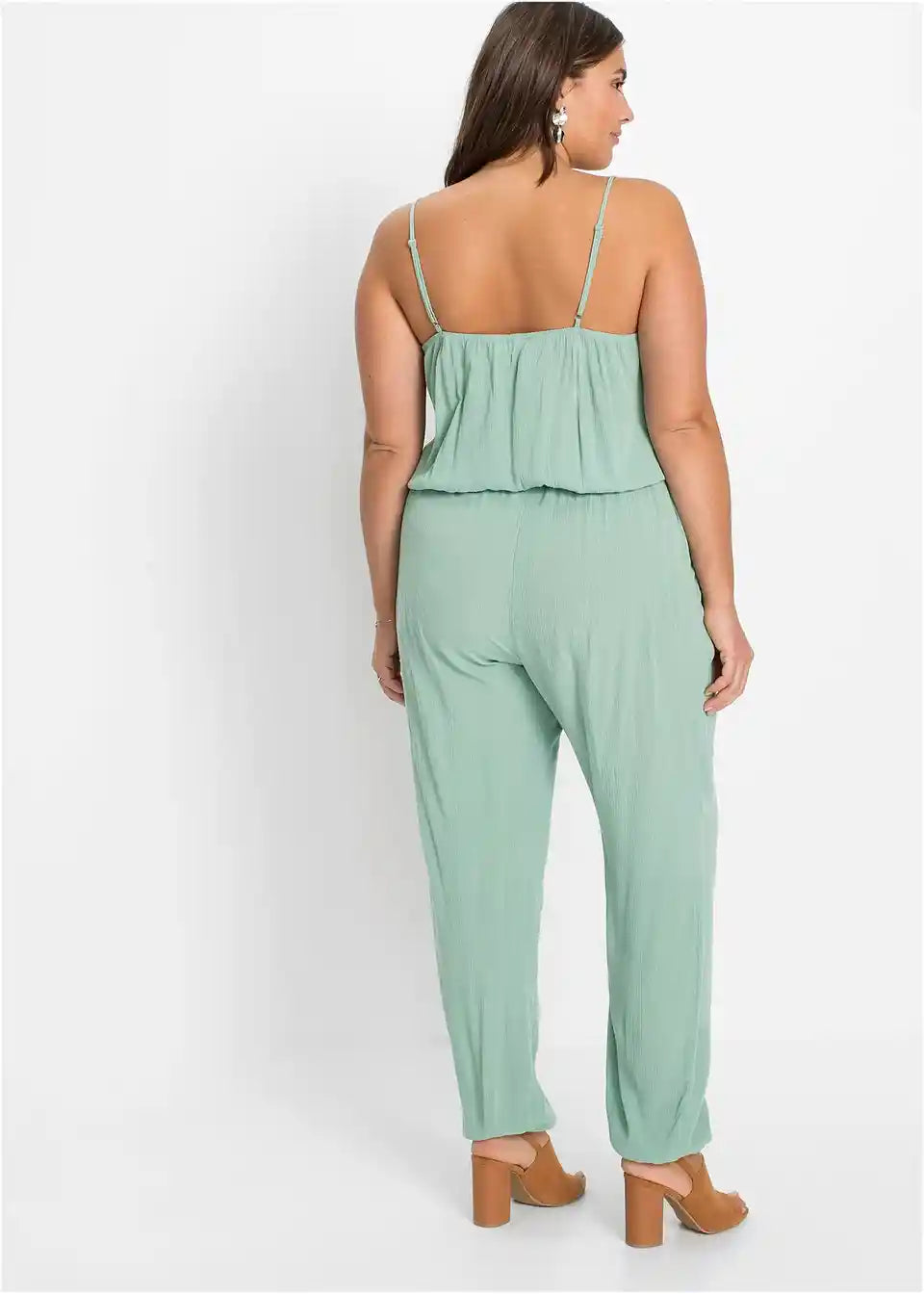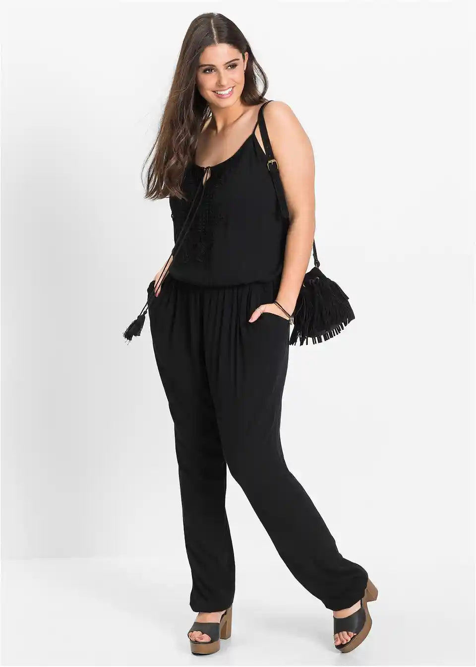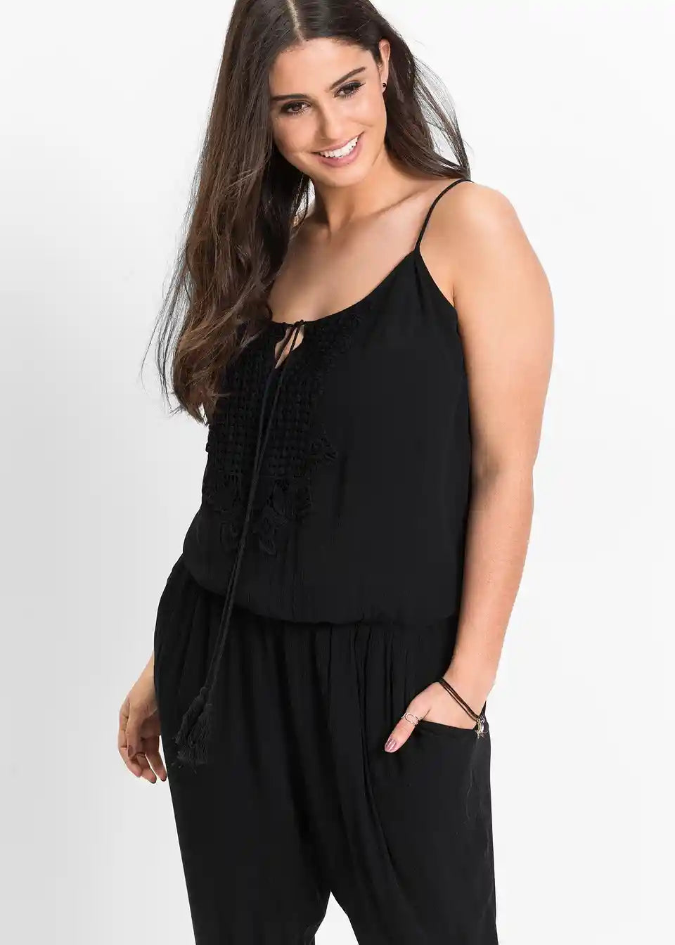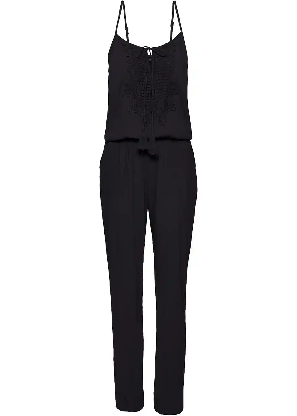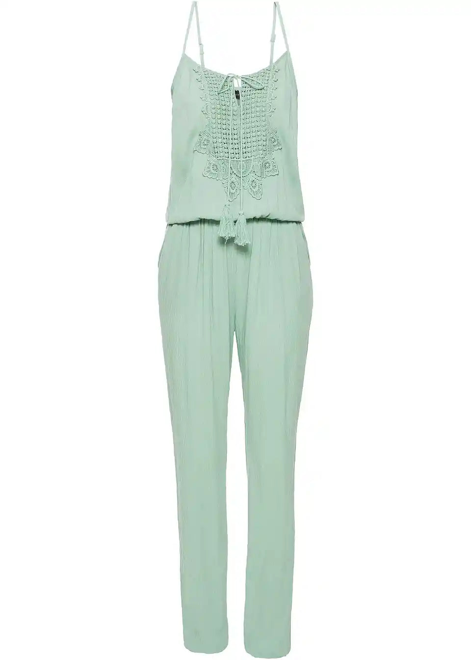 Prozračni kombinezon s čipkom na izrezu i vezicama za vezanje. Podesive naramenice, elastična traka u struku i na završetku nogavica, kao i na leđima, te bočni džepovi. Meko padajući tkanini od 100% viskoze s krep izgledom.