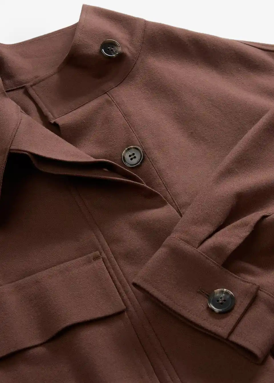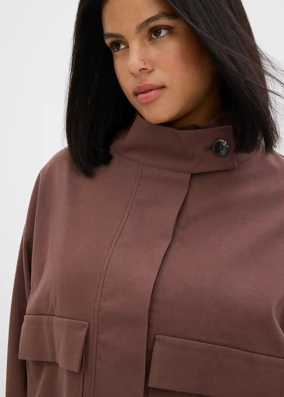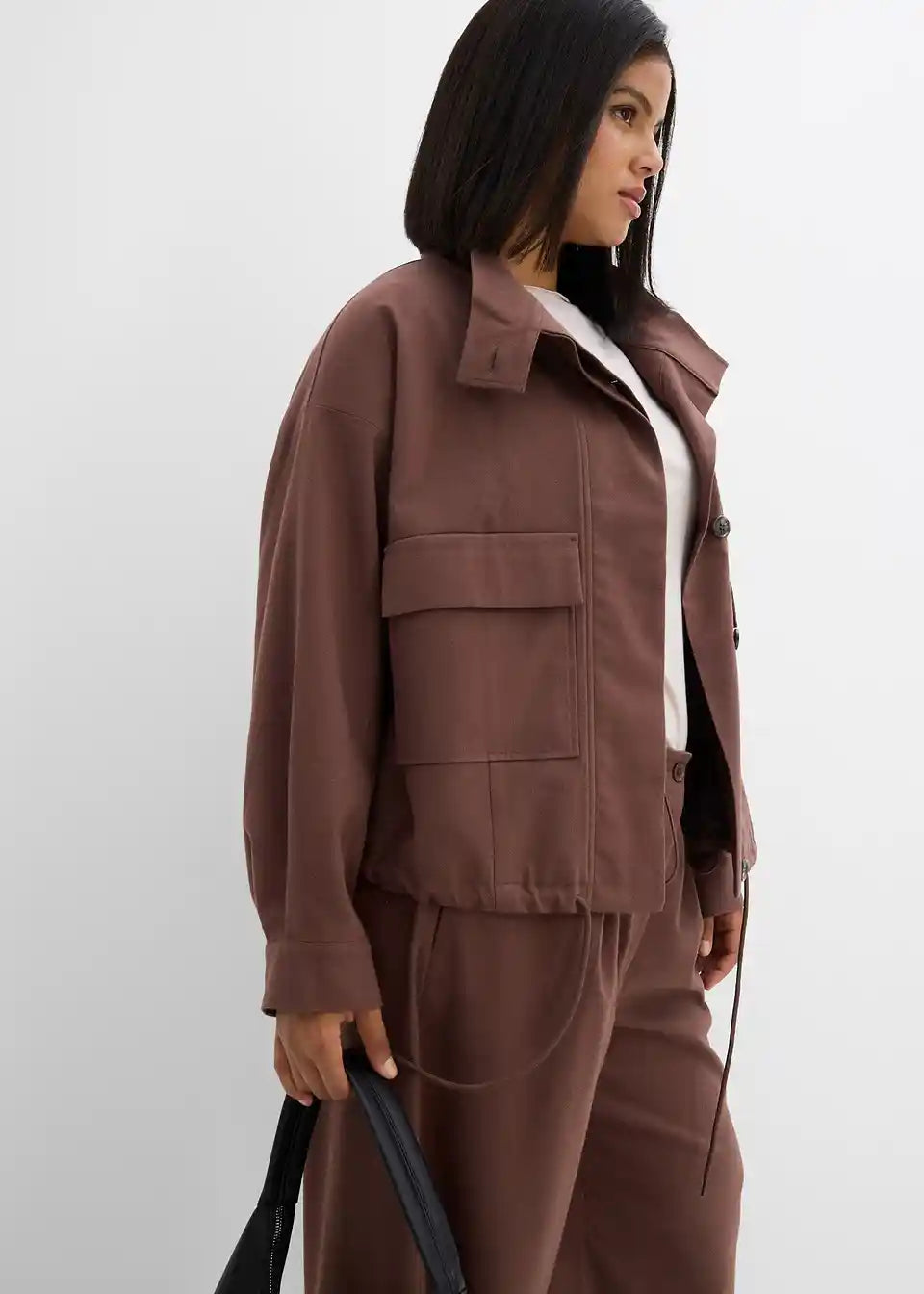 Ležerno krojena proljetno-jesenska jakna sa stojećim ovratnikom, jednostavnim našivenim džepovima i podesivim porubom