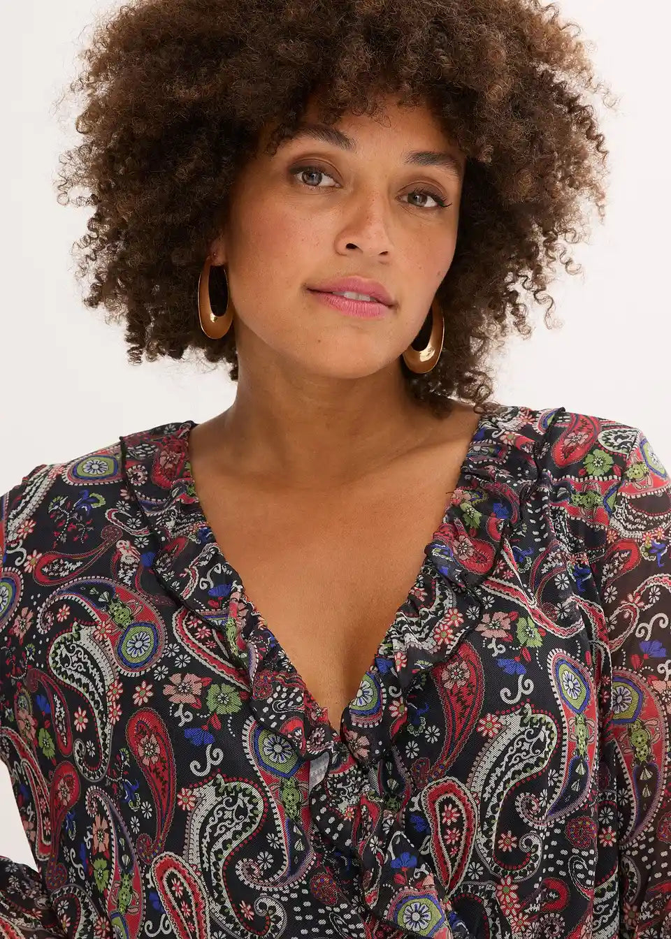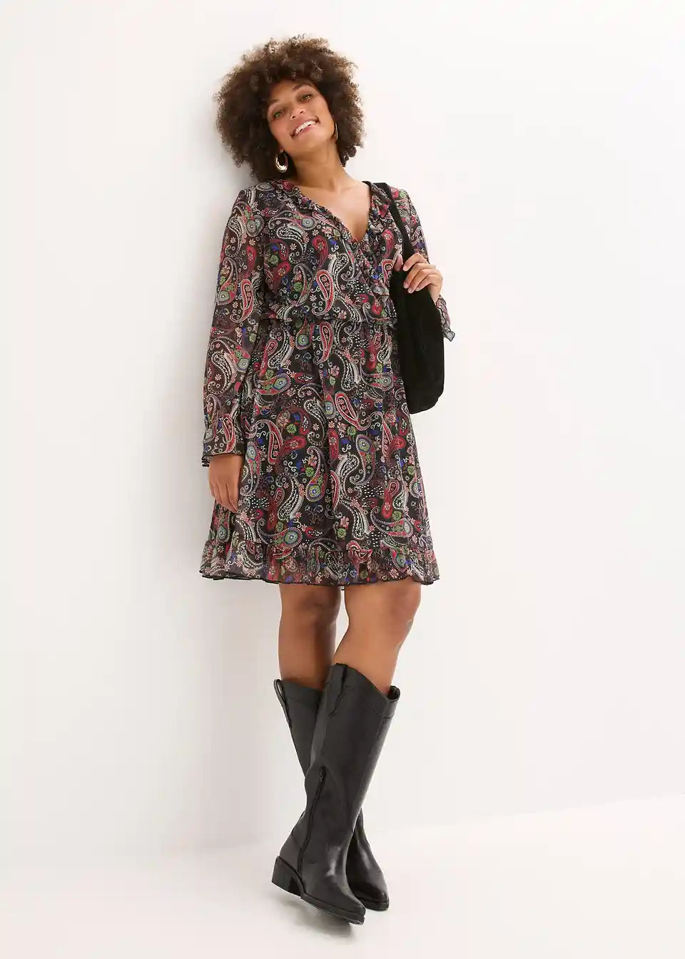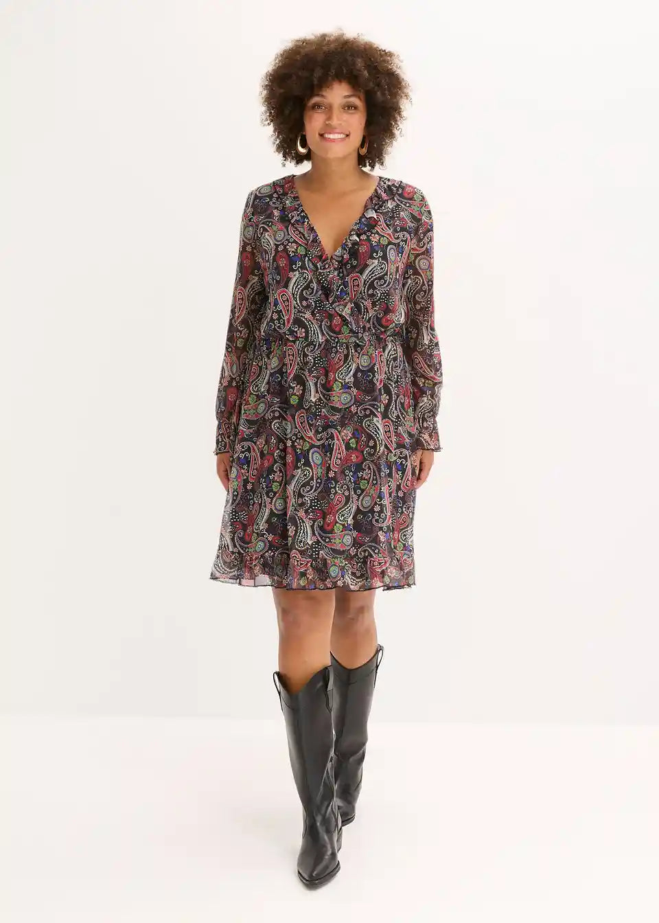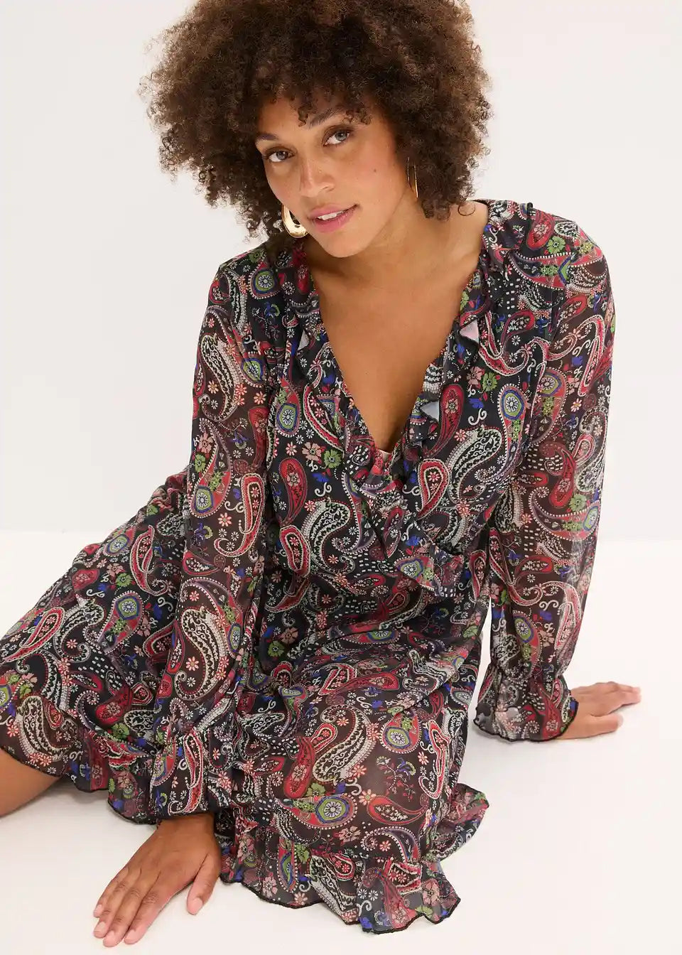 kratka haljina od mekanog mesha s malim volanima na završetku rukava i dekolteu