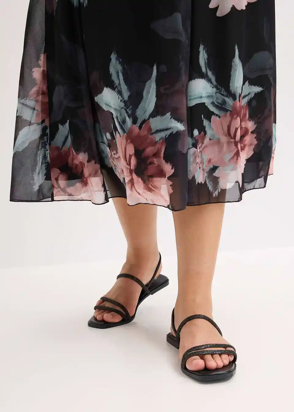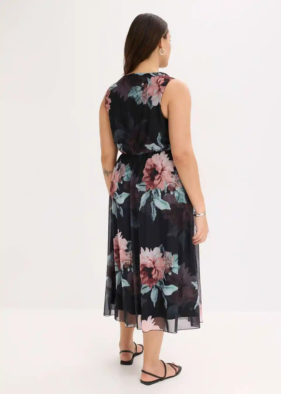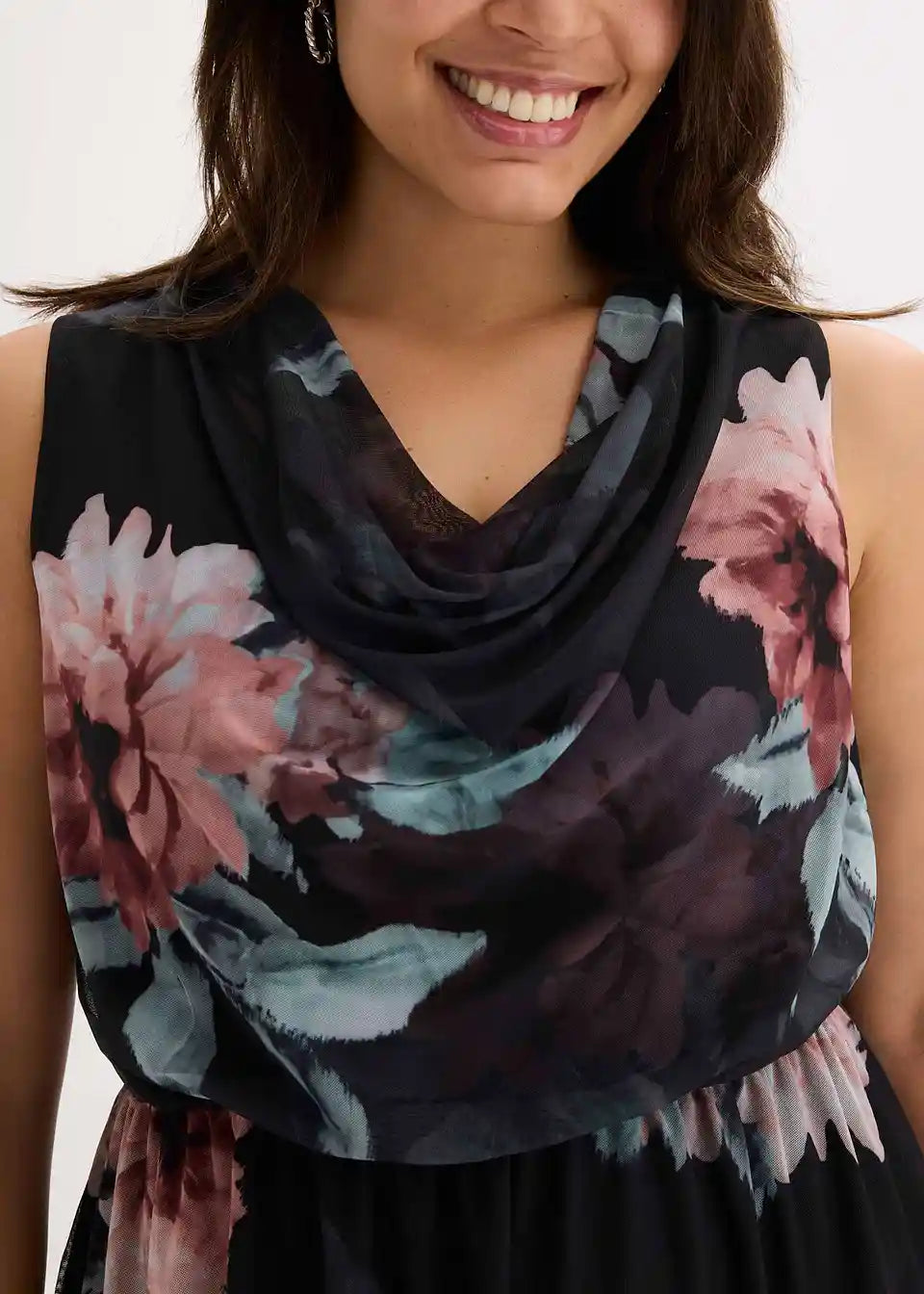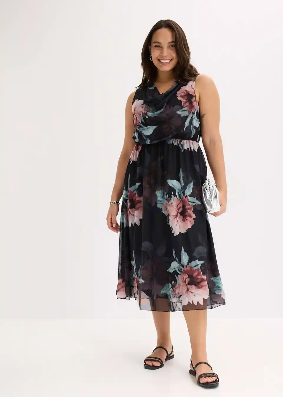 ženstvena midi haljina od mekog Mesh materijala s cvjetnim printom i vodopadnim izrezom sprijeda