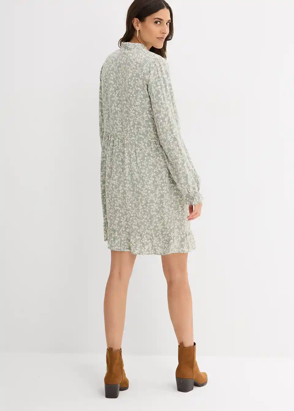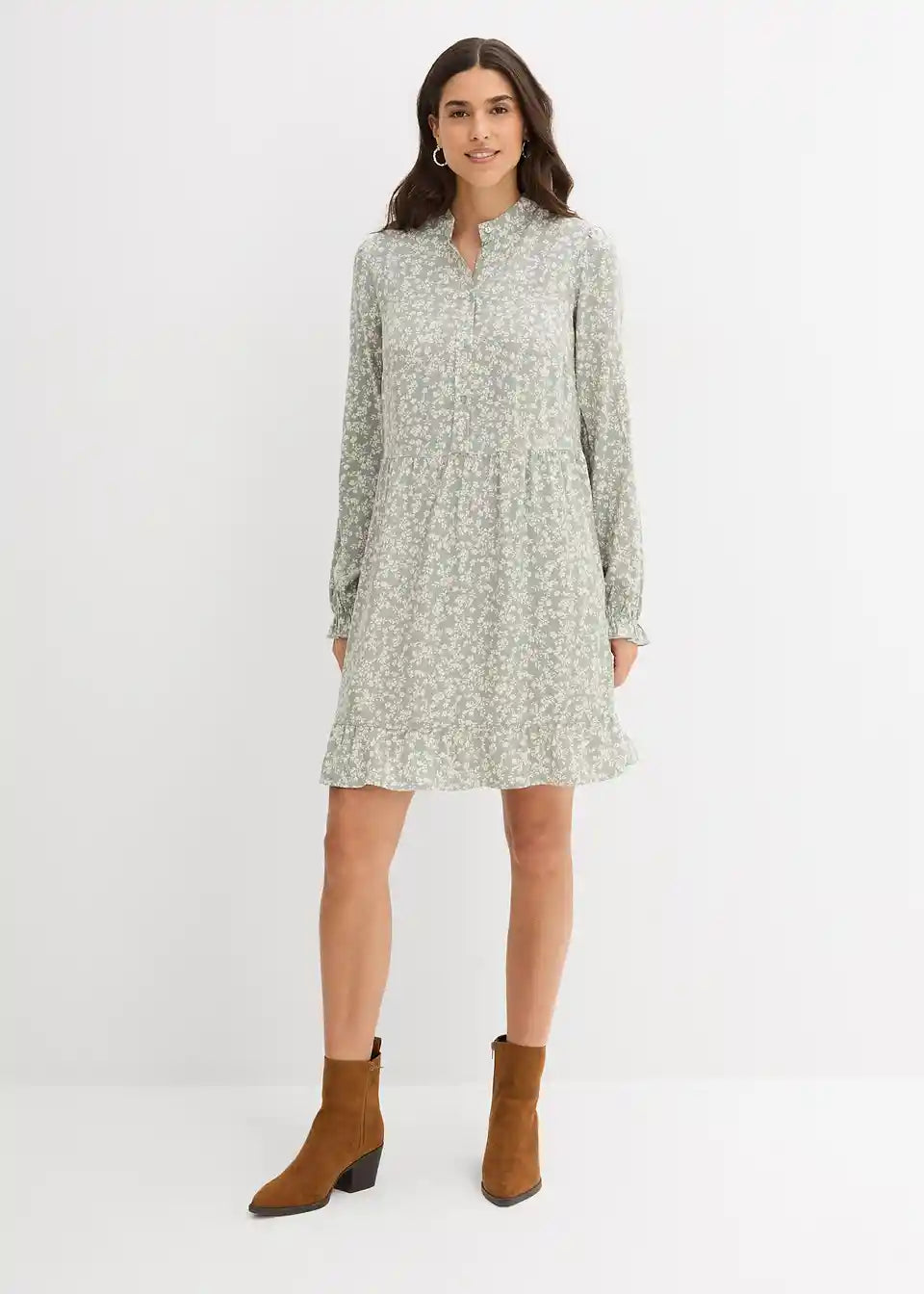 Široka i kratka haljina s puff rukavima i volančićima na završetku rukava