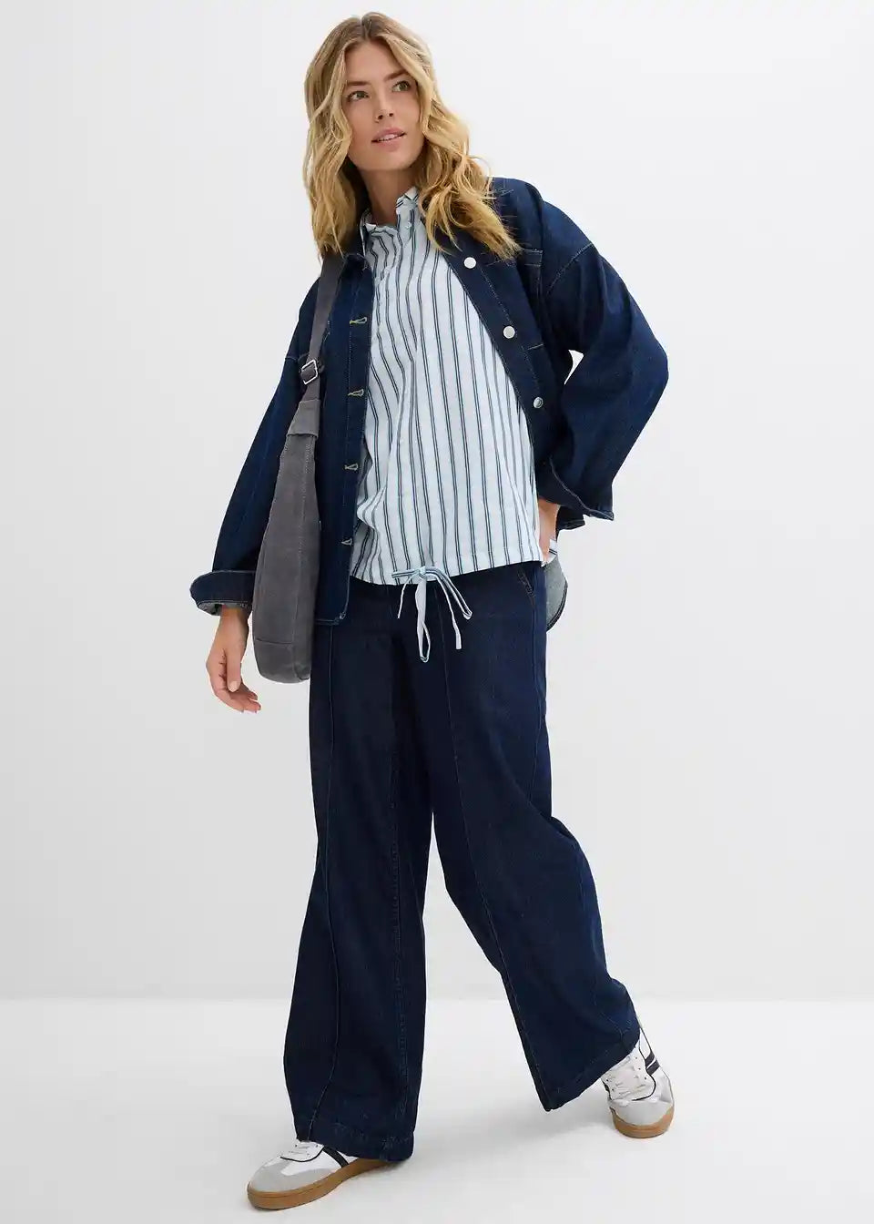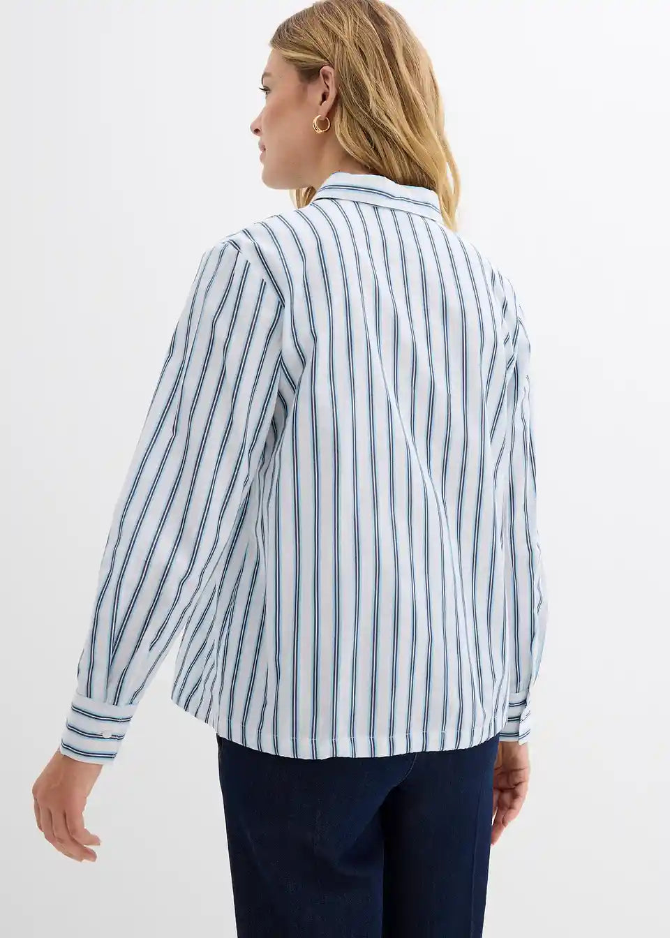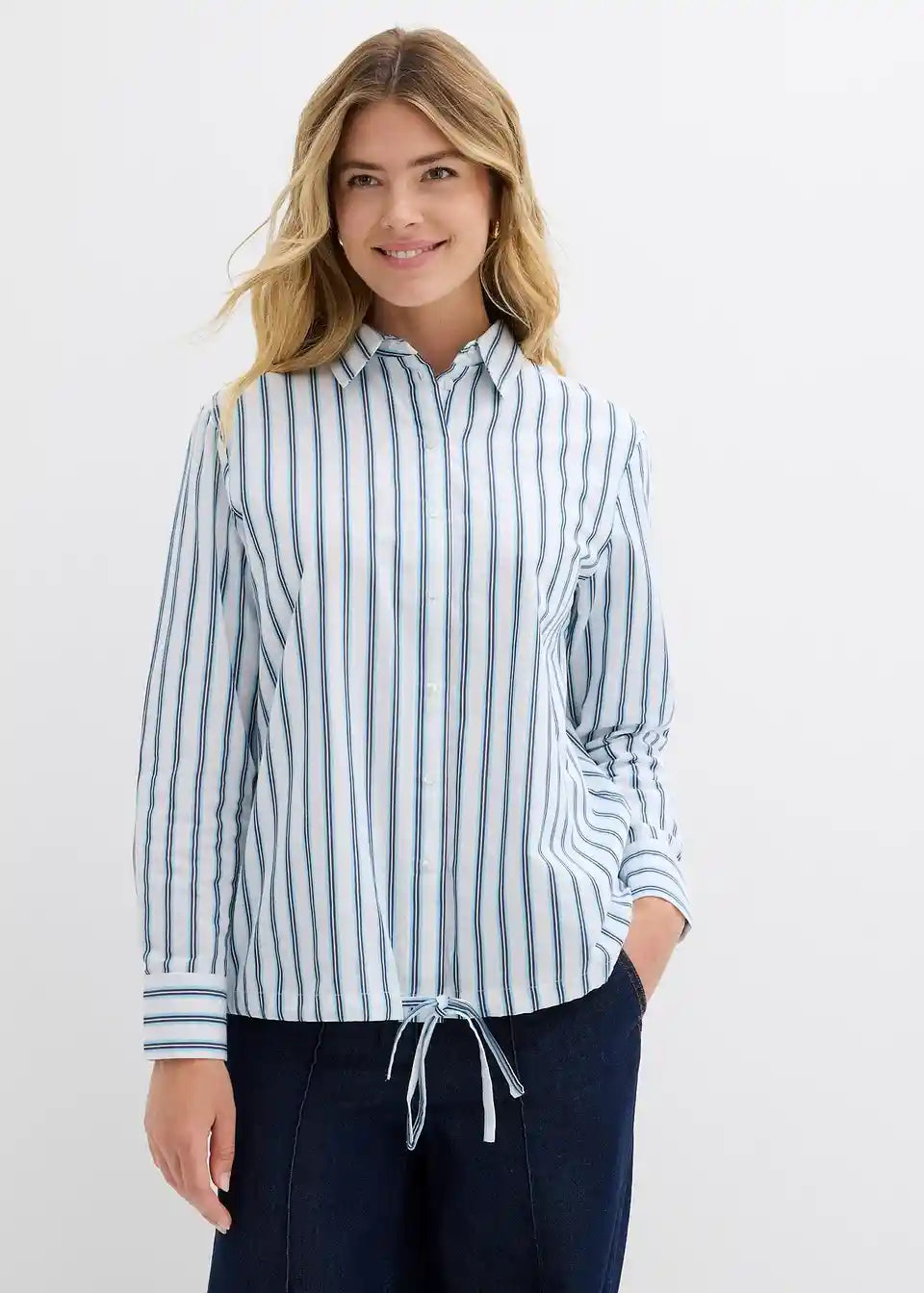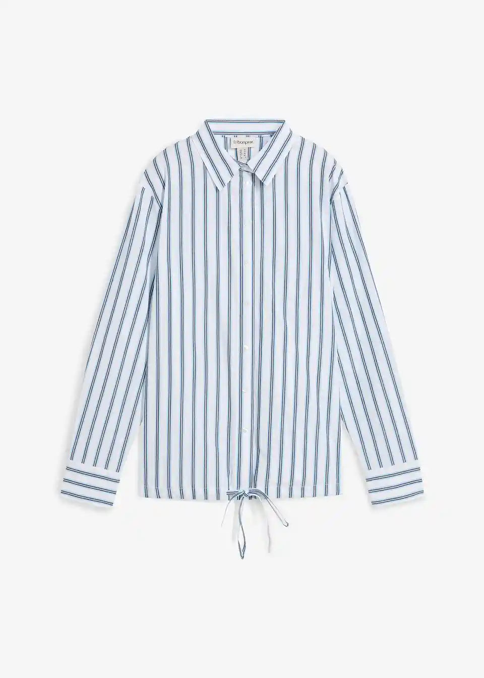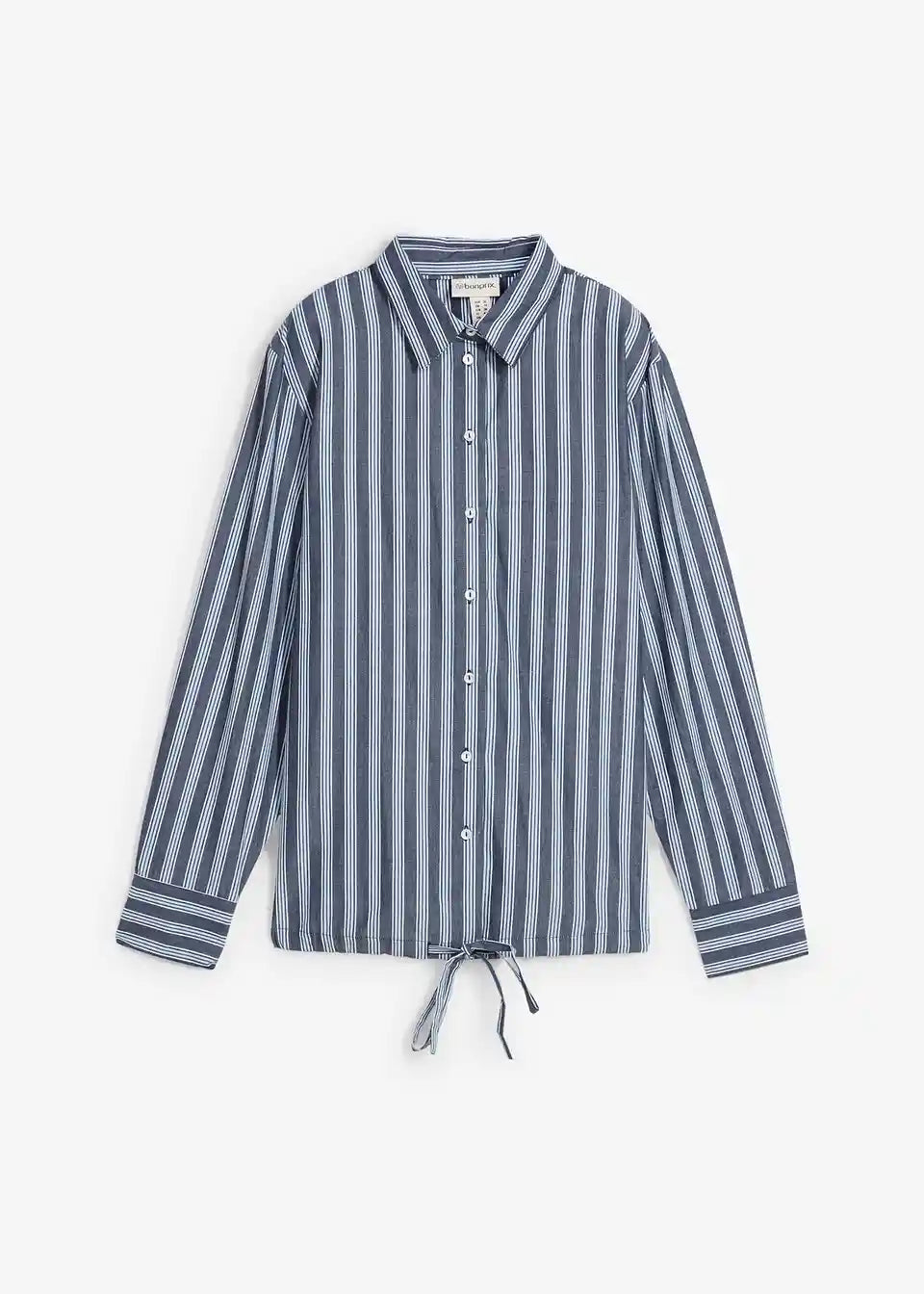 Prugasta bluza s prednjim kopčanjem na gumbe i vezicom u porubu.