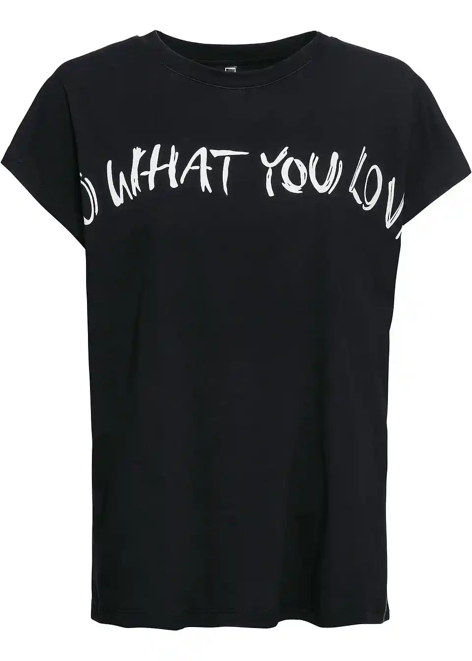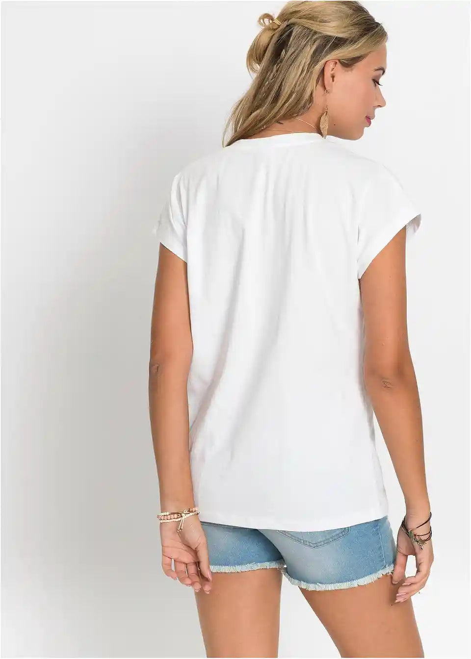Široko rezana ramena i opušten kroj daju ovoj majici efekt oversized izgleda. Hladan natpis u području prsa savršeno se uklapa u ovaj dizajn. Trendy šorc s izderanim rubovima ili uske traperice s efektima uništavanja dodatno naglašavaju ležernost ovog modernog modela. Stilistički kontrast postiže se kombinacijom mini suknje i platforma-sandala od drveta.