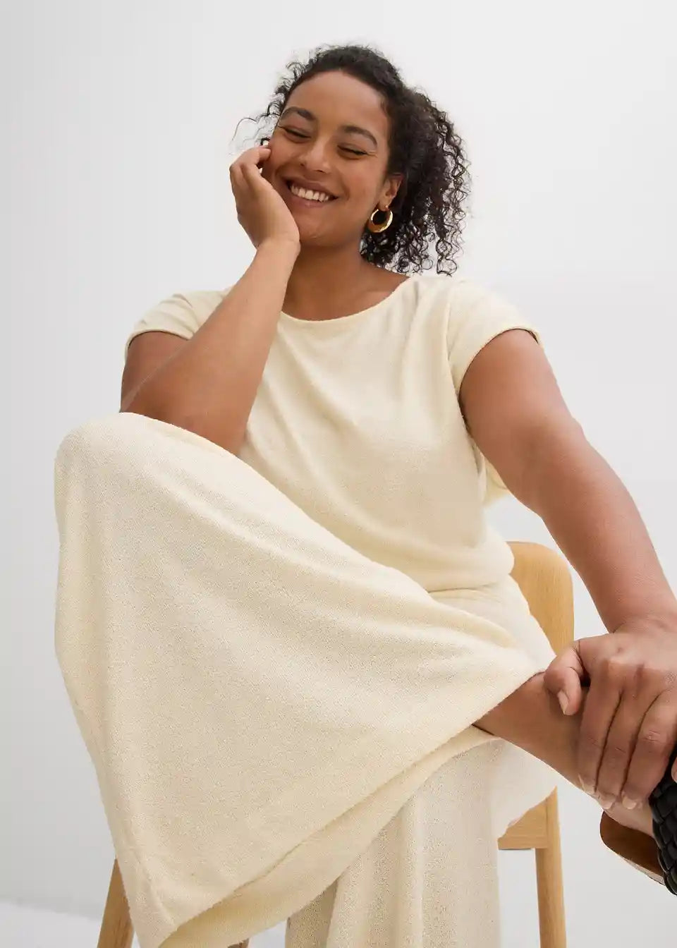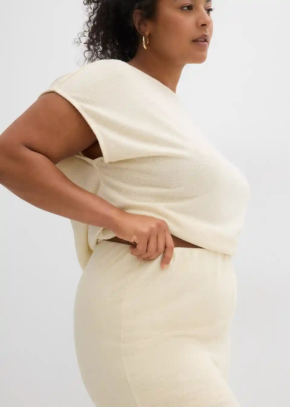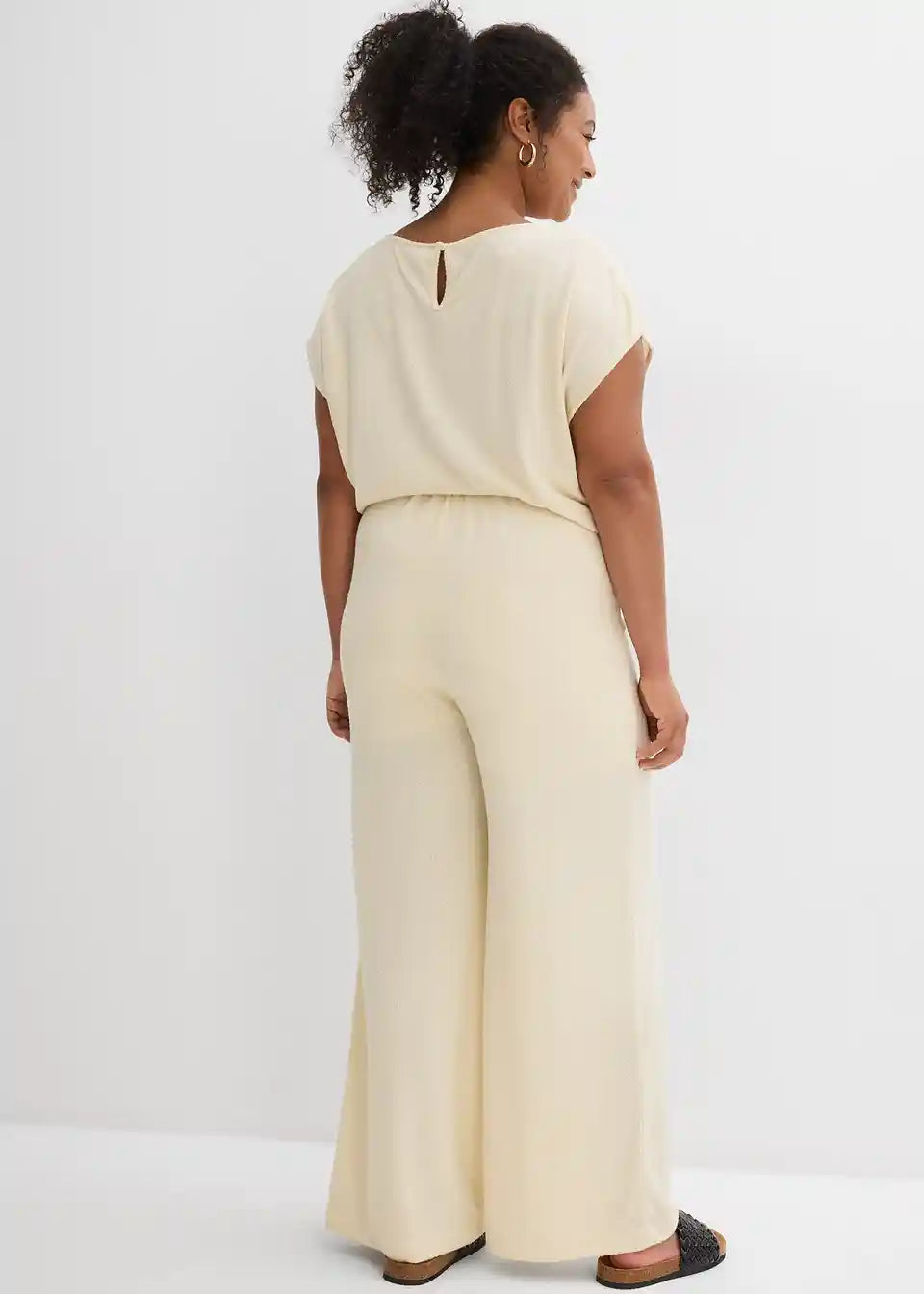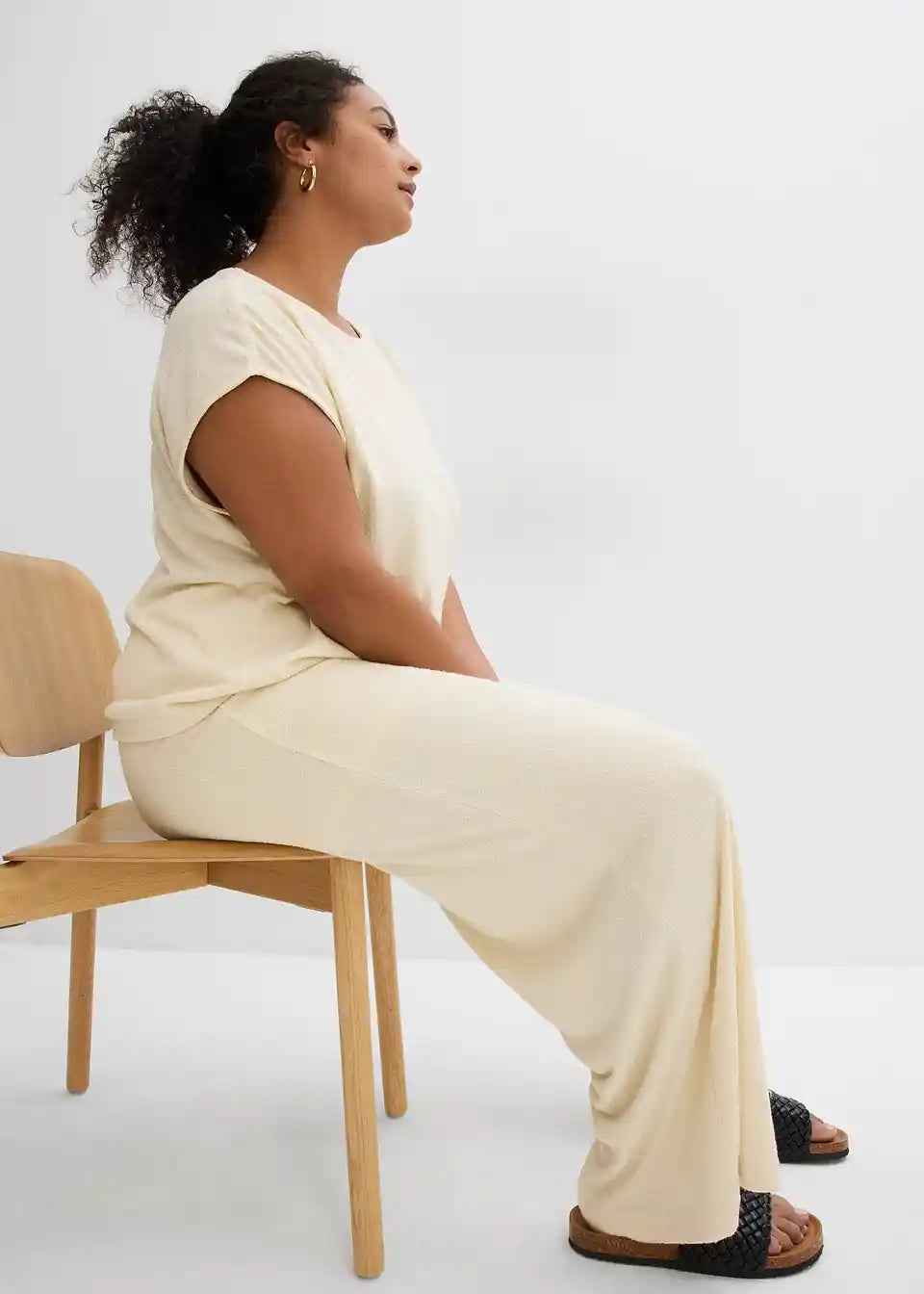 Široko krojene hlače s visokim elastičnim pojasom. S laganom podstavom od mekane viskoze.