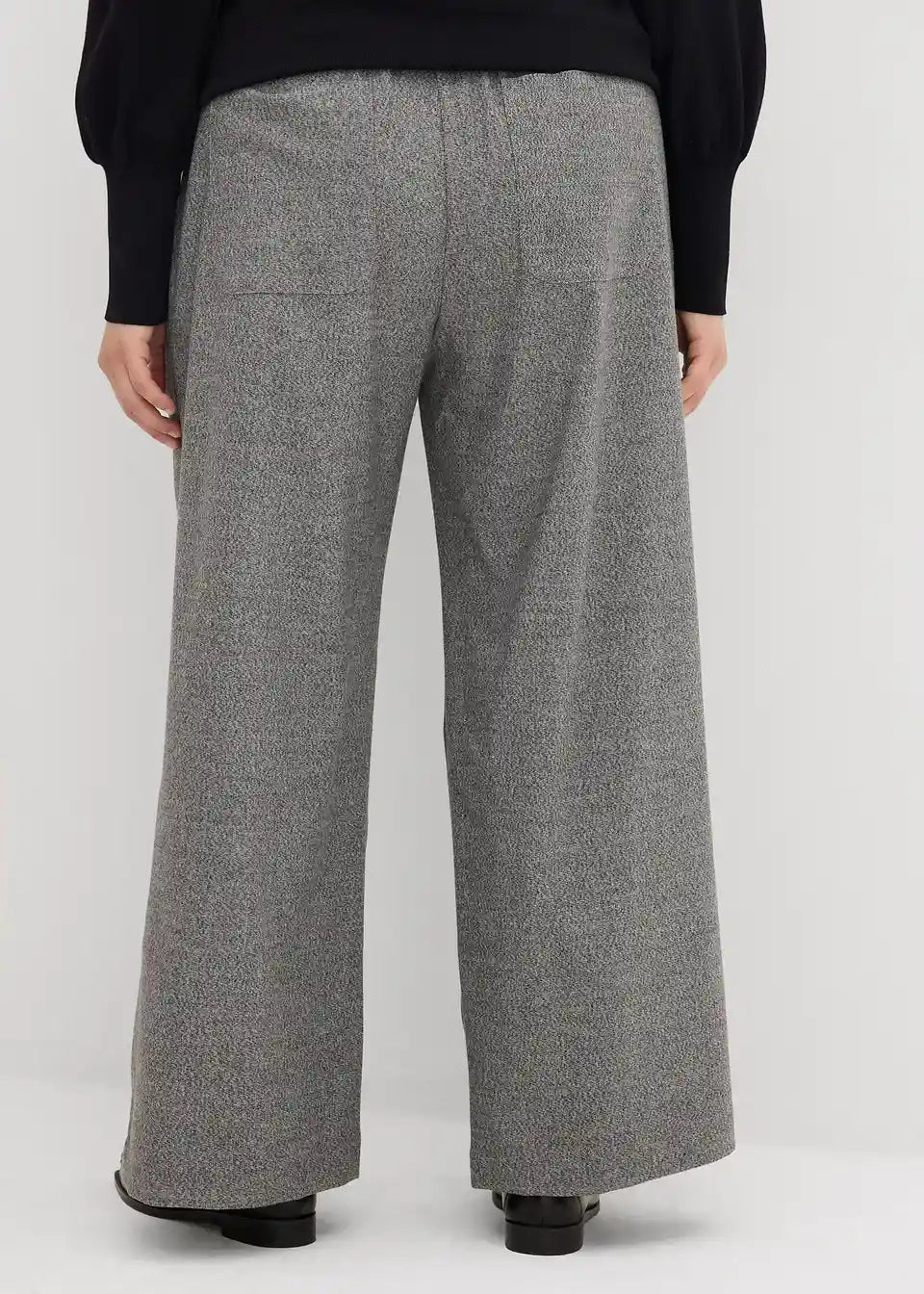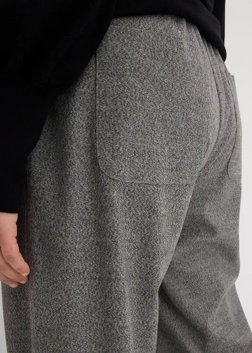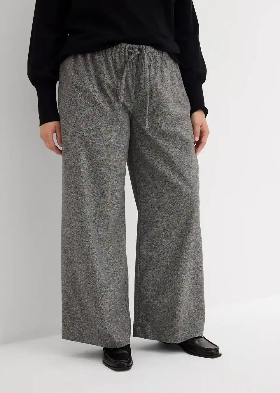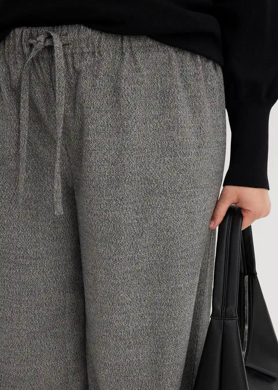 Široko krojene hlače u pokroju soli i papra s vezicom u pojasu i bočnim džepovima.