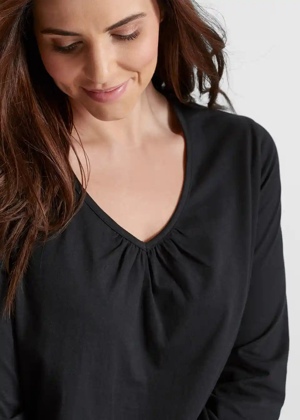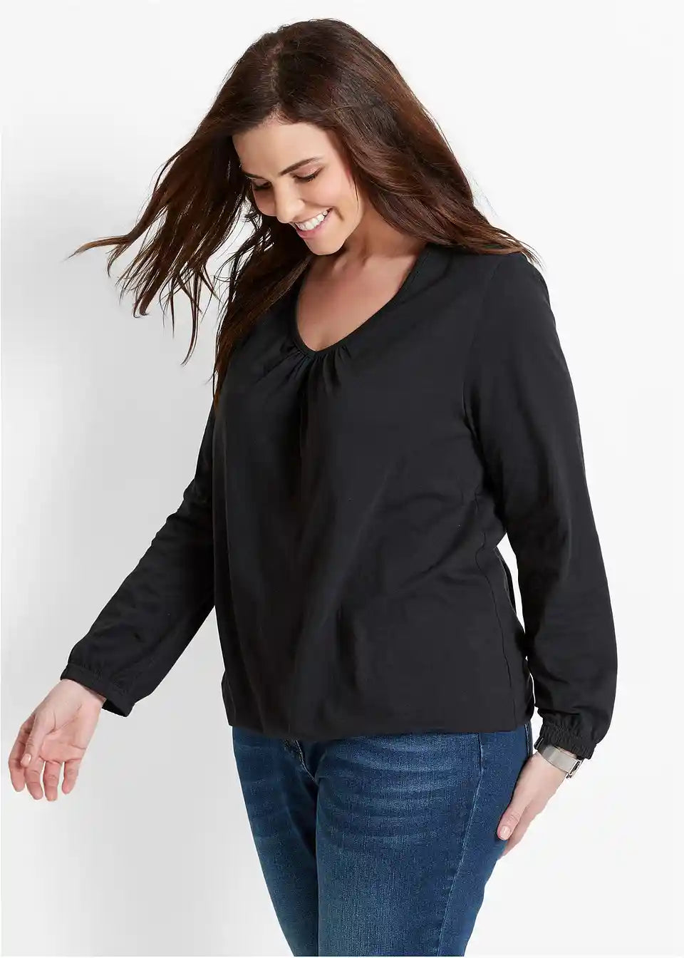 Ova praktična majica s dugim rukavima lijepi je osnovni komad za svakodnevnu upotrebu. V-izrez s laganim naborima daje lijep naglasak ovom inače jednostavnom modelu brenda bpc. Majica s dugim rukavima, porubom i elastičnim završetkom na rukavima pruža najbolju udobnost nošenja. Raznovrstan izbor boja omogućuje nositeljici razne mogućnosti kombiniranja outfita.