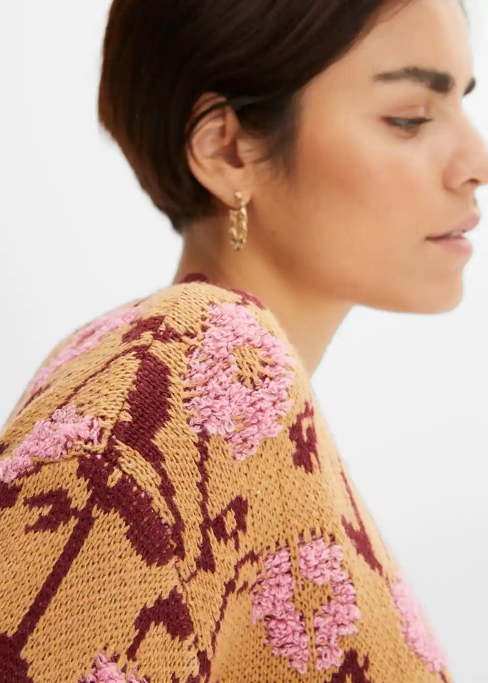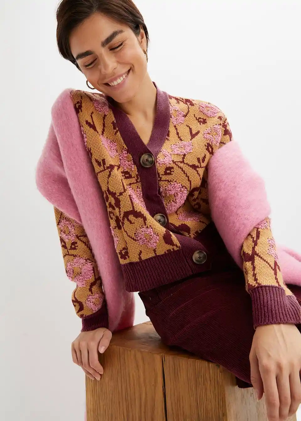 Pletena jakna s cvjetnim uzorkom, dugmadima i V-izrezom
