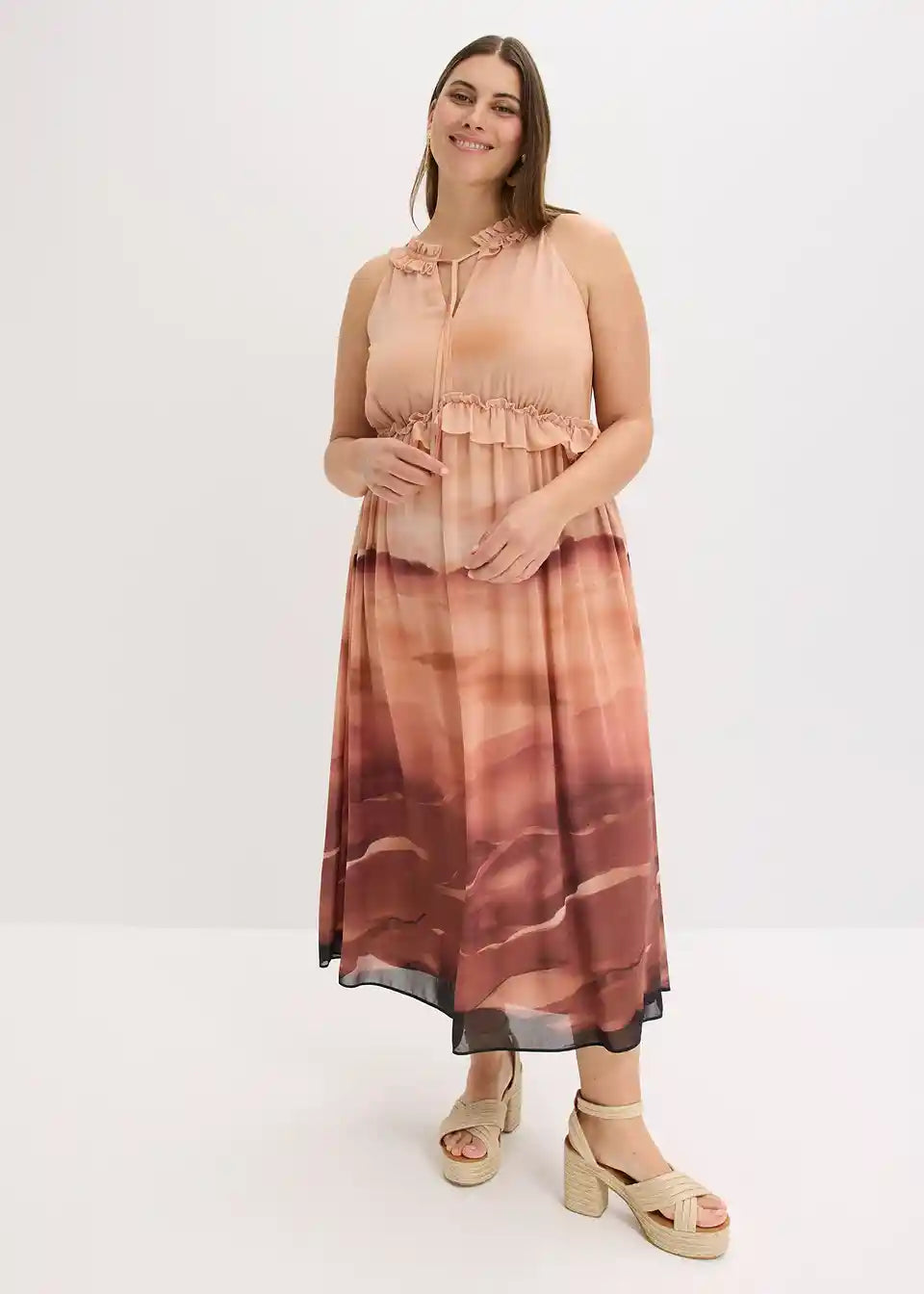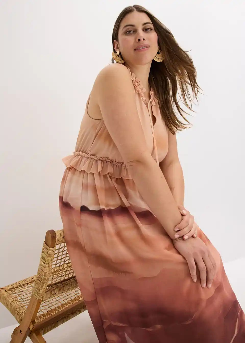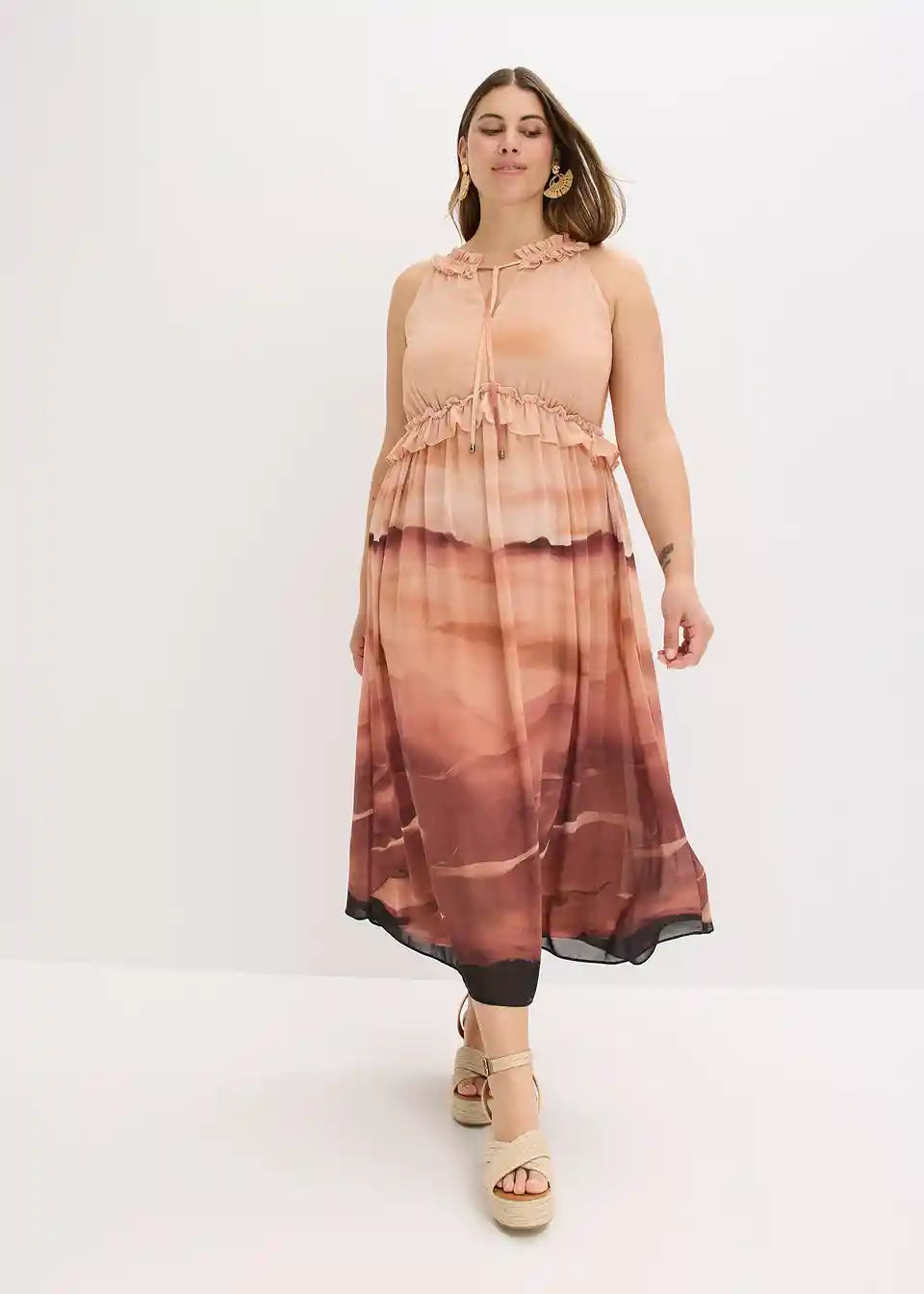 moderna printana Chiffon haljina midi dužine s detaljima volana na izrezu i u struku