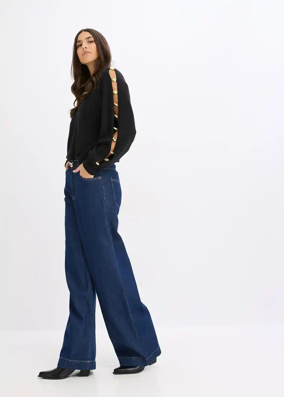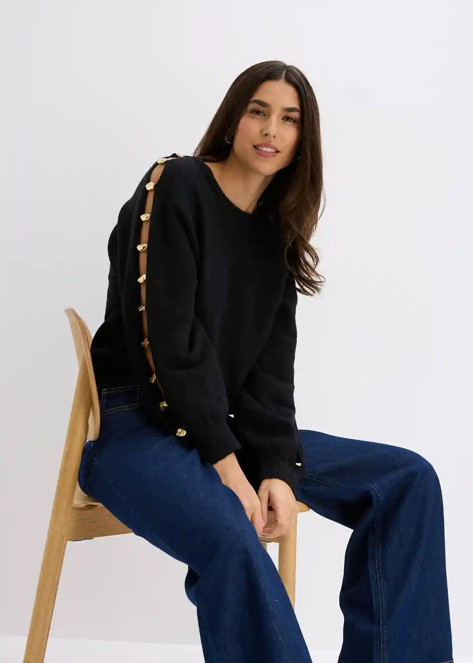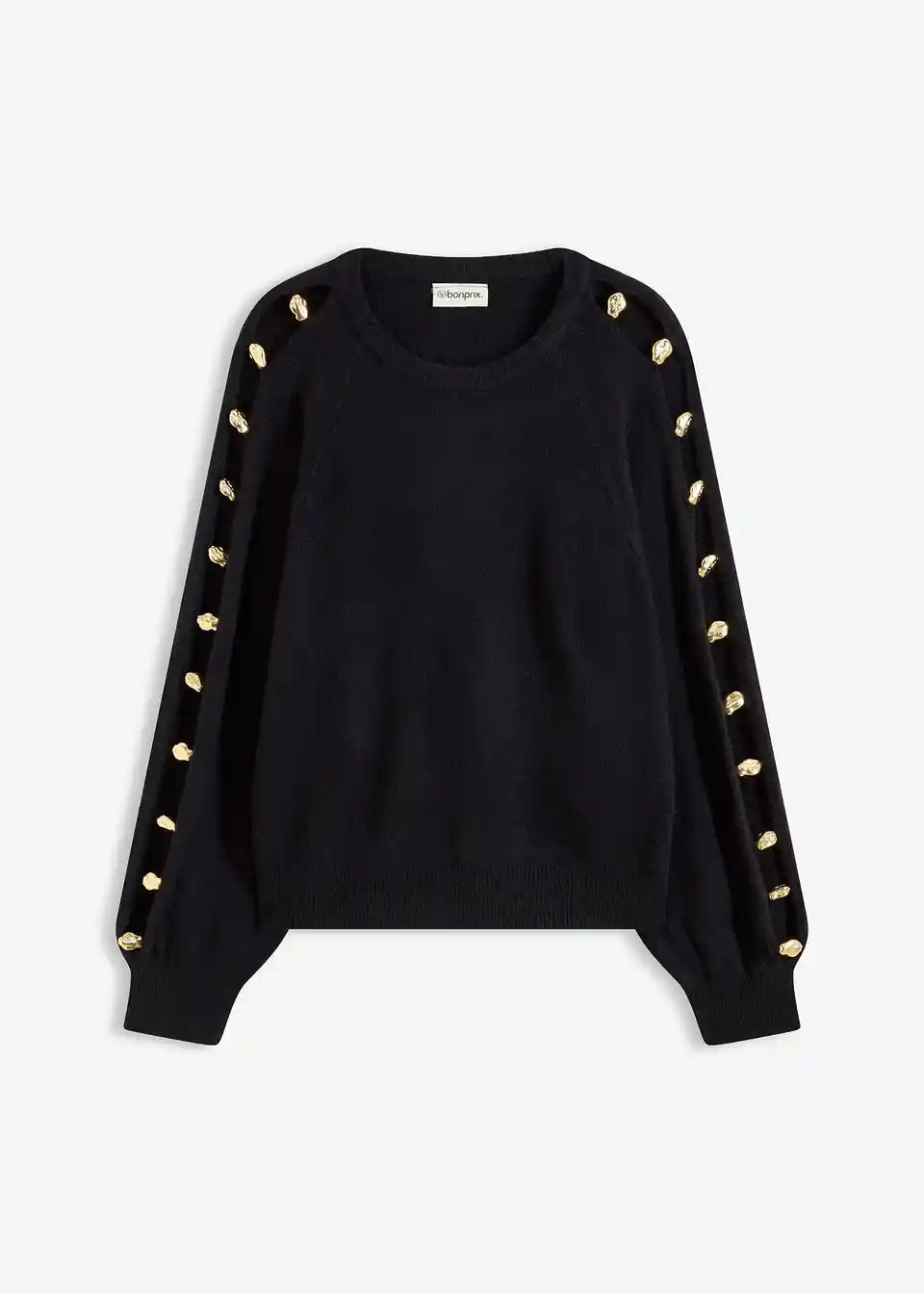 Pulover s okruglim izrezom i dugim rukavima s prorezom i aplikacijom od zlatnih metalnih perli