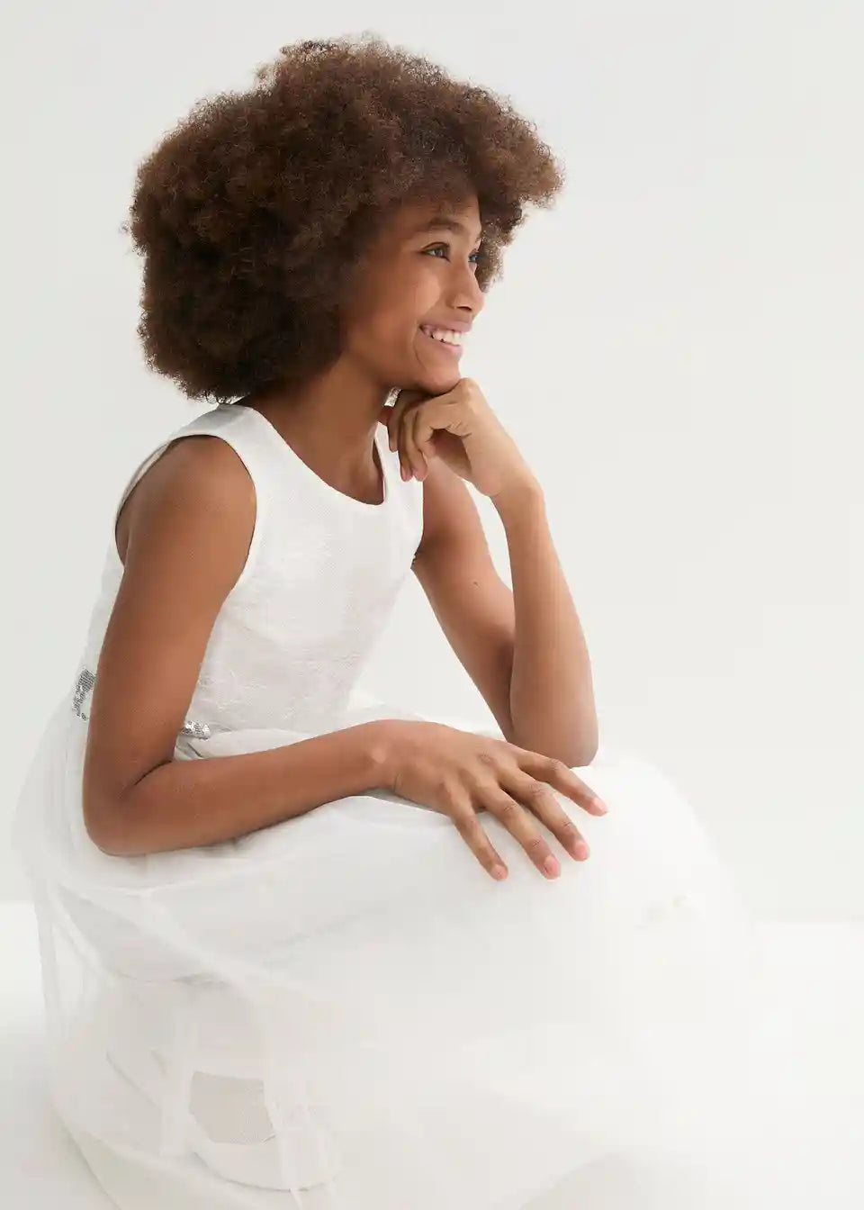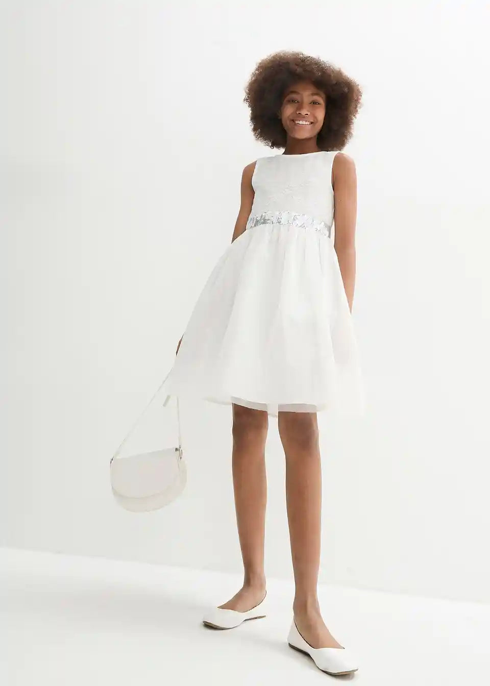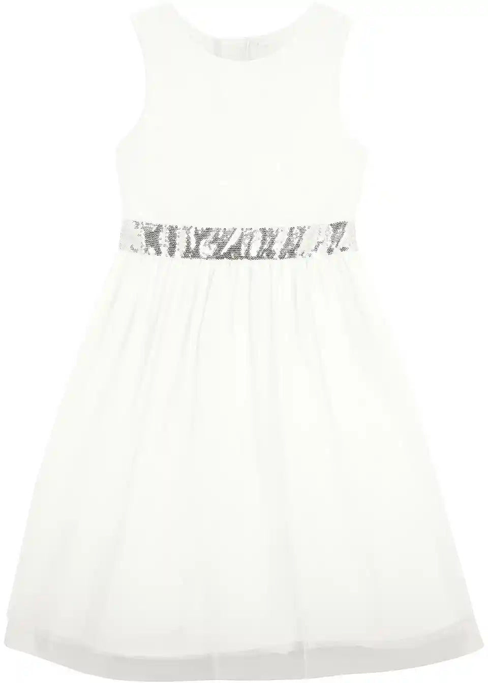 Bajkovita tila haljina s čipkom na gornjem dijelu. Umetak sa šljokicama na struku posebno upada u oči. Prava haljina za princeze.