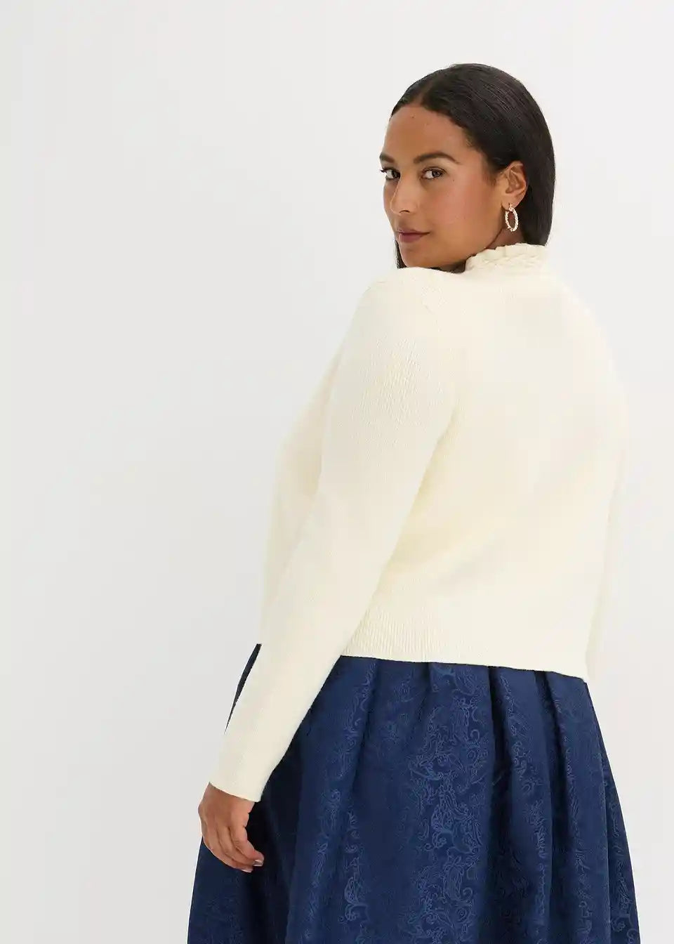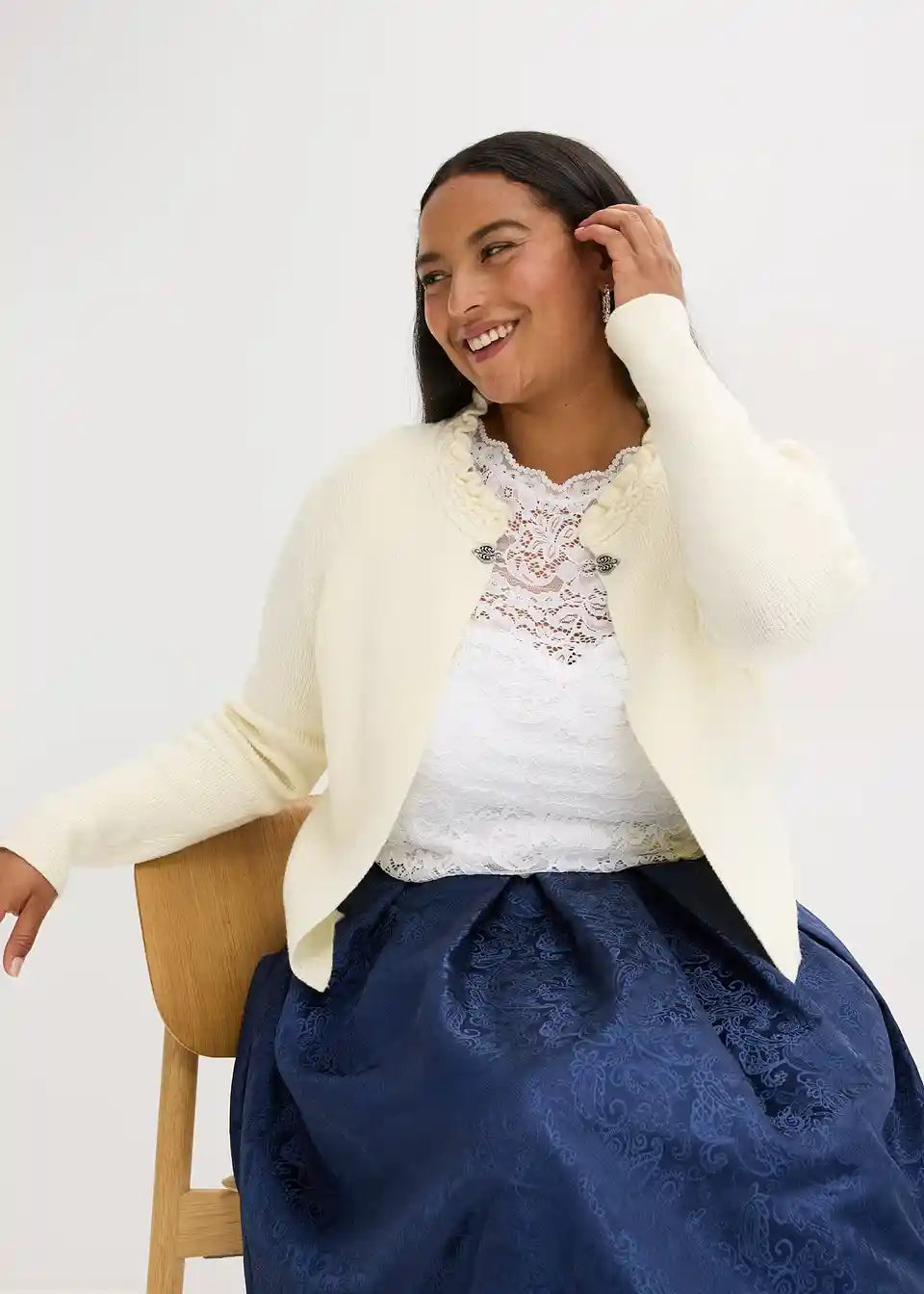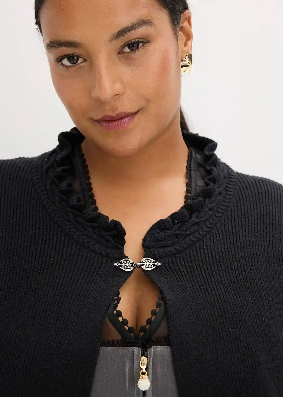 Modern i ženstven: Tradicionalni pleteni kardigan s uzorkom pletenica na izrezu i dekorativnim kopčanjem