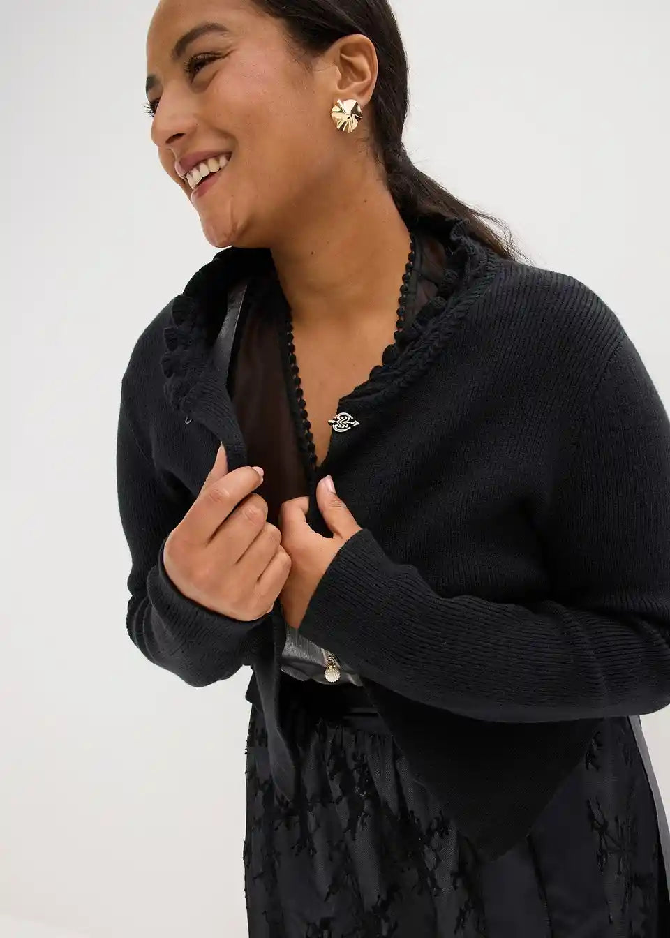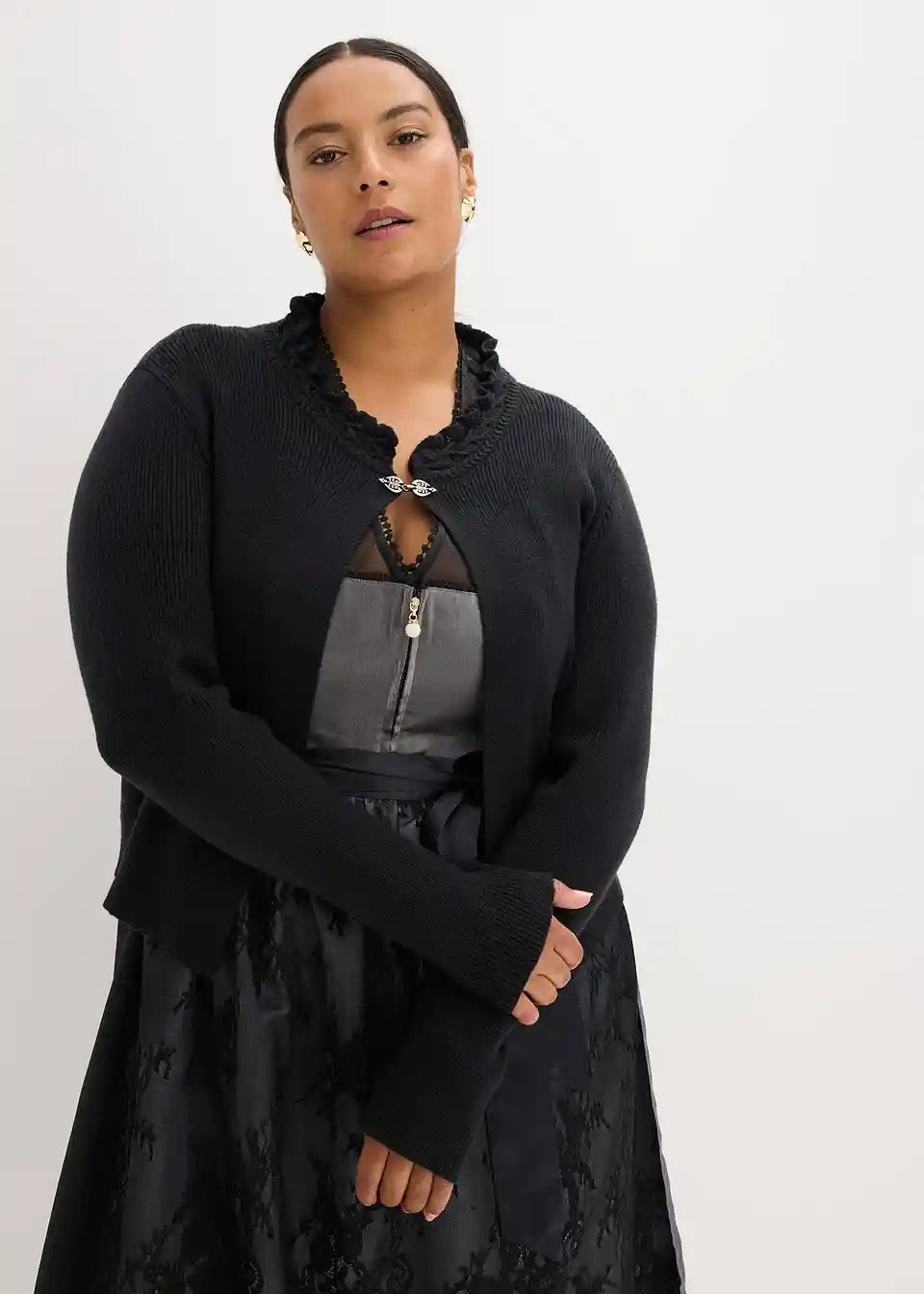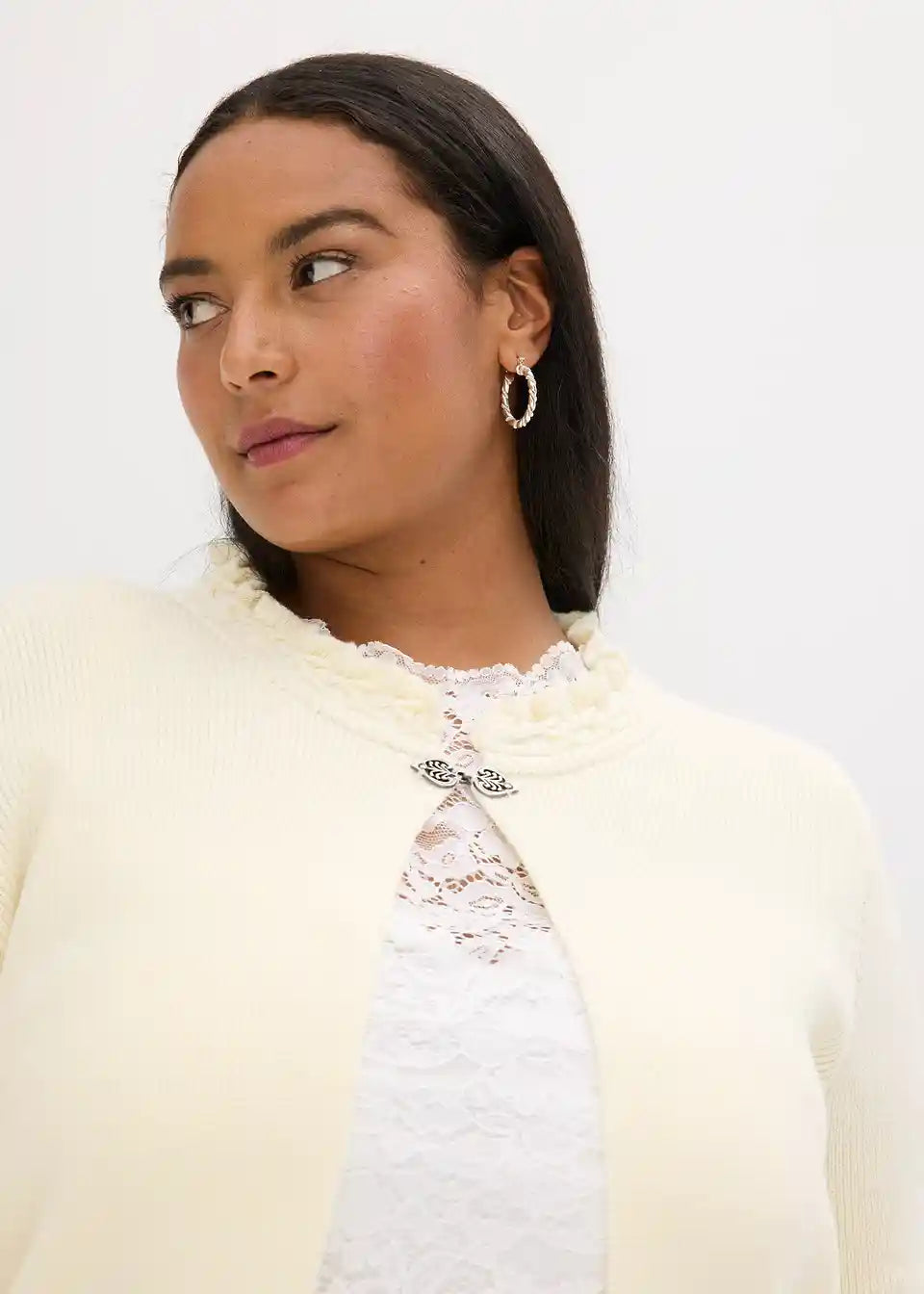 Modern i ženstven: Tradicionalni pleteni kardigan s uzorkom pletenica na izrezu i dekorativnim kopčanjem