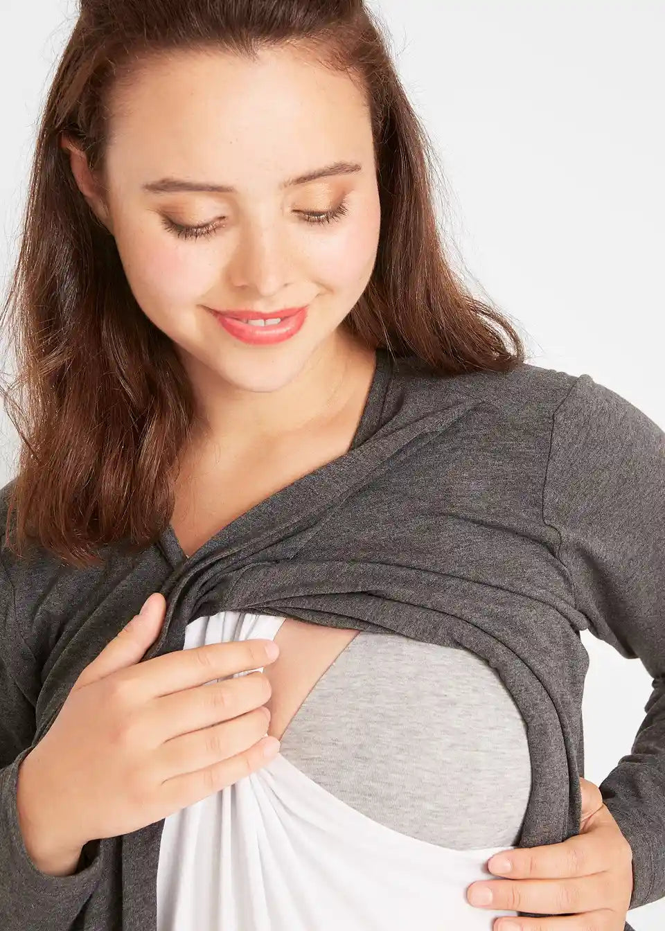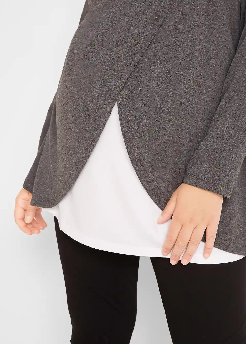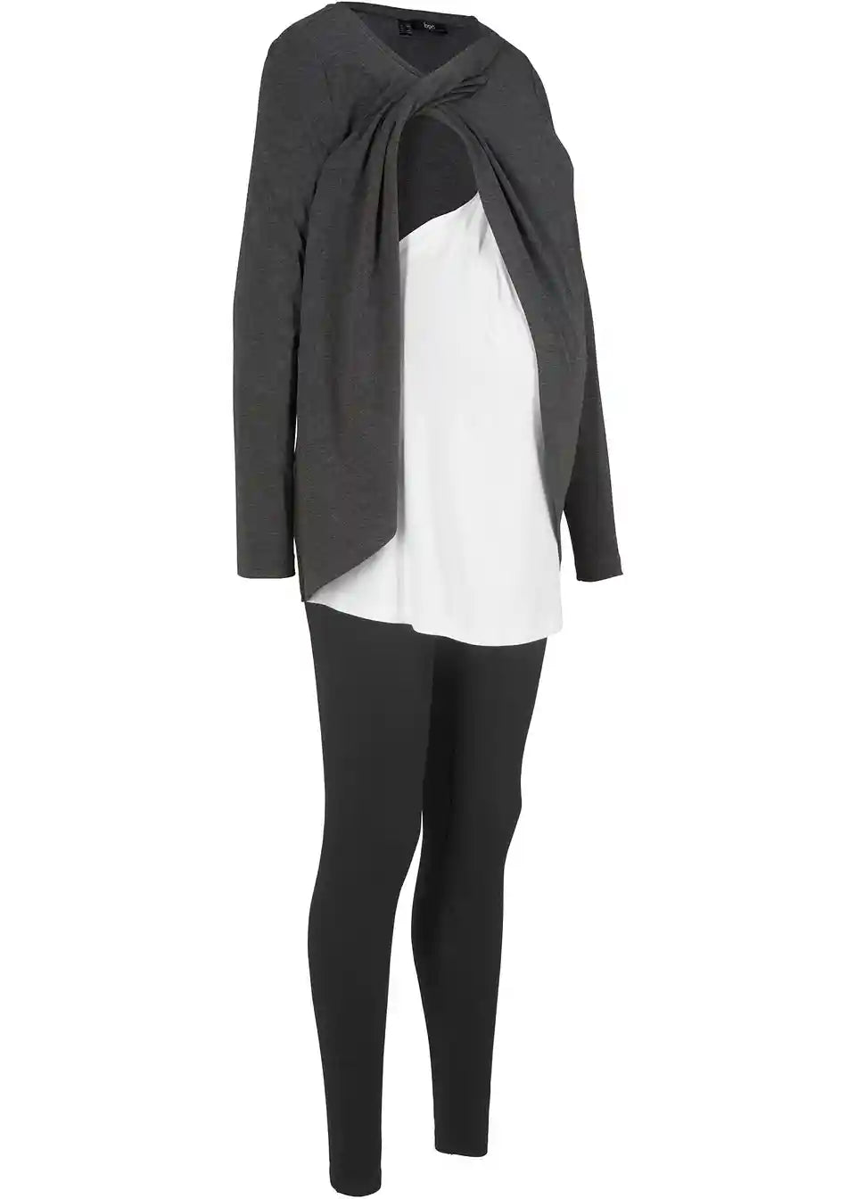 Trudnički set koji se sastoji od hlača i gornjeg dijela s preklopnim izgledom može se nositi u svim fazama trudnoće i nakon nje. Hlače s pojasom preko trbuha, kao i udoban gornji dio, prilagođavaju se individualnom obliku trbuha. Ovaj udobni set za trudnoću dugo će veseliti mame.