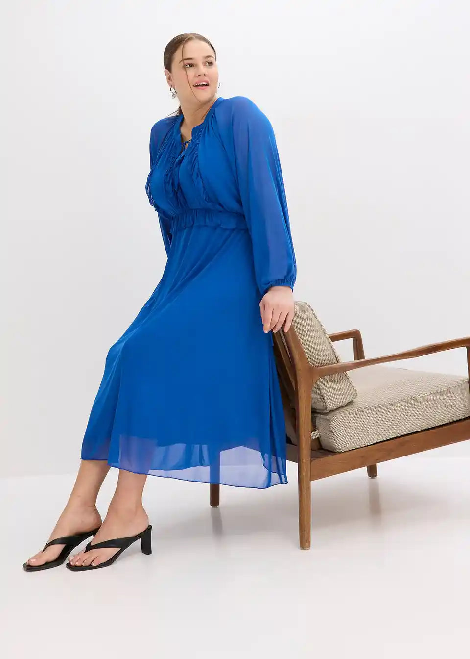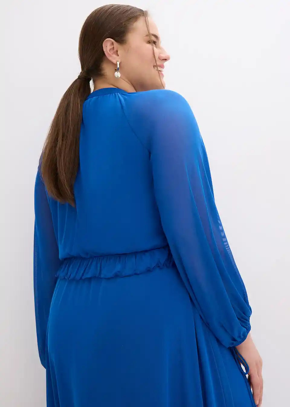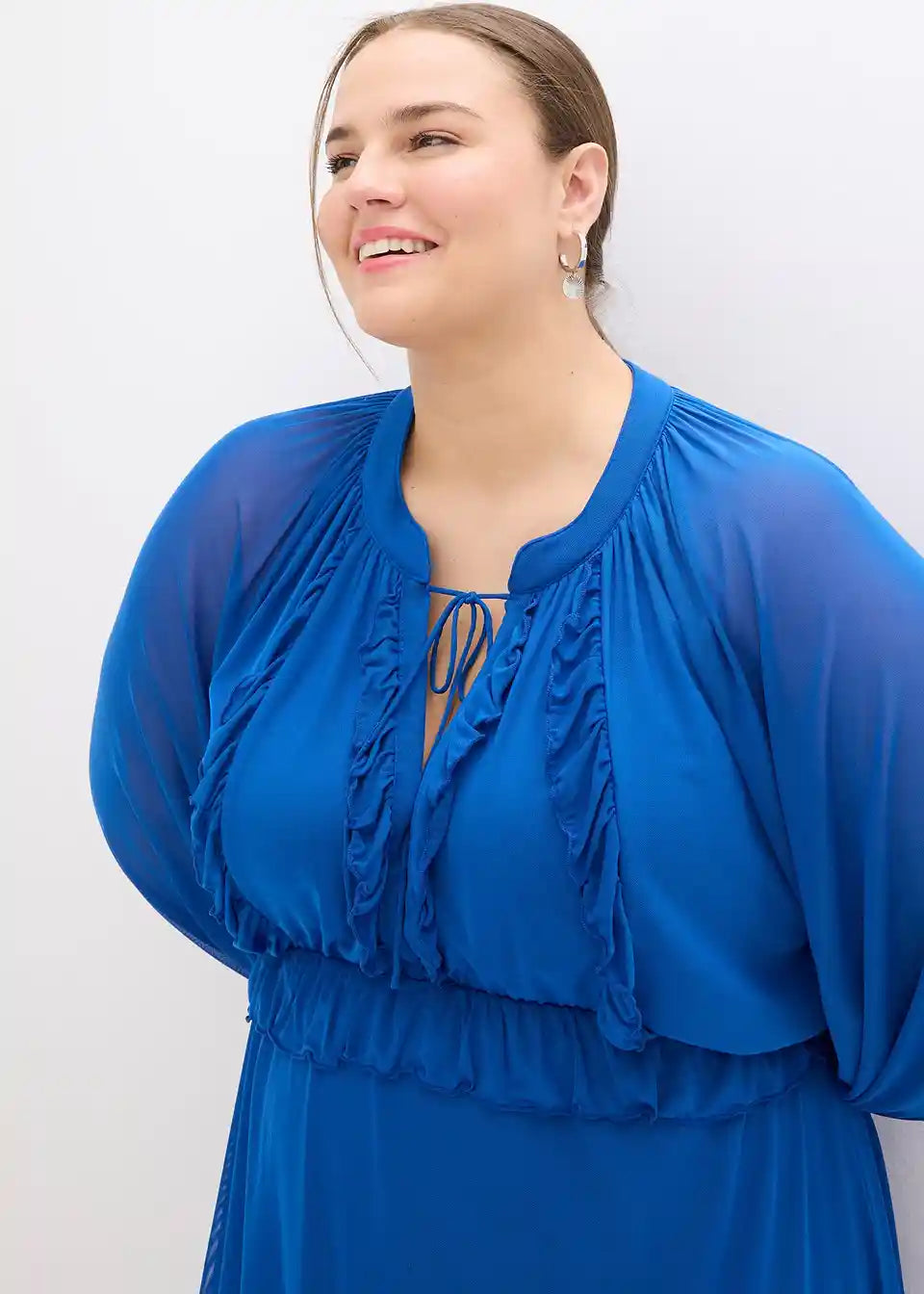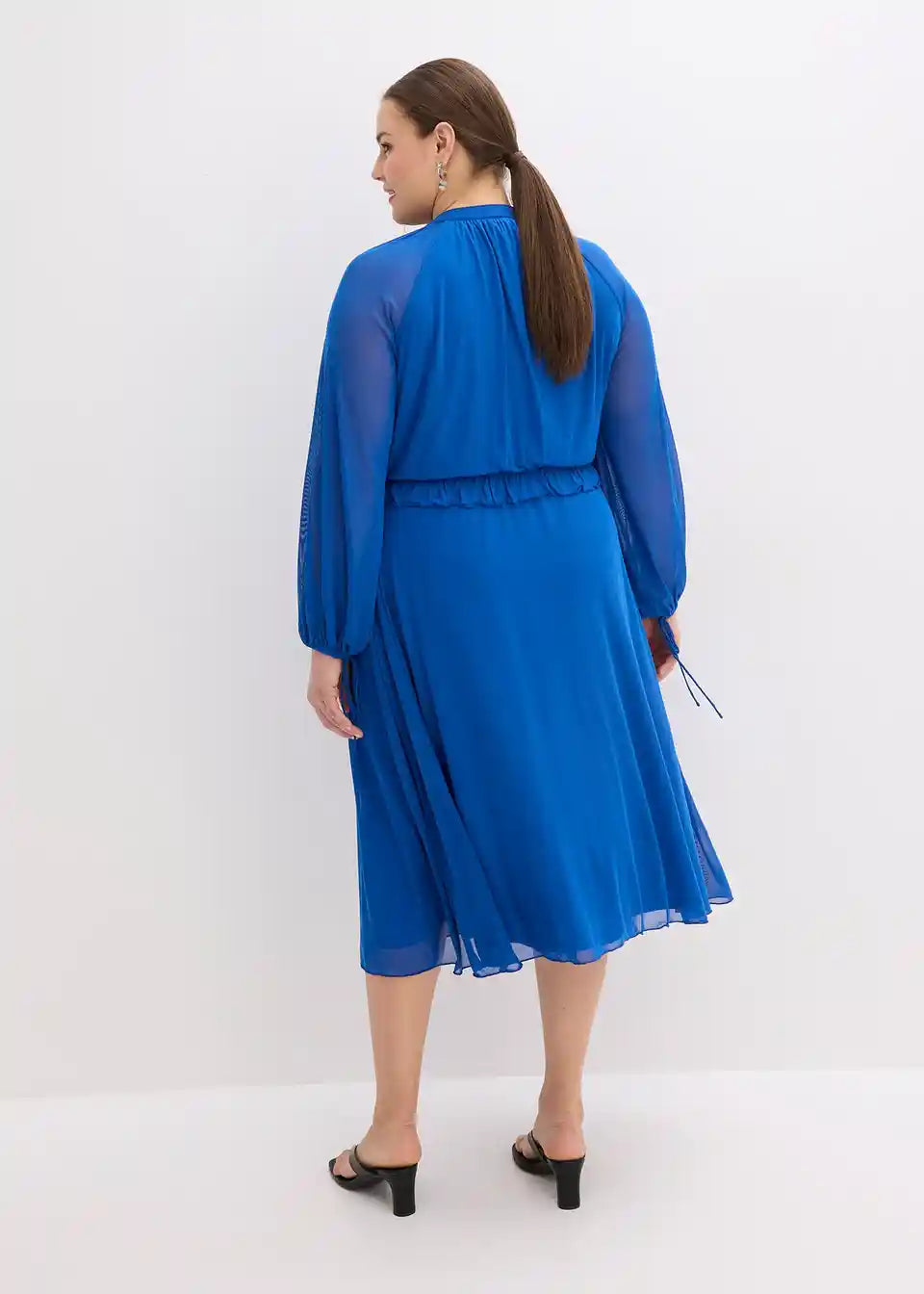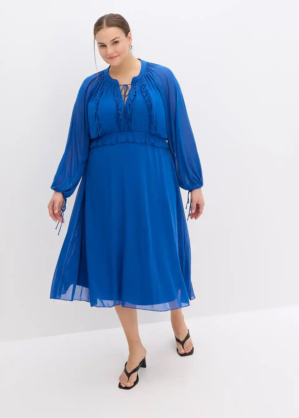 moderna tunika-haljina midi dužine od meke mrežaste tkanine s dekorativnim volanima
