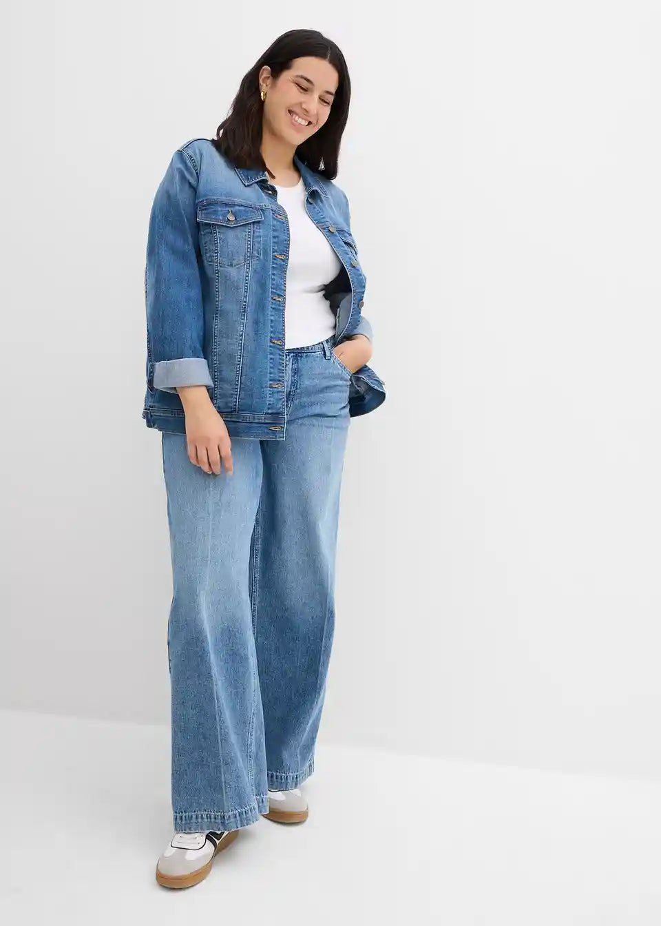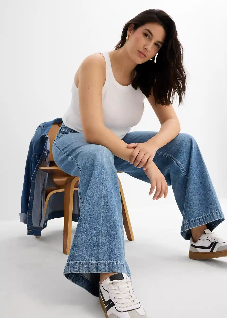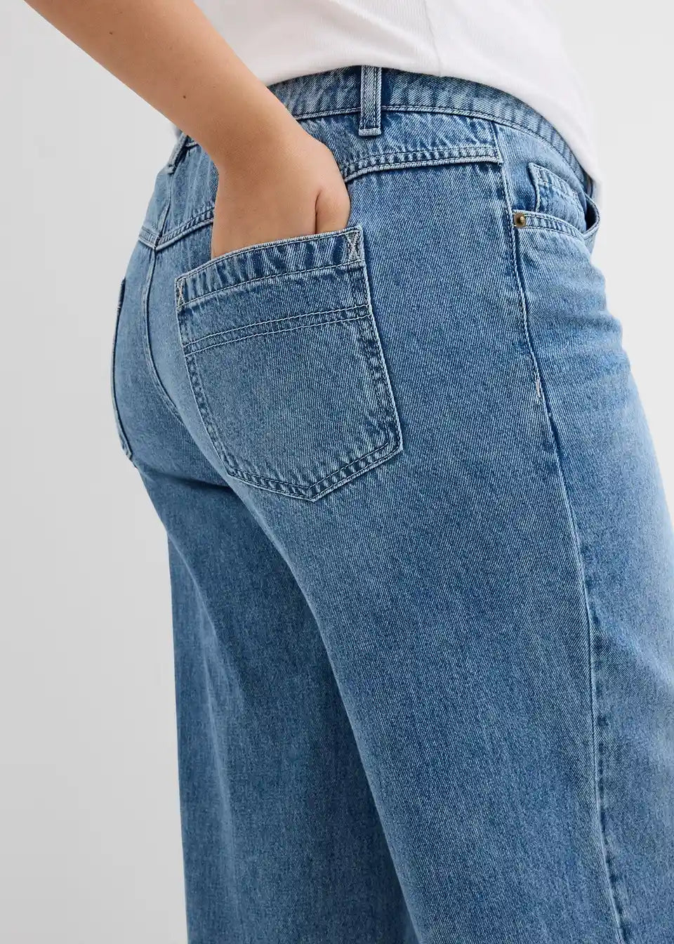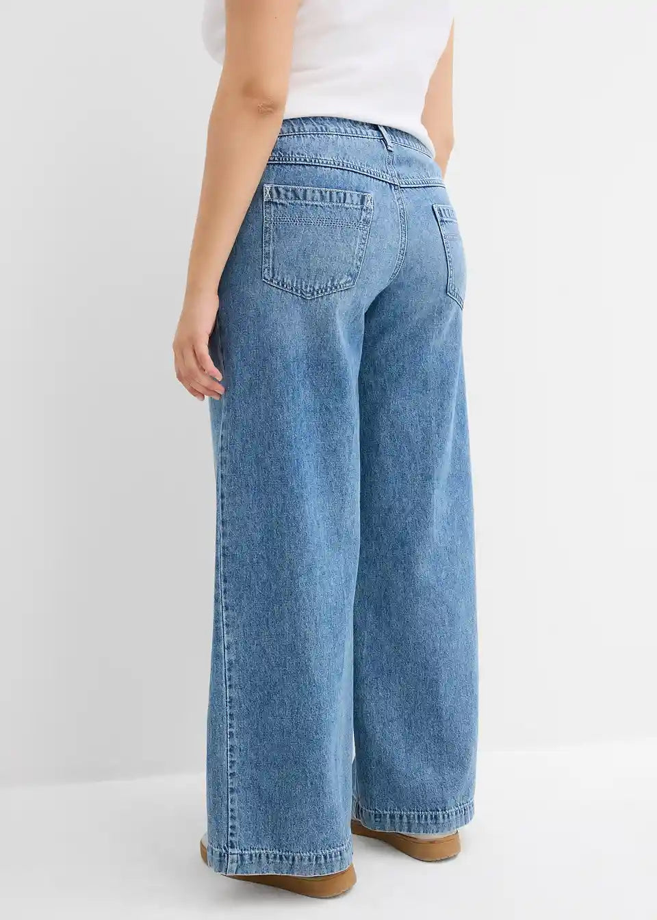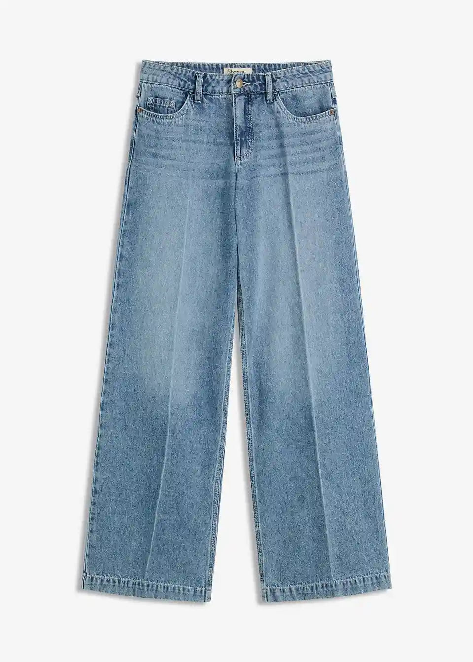 Široke traperice s dugim nogavicama, srednje visoki struk i posvijetljeni peglani pregib