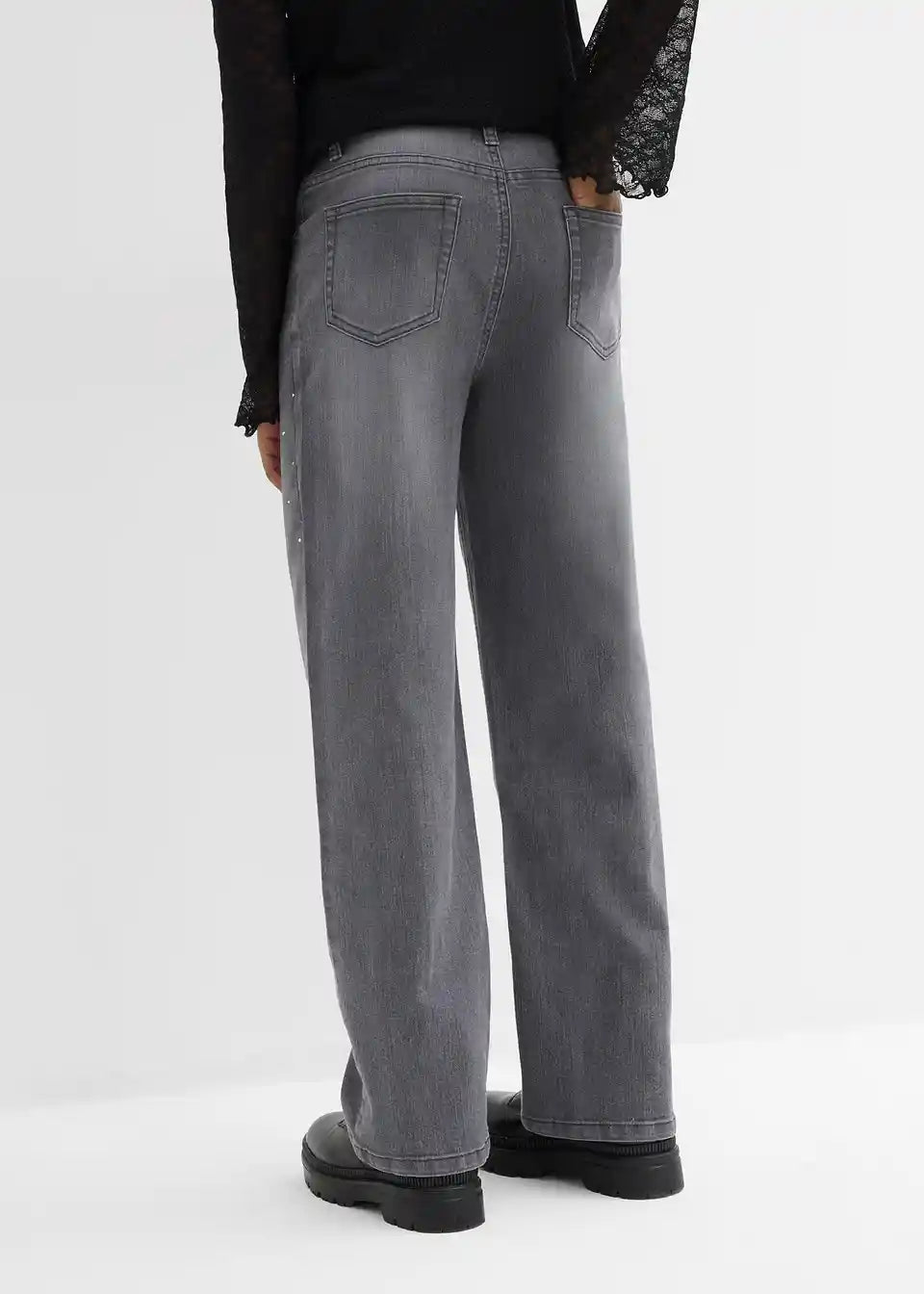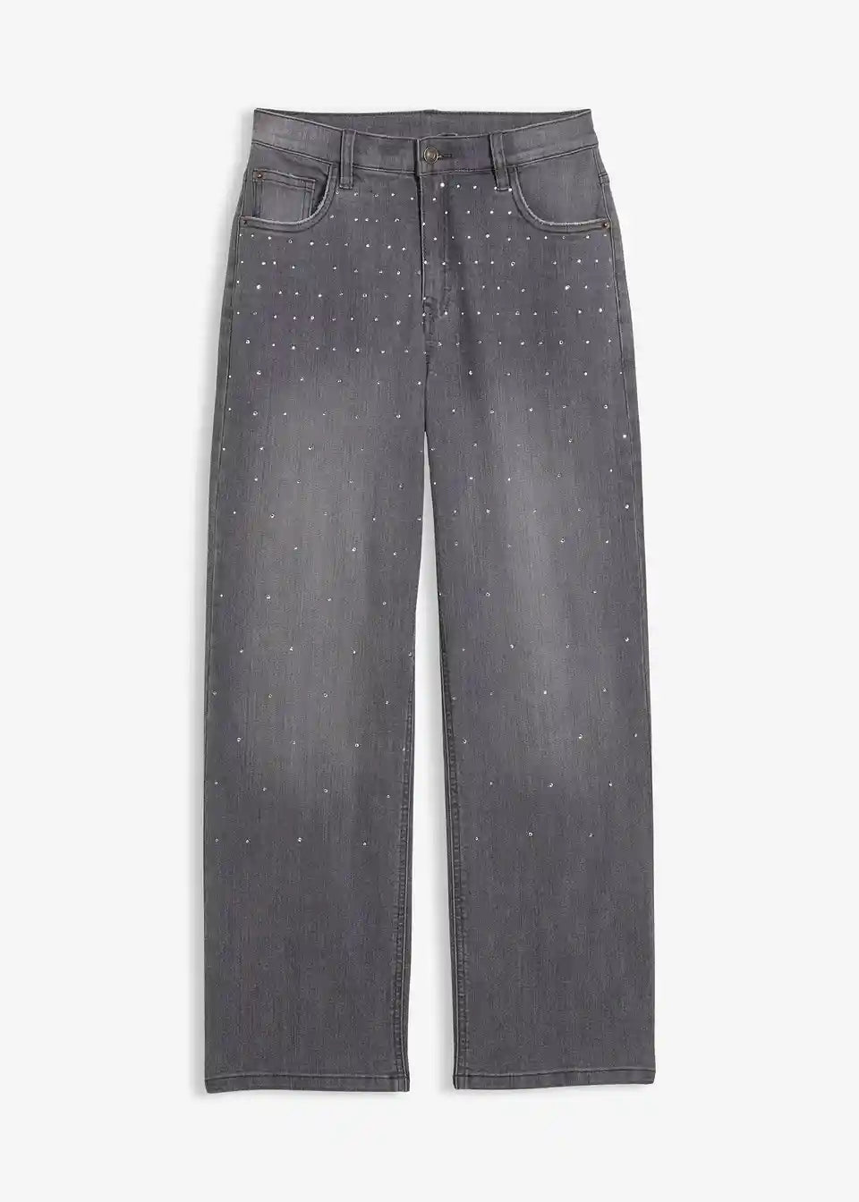 Ove trendi Wide-Leg-Jeans nude ležeran kroj s srednje visokim strukom i dugim, širokim nogavicama. Imaju pet praktičnih džepova i podesivi elastični pojas. Antički srebrni nitni i zalijepljeni kamenčići duž bedra osiguravaju blistav izgled. Sa suptilnim izblijedjelim efektom i modernim dizajnom, ove traperice savršene su za svakodnevicu ili posebne prilike!