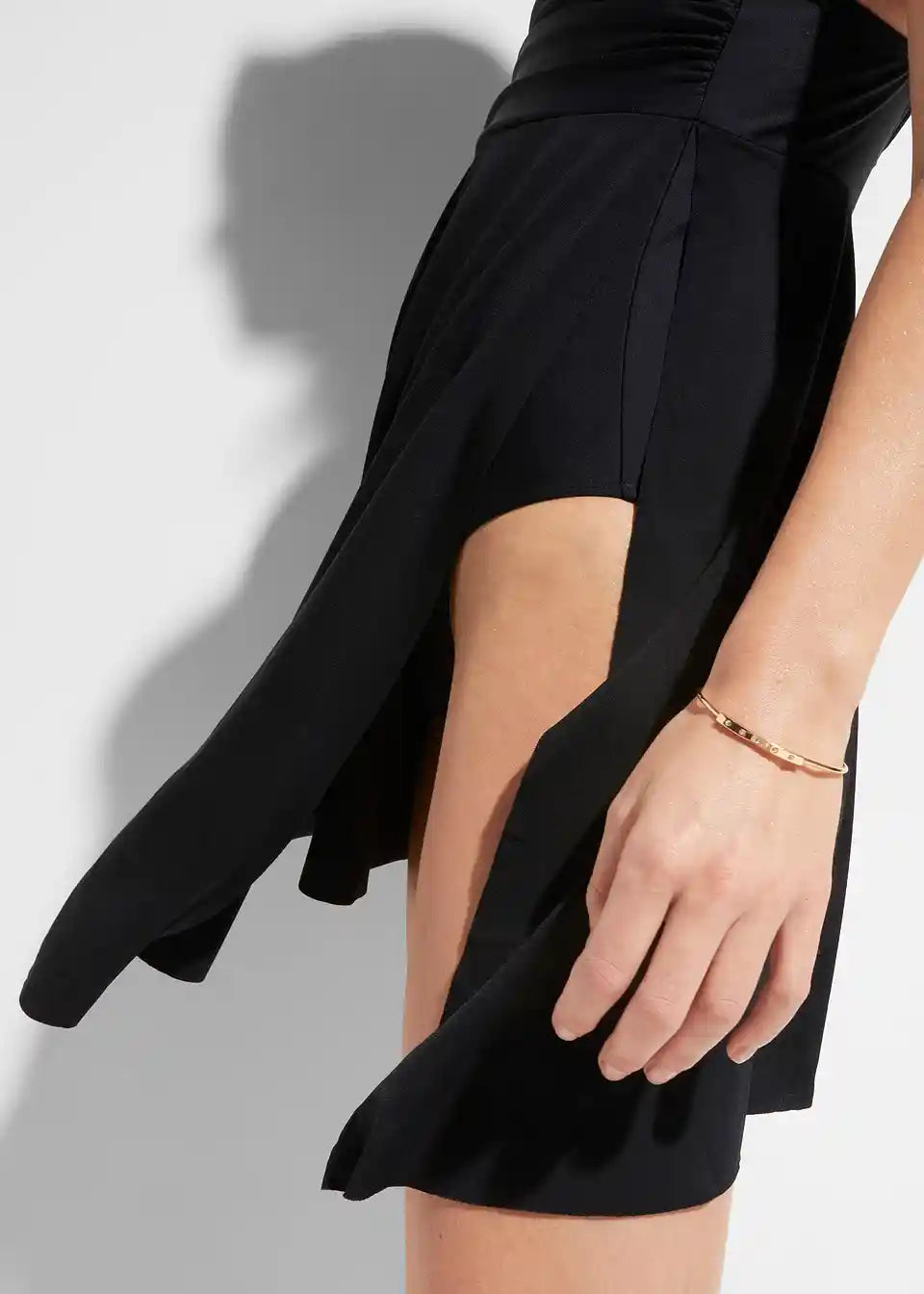 Ova luksuzna i ženstvena kupaća kostim-haljina impresionira svojim dizajnom. Model zrači elegancijom zahvaljujući naborima ispod grudi i asimetrično krojenoj suknji. Podesive naramenice i uklonjive mekane košarice osiguravaju savršen fit i optimalnu podršku.