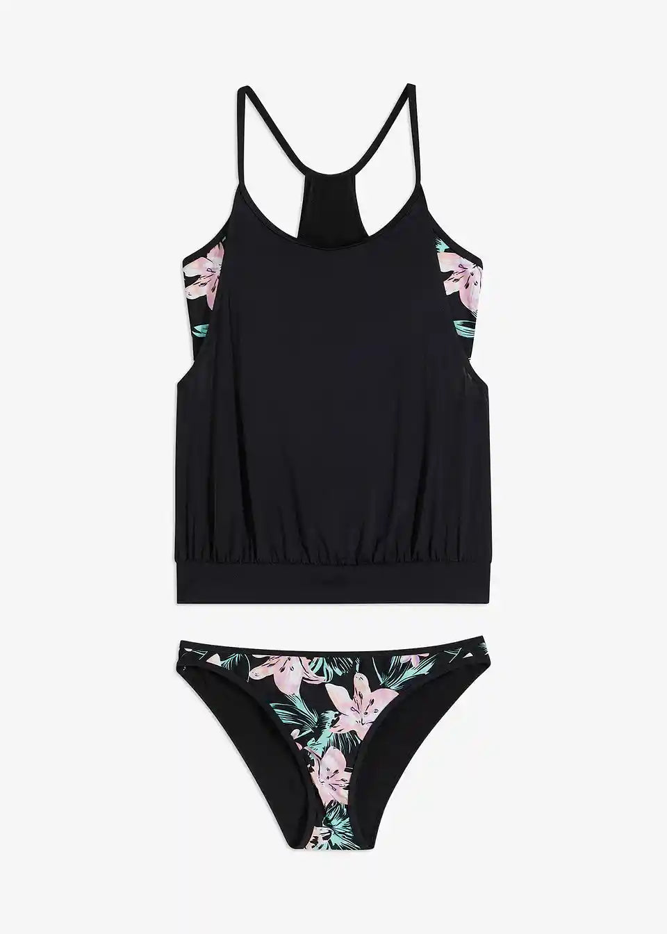 Schöner Tankini. Das Oberteil kaschiert den Bauch, wirkt dabei durch die offenen Seiten und die farbigen Blumenakzente trotzdem schön luftig. Das Oberteil hat Cups, sodass auch der Brustbereich schön in Form ist. Angenehmes und elastisches Material. Das O