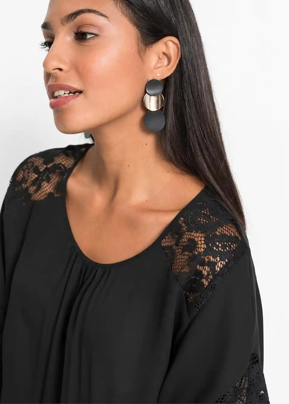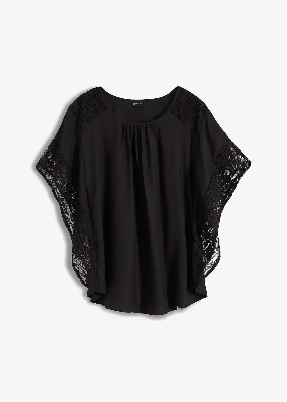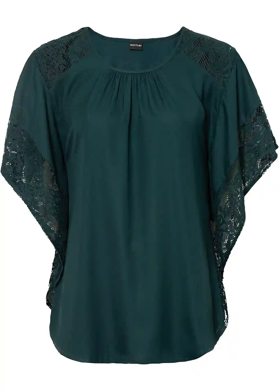 Ova bluza lijepo naglašava ženstvenu figuru i osigurava šarmantan izgled s dozom ženstvenog šarma. Široki rukavi poput šišmiša daju laganom modelu bluze od BODYFLIRT-a romantičnu notu. Nježne čipkaste aplikacije duž rukava i iznad ramena dodaju razigrane naglaske. Lagano nabiranje duž izreza dodatno ističe bluzu s čipkastim detaljima i čini je omiljenim sofisticiranim komadom.