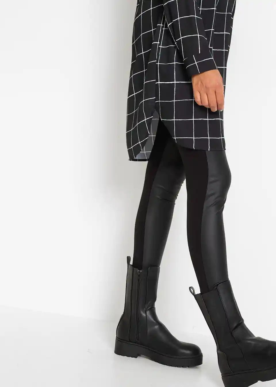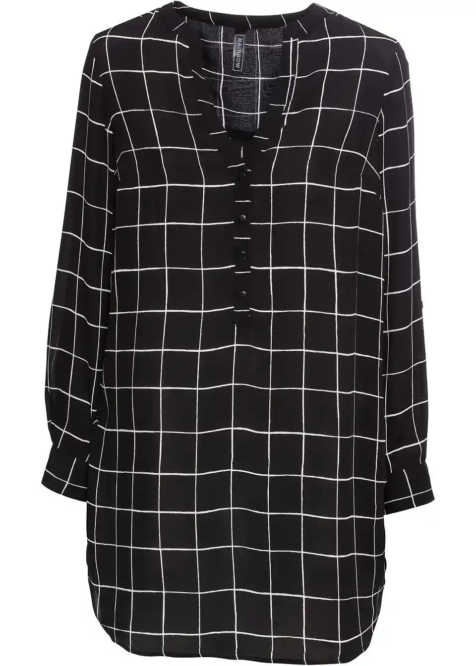 Lagano prozirni, fino tkani materijal i iznimno širok kroj čine uvjerljivu kombinaciju kod ove duge bluze. Moderni karirani uzorak zaokružuje dizajn. Model bez ovratnika ima duboki V-izrez koji prelazi u dugmad. Manžete na rukavima zaokružuju dizajn duge bluze. Funkcija podvrnutih rukava omogućava fiksiranje dugih rukava. Ovaj karirani model, koji se može nositi i kao mini haljina, oduševljava u kombinaciji s tajicama od umjetne kože ili upečatljivo uzorkovanim čarapama.