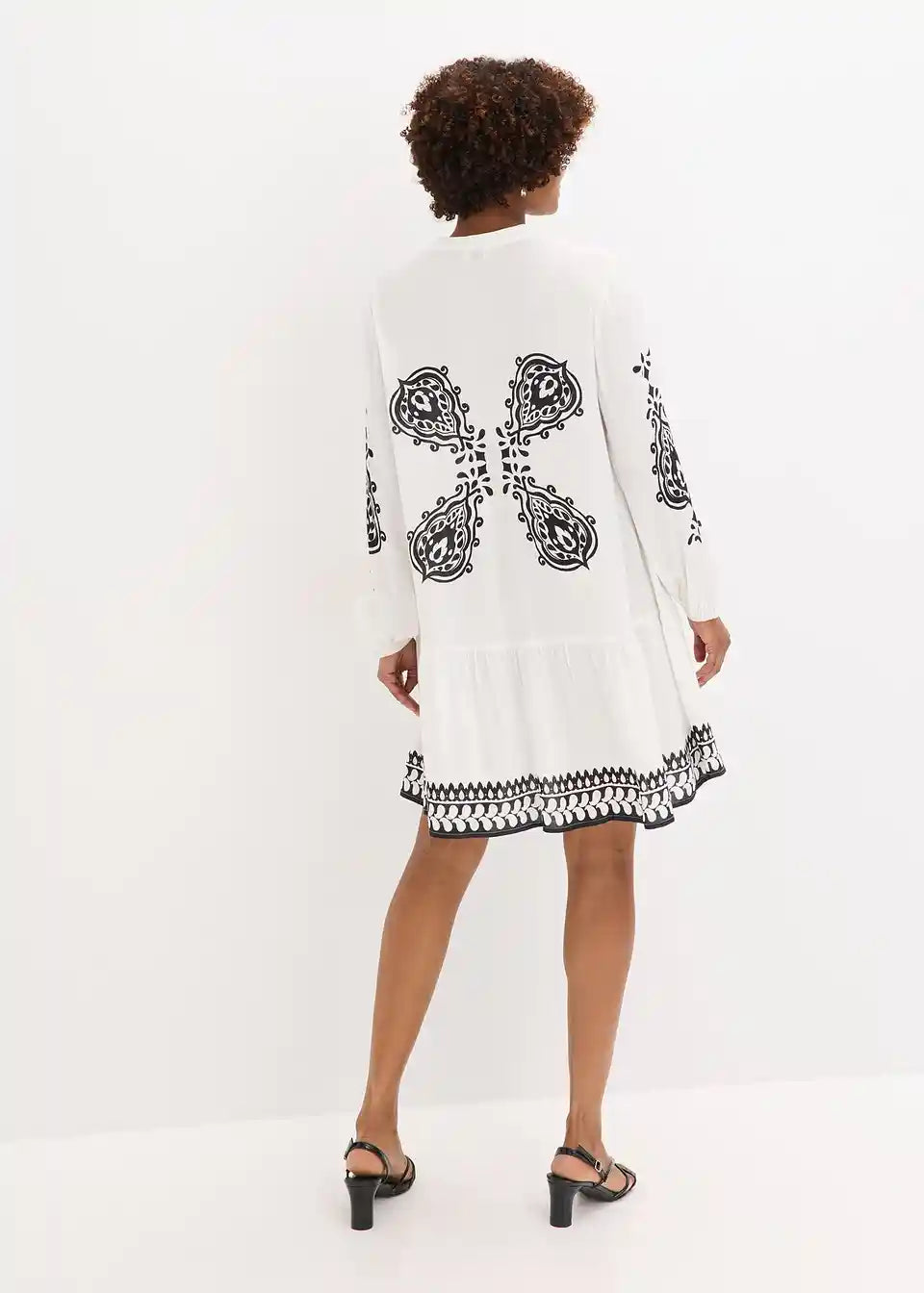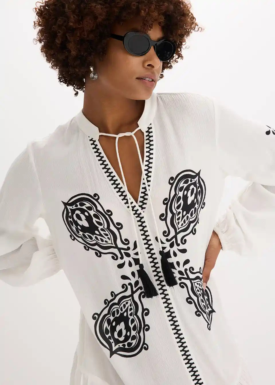 ljetna tunika-haljina od strukturirane viskoze s detaljima za vezanje sprijeda na izrezu i našivenim volanom na rubu suknje
