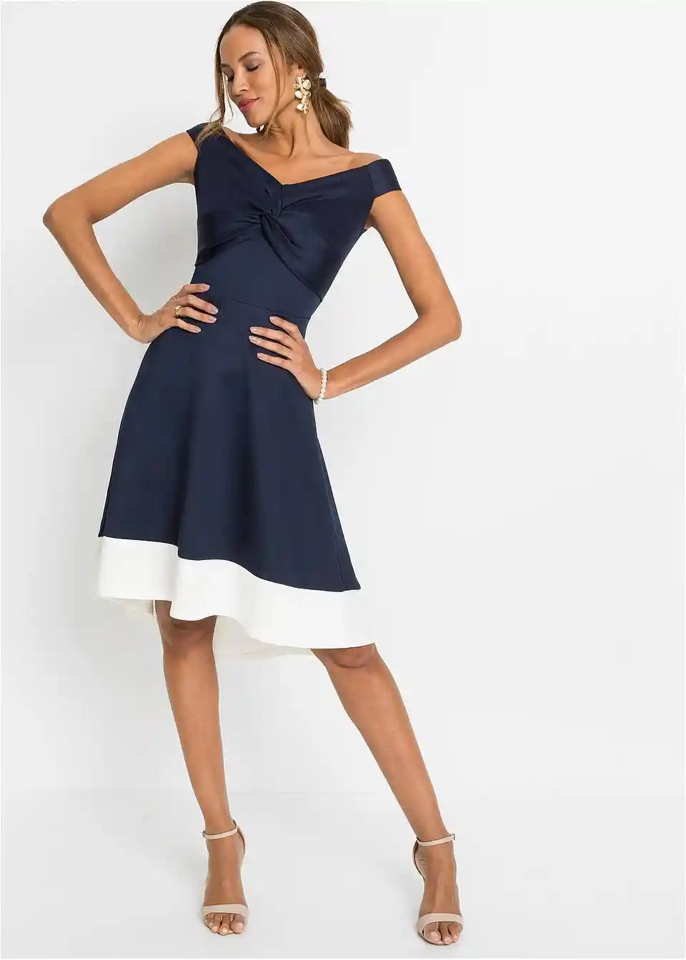 Ženstvena i moderna haljina od čvrstog scuba materijala s Carmen izrezom i detaljem čvora