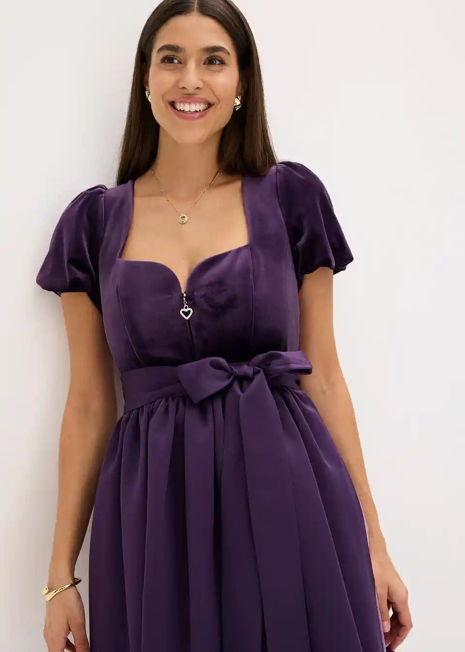 Modern i ženstven: Dirndl od baršuna s izrezom u obliku srca i balon rukavima te pregača od sjajnog satena