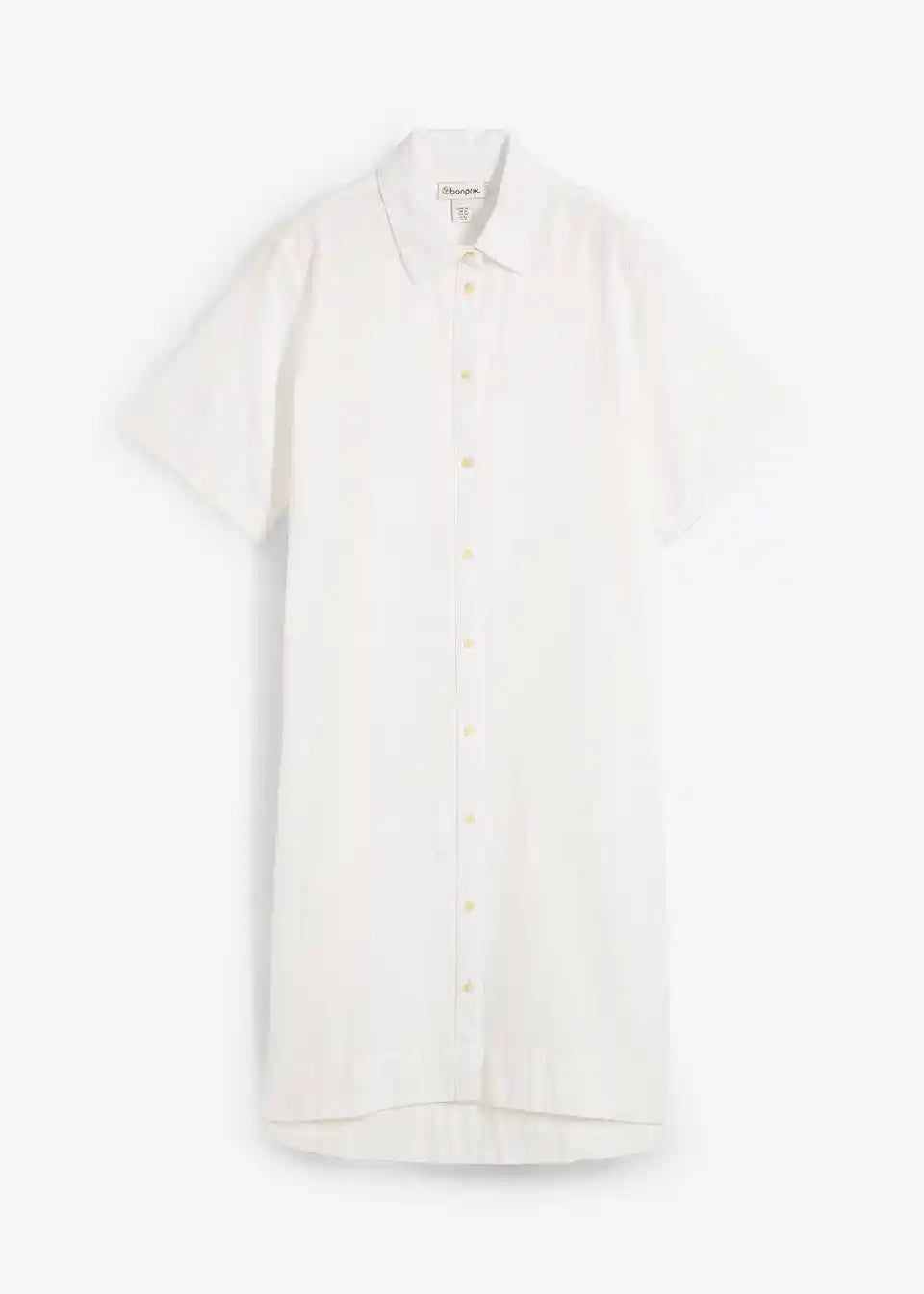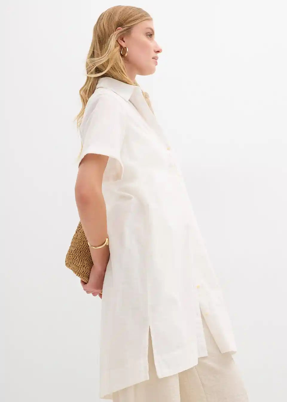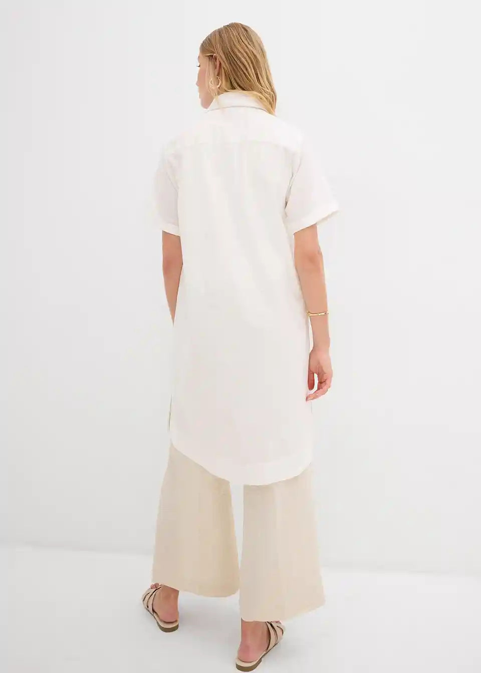 Košulja-haljina, ravnog i ležernog kroja. Blago A kroja prema rubu, bočni prorezi, široki rukavi