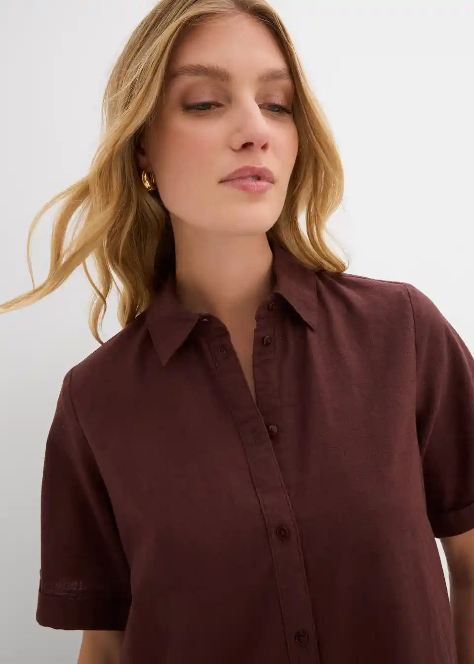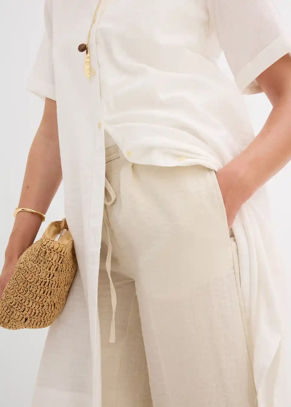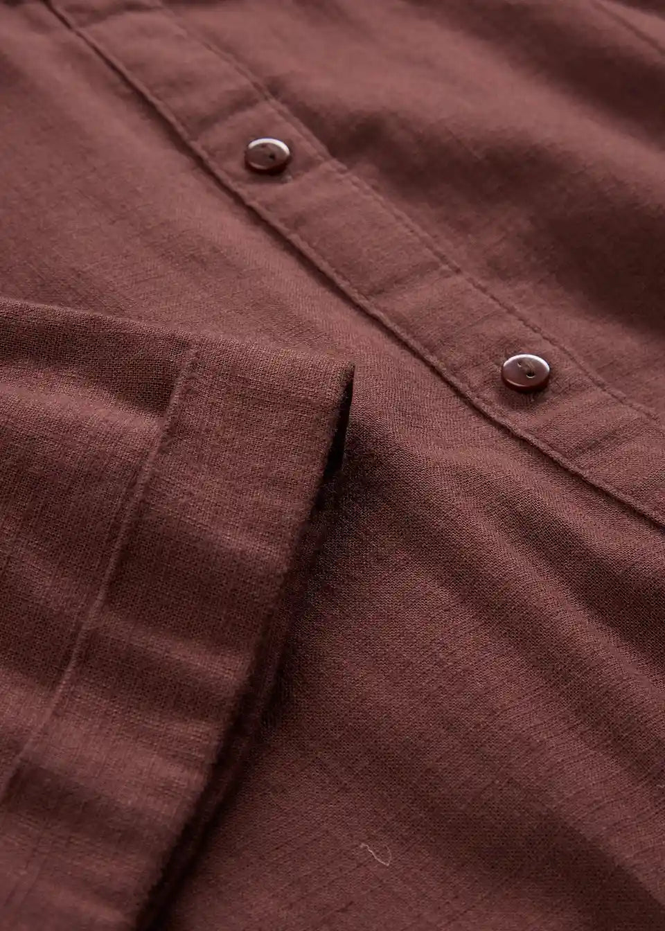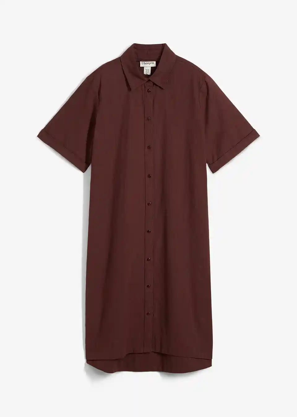 Košulja-haljina, ravnog i ležernog kroja. Blago A kroja prema rubu, bočni prorezi, široki rukavi