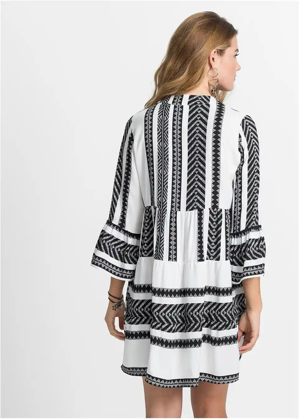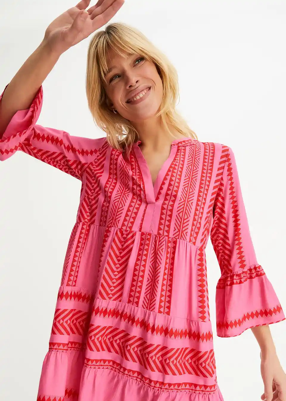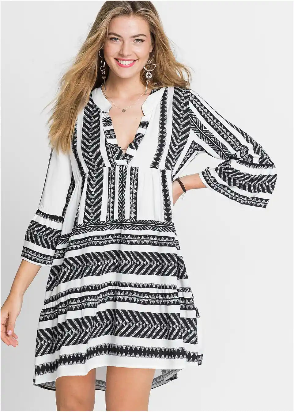 Ova haljina osvaja modernim izgledom. Prozračni model s dubokim V-izrezom izrađen je s trendovskim uzorkom po cijeloj površini. Ležerno obavija figuru, a rukavi su naglašeni hladnim volanima. Kratka ljetna haljina savršena je za nošenje na plaži preko bikinija te u kombinaciji s sandalama ili japankama.