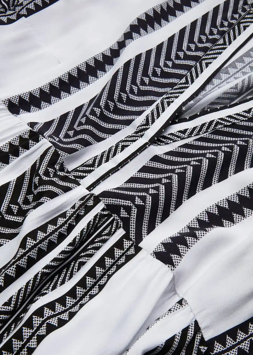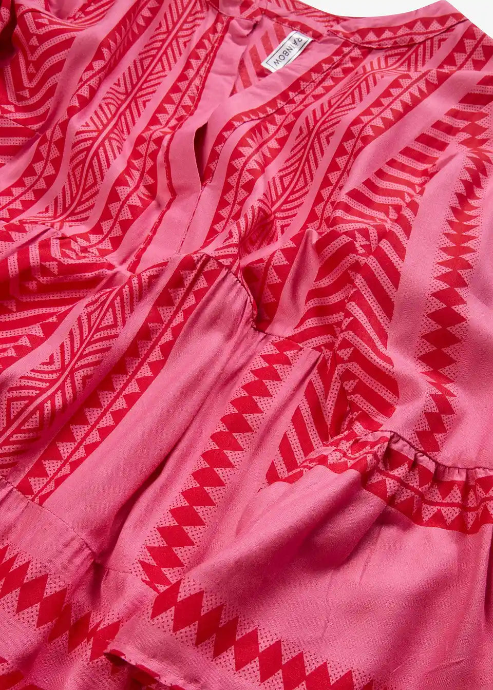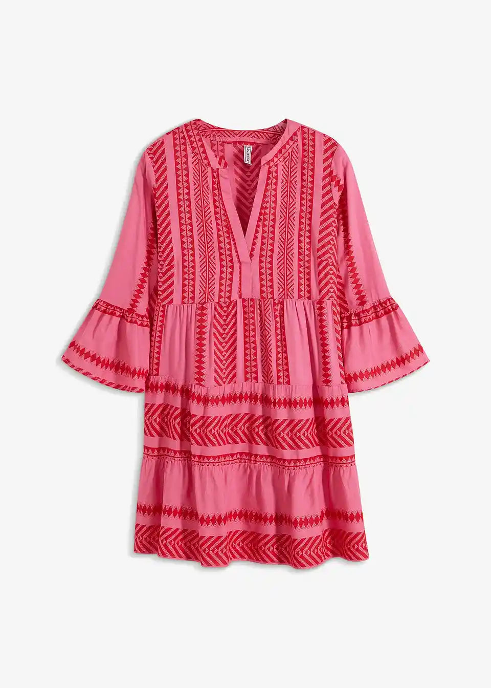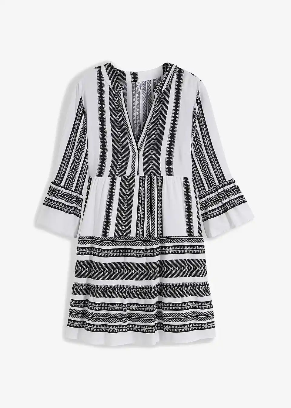 Ova haljina osvaja modernim izgledom. Prozračni model s dubokim V-izrezom izrađen je s trendovskim uzorkom po cijeloj površini. Ležerno obavija figuru, a rukavi su naglašeni hladnim volanima. Kratka ljetna haljina savršena je za nošenje na plaži preko bikinija te u kombinaciji s sandalama ili japankama.