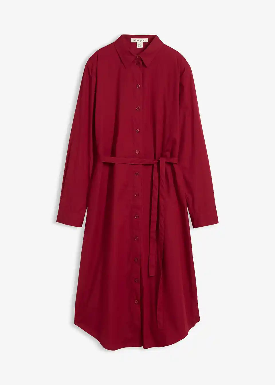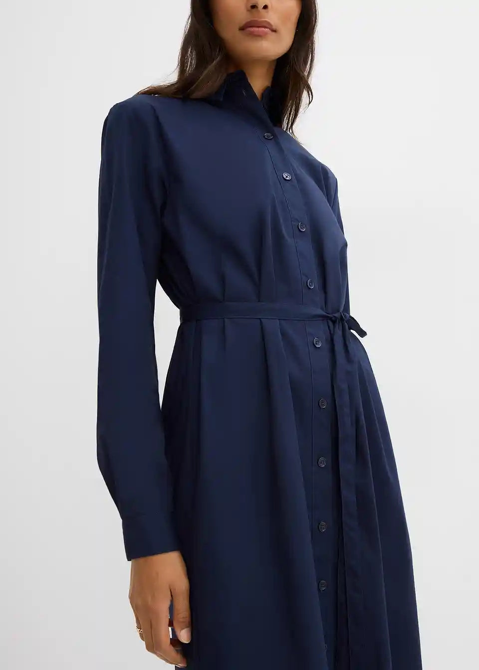 Košulja-haljina midi dužine sa šiljastim ovratnikom, manšetama s gumbima i zaobljenim rubom. Kopčanje gumbima sprijeda.