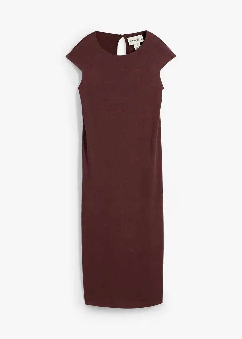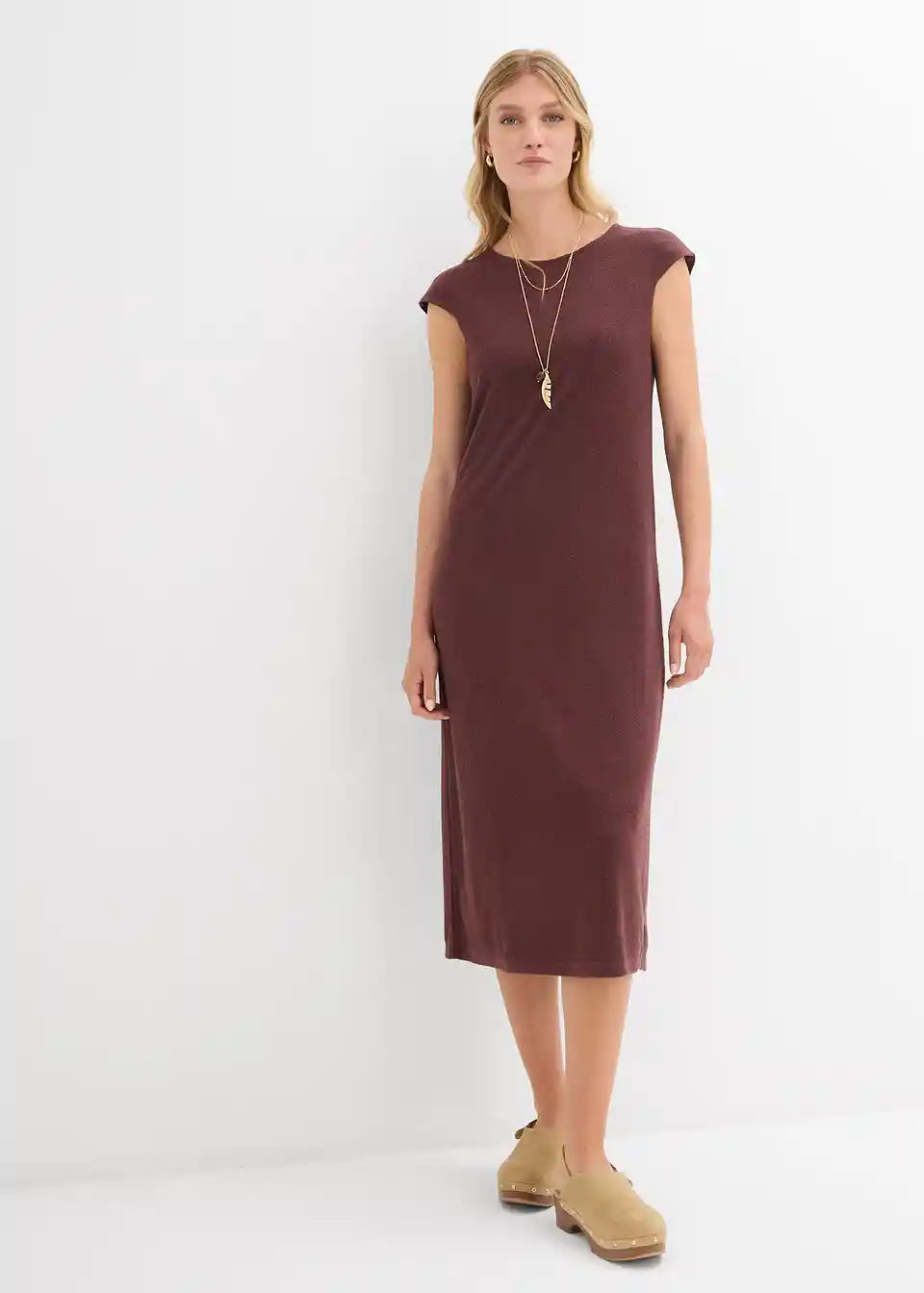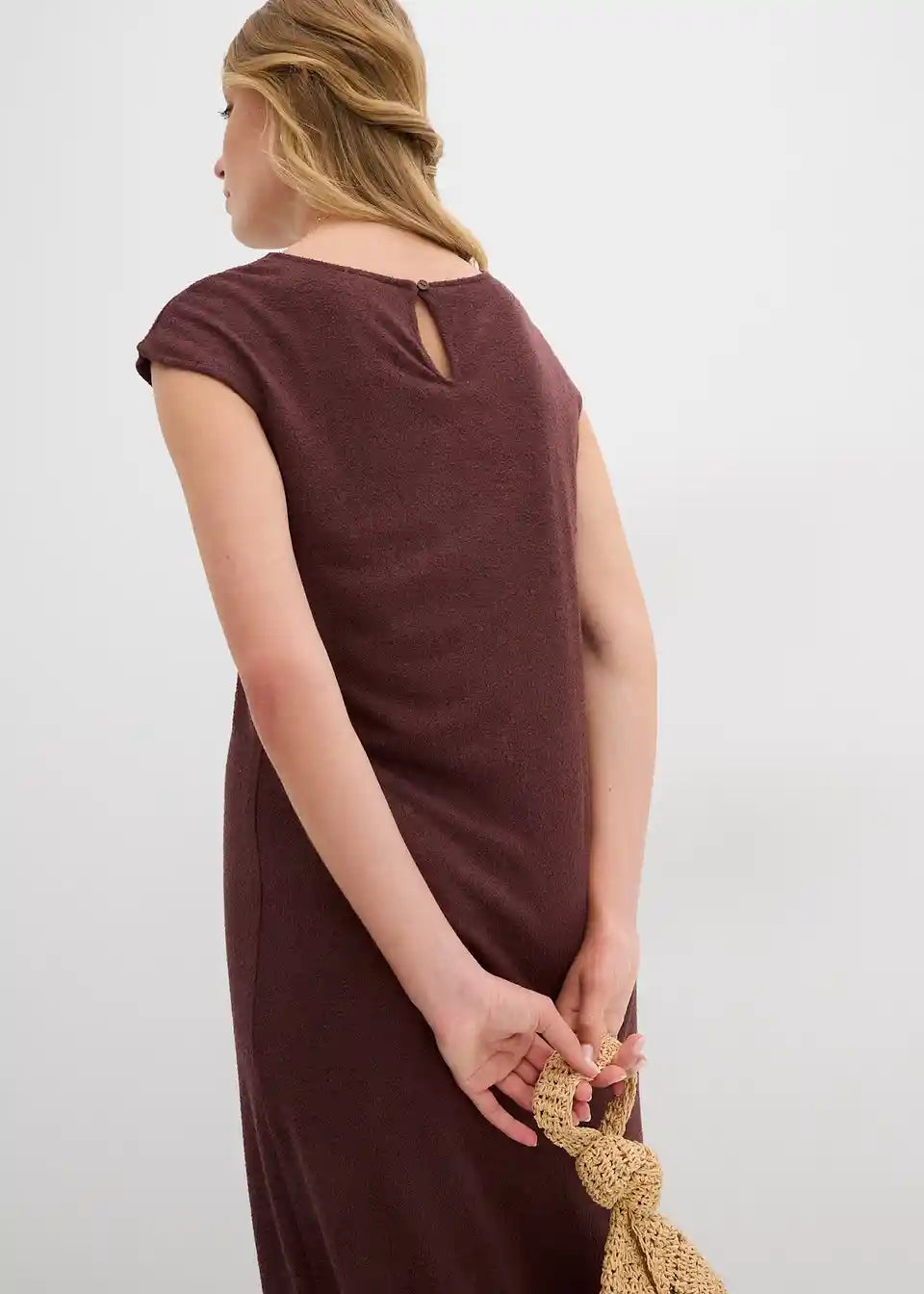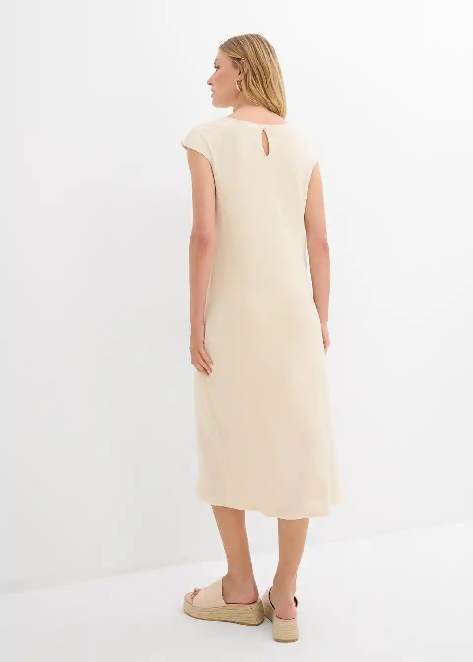 Midihaljina sa skraćenom unutarnjom podstavom od mekane viskoze. Otvor na ključanicu i kopčanje na gumb na sredini vrata na leđima.