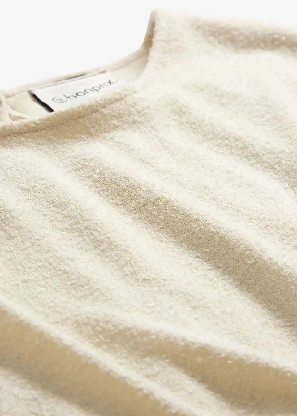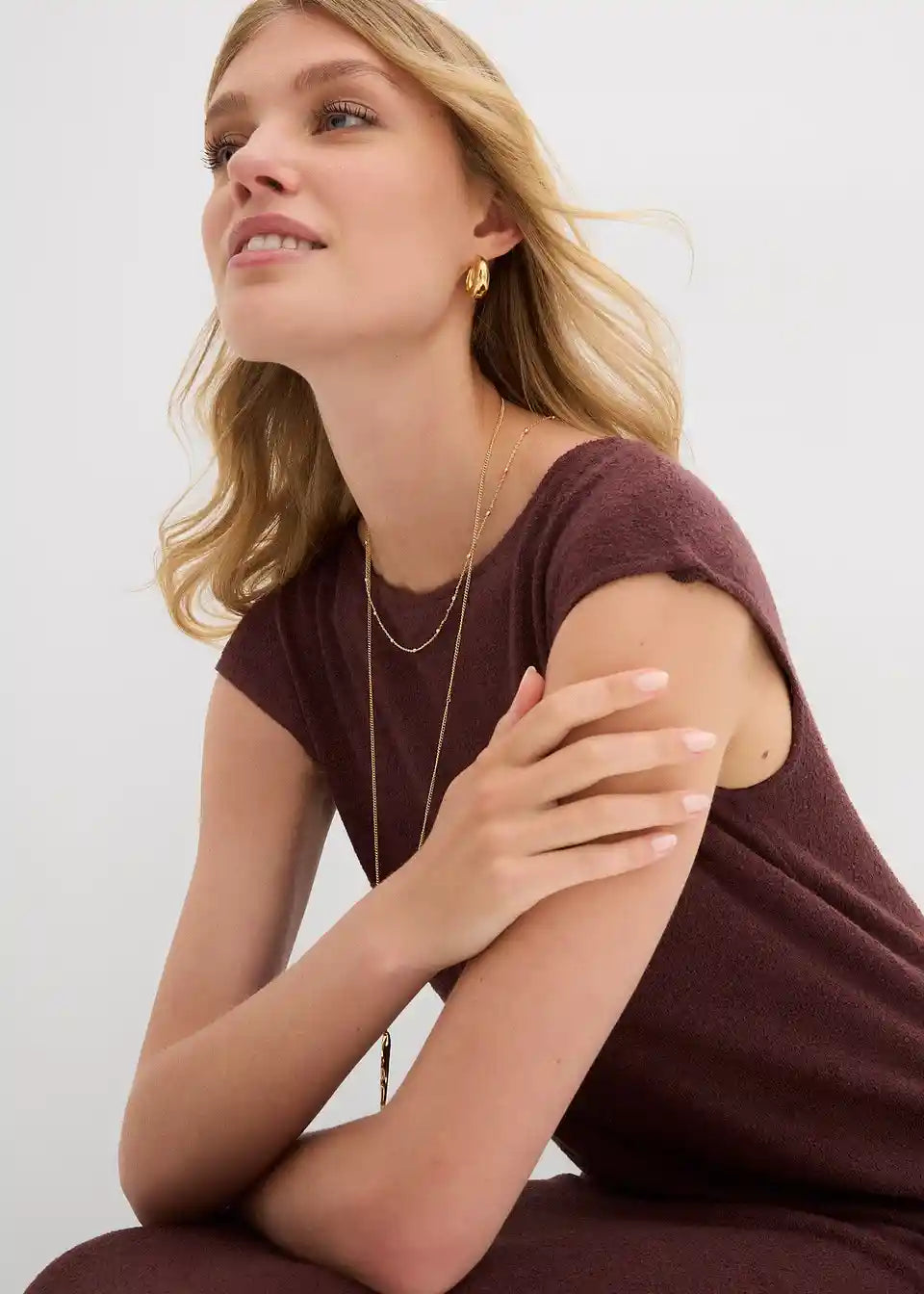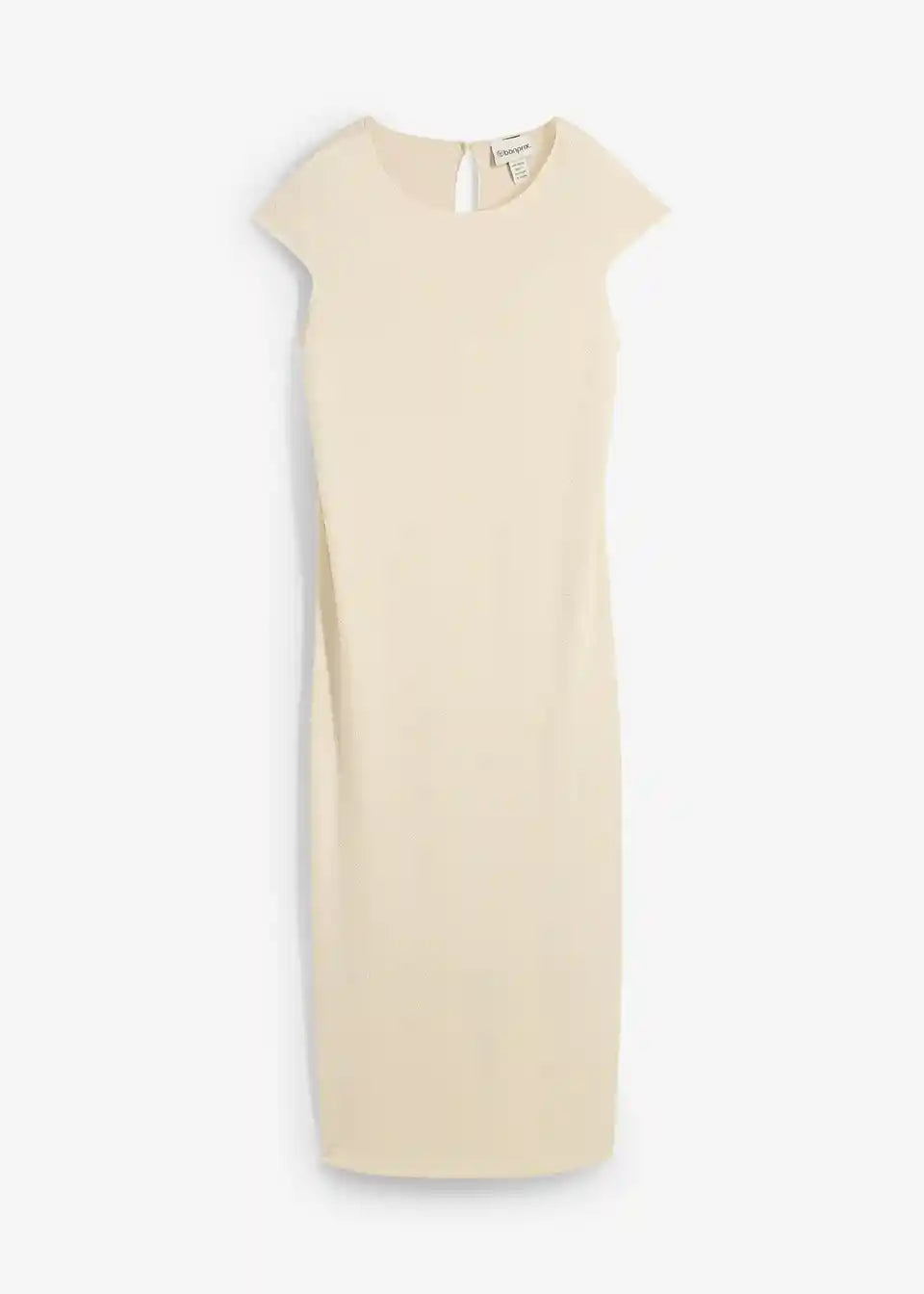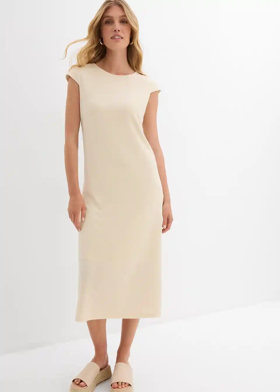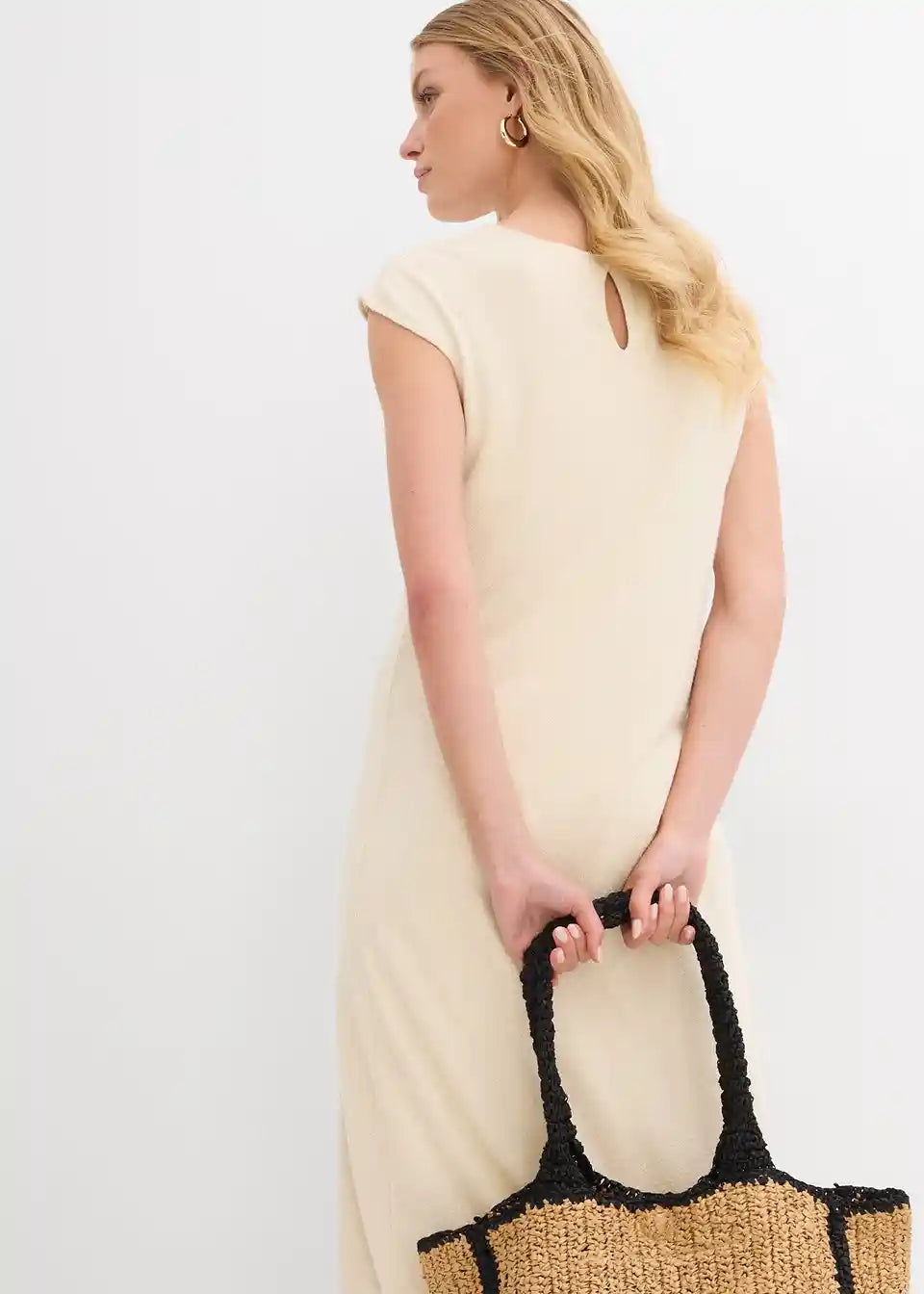 Midihaljina sa skraćenom unutarnjom podstavom od mekane viskoze. Otvor na ključanicu i kopčanje na gumb na sredini vrata na leđima.