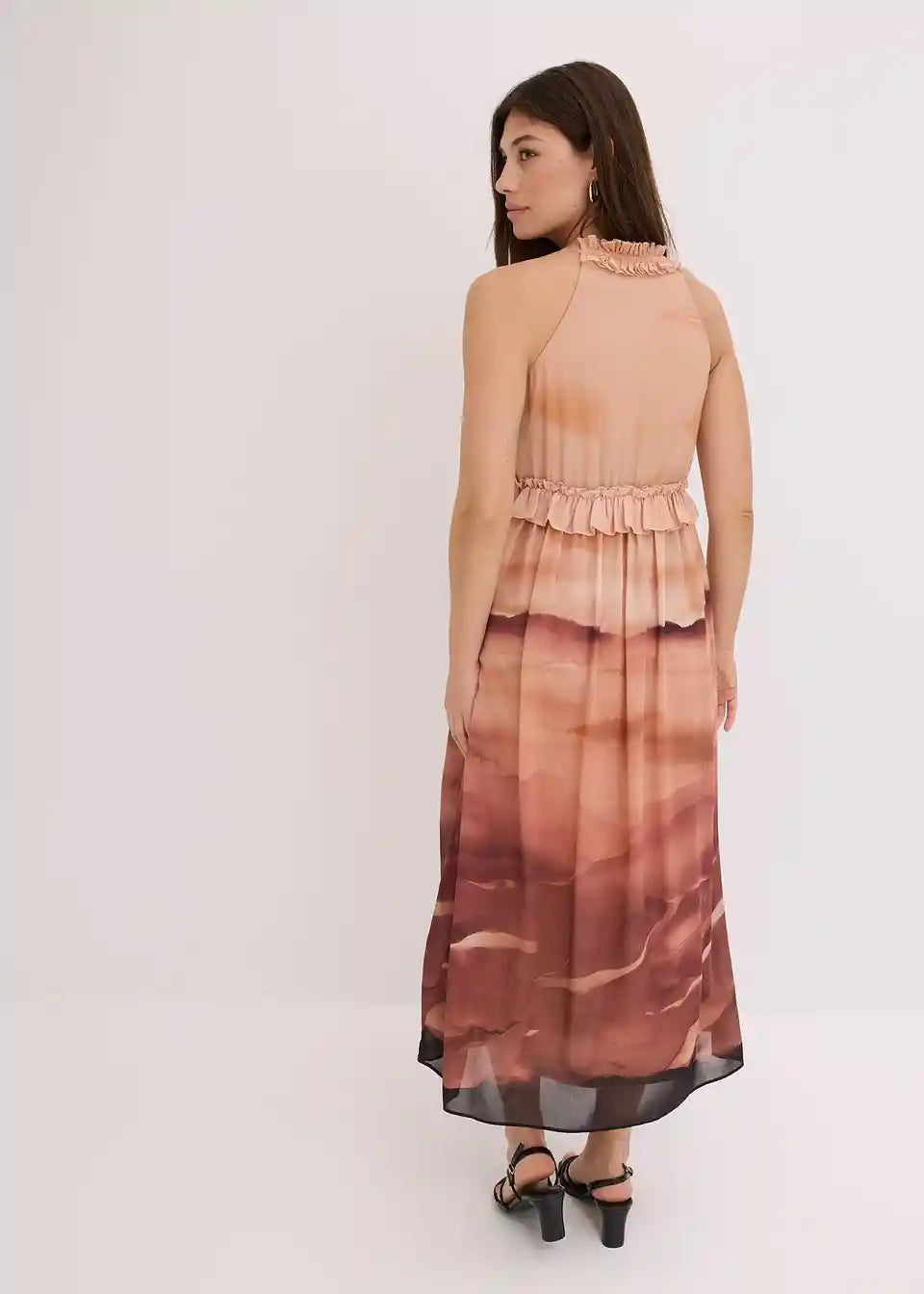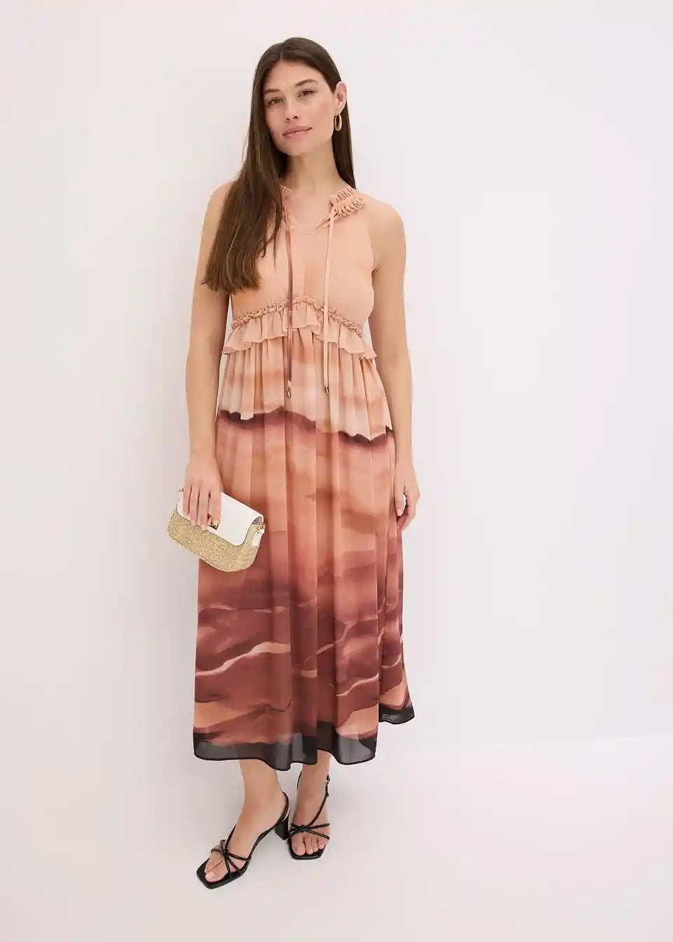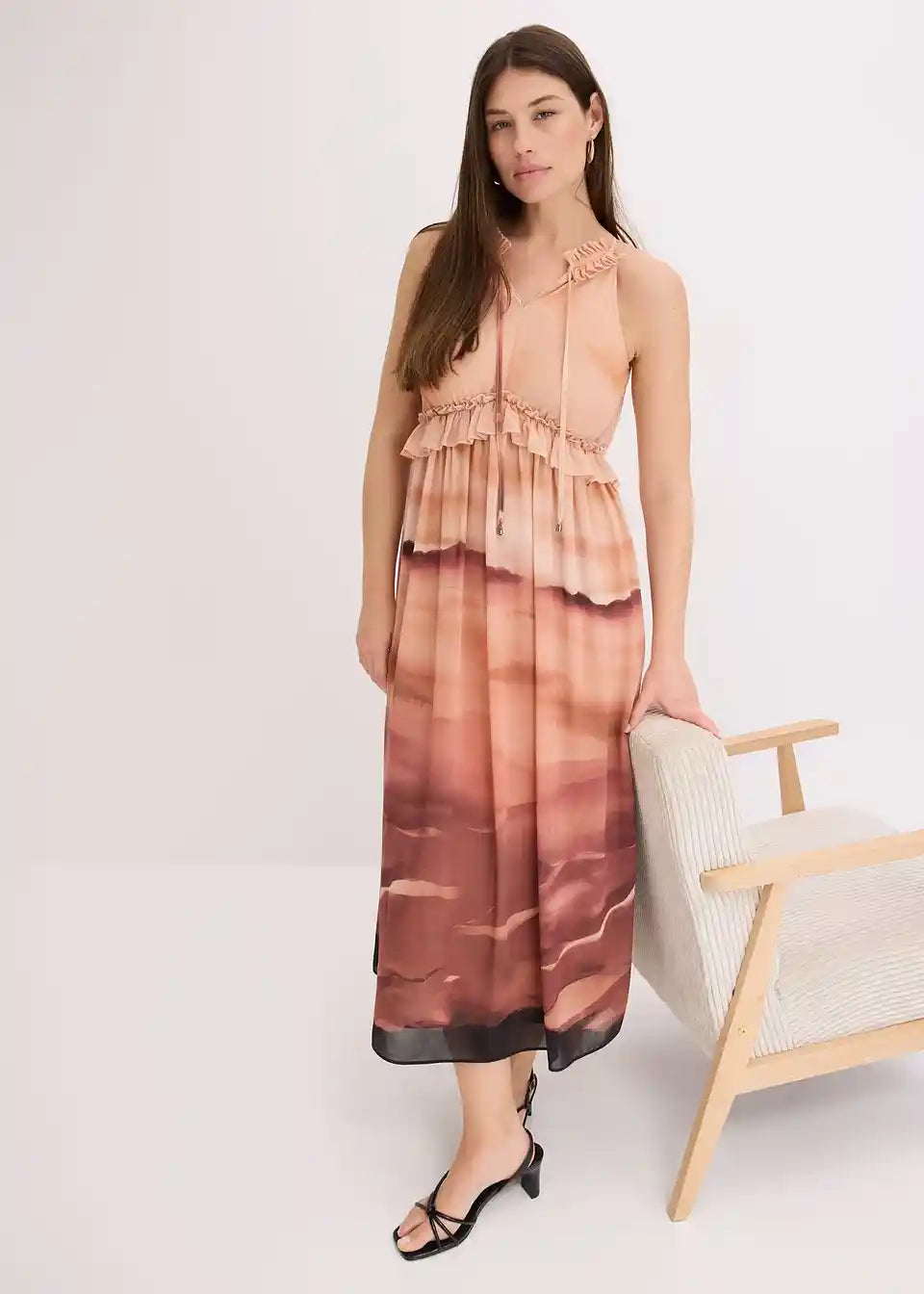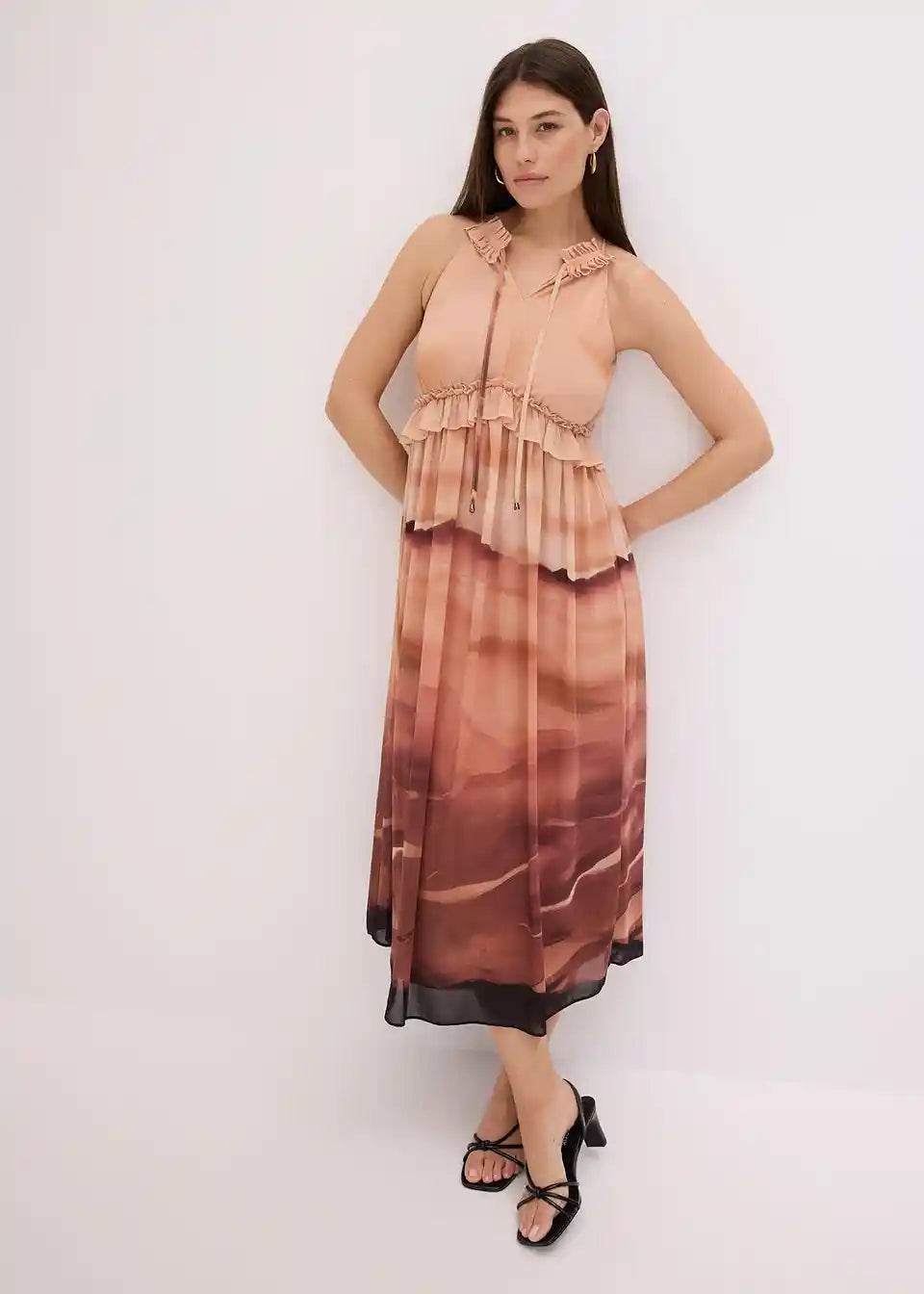 moderna tiskana Chiffon haljina srednje dužine s volanima na izrezu i u struku