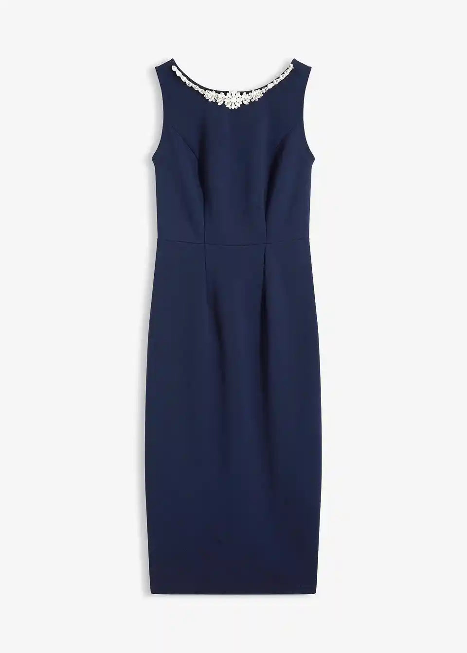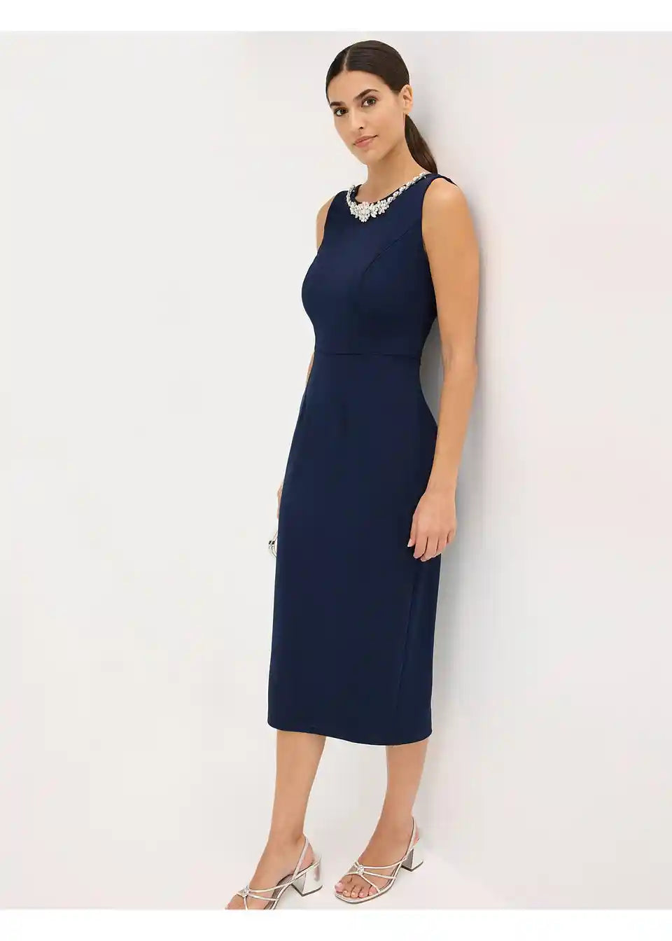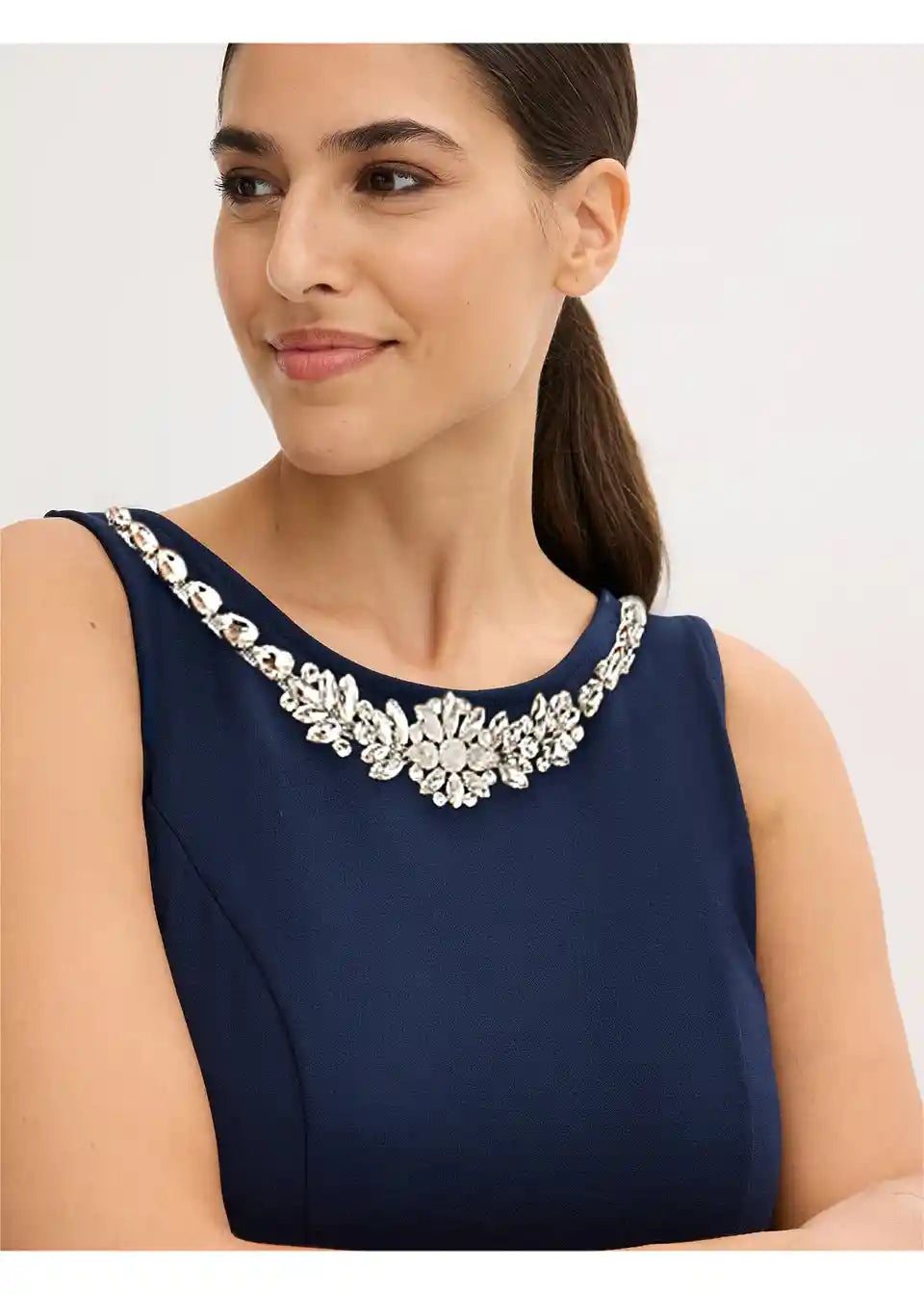 Etui-haljina od strukturiranog krepa s aplikacijom od strass kamenčića na izrezu