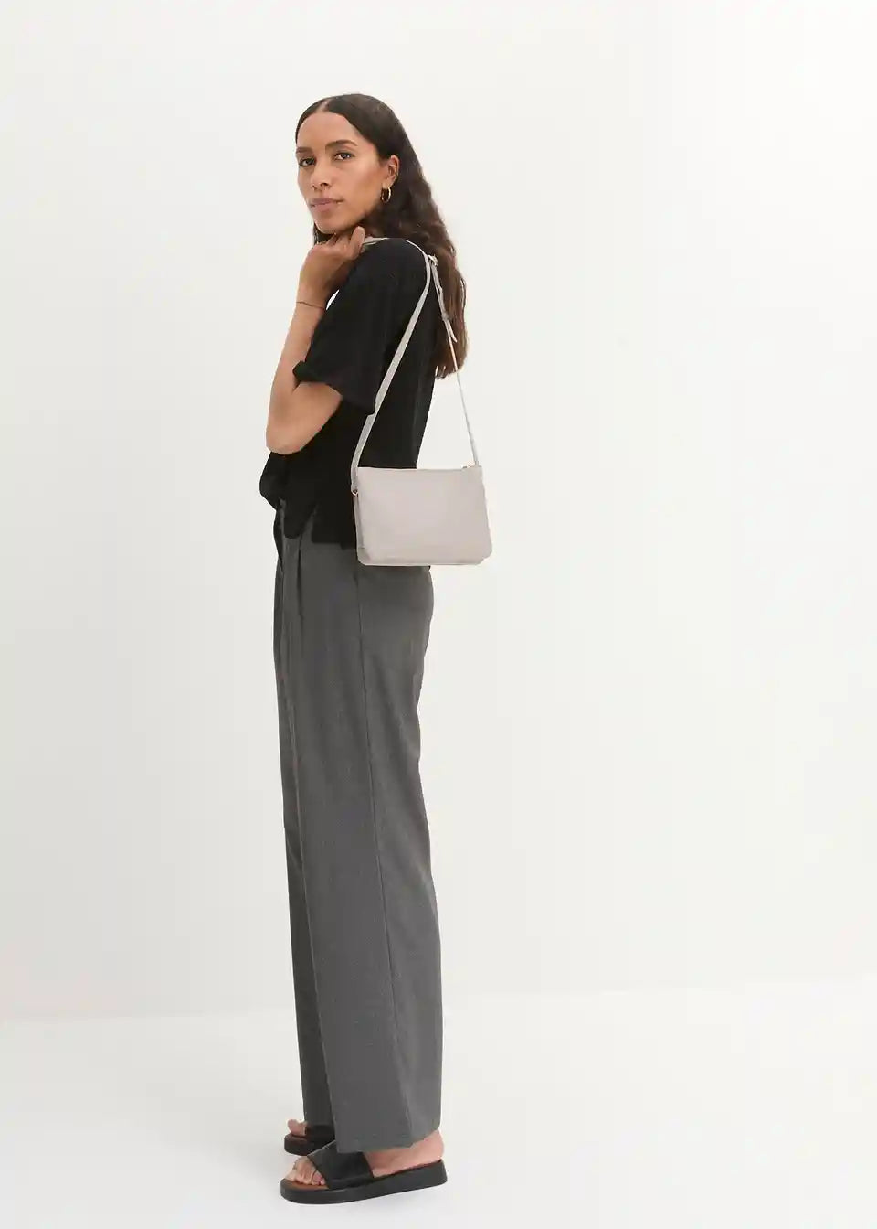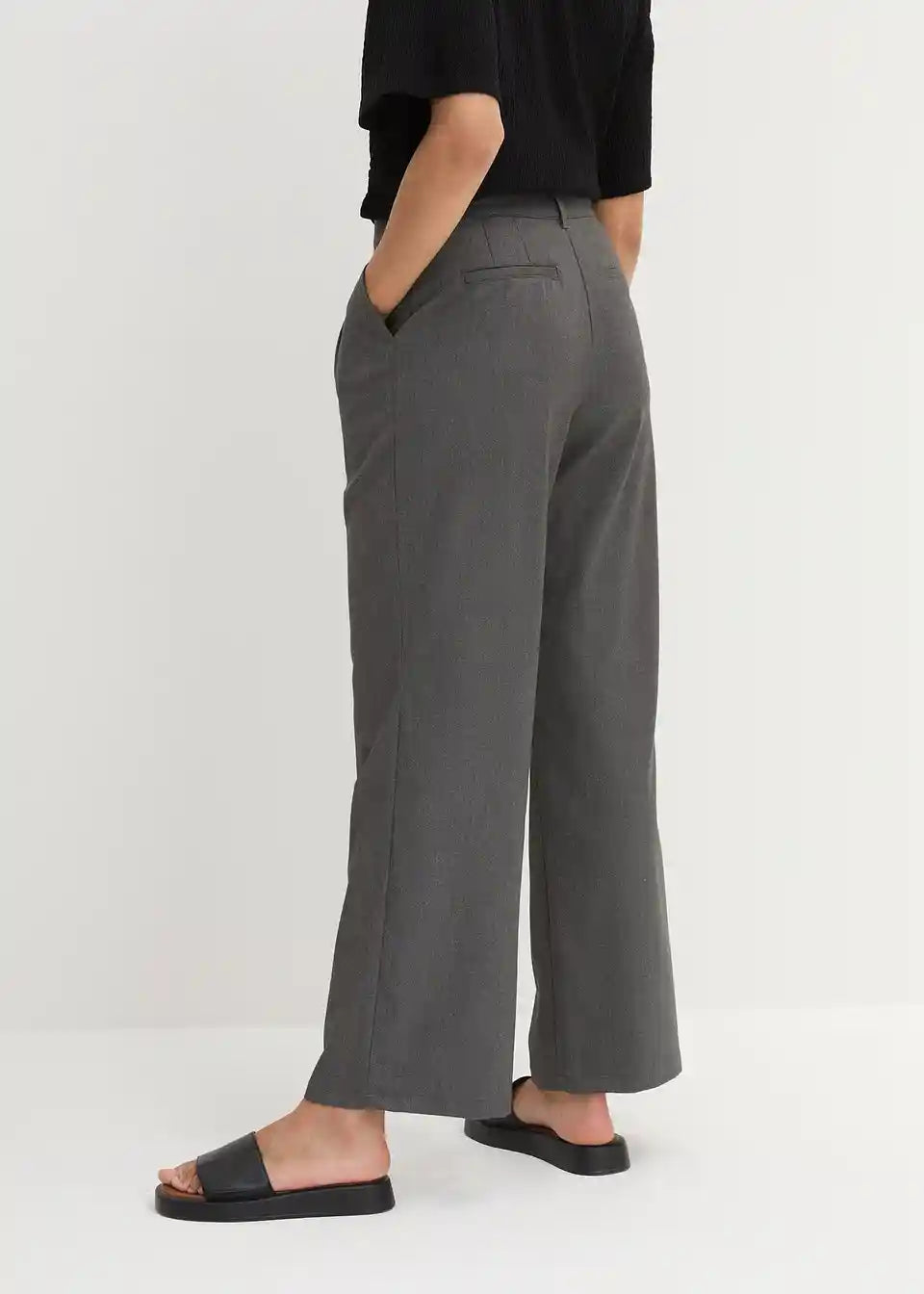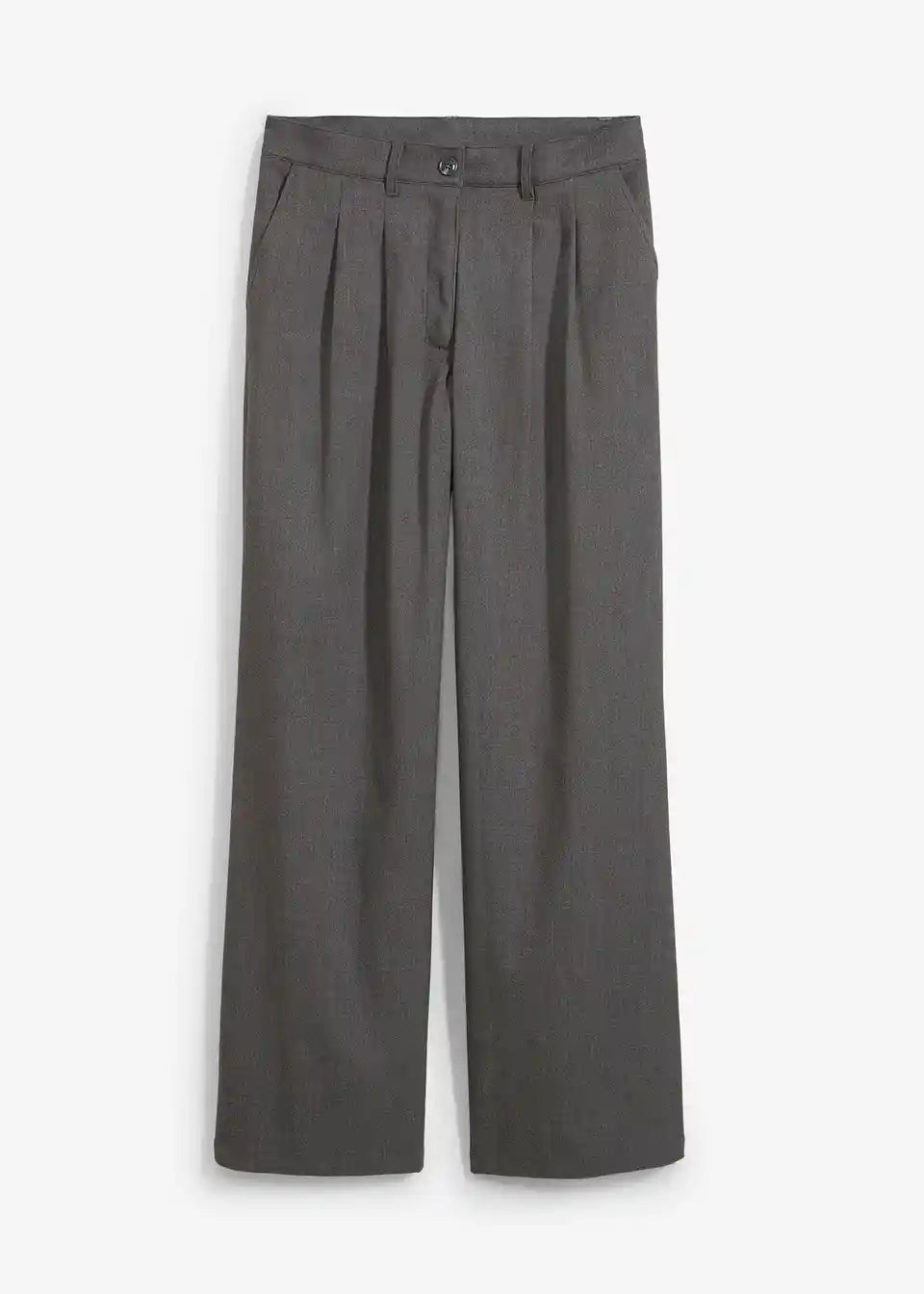Sivo melirane hlače visokog struka sa širokim nogavicama i naborima na prednjoj strani