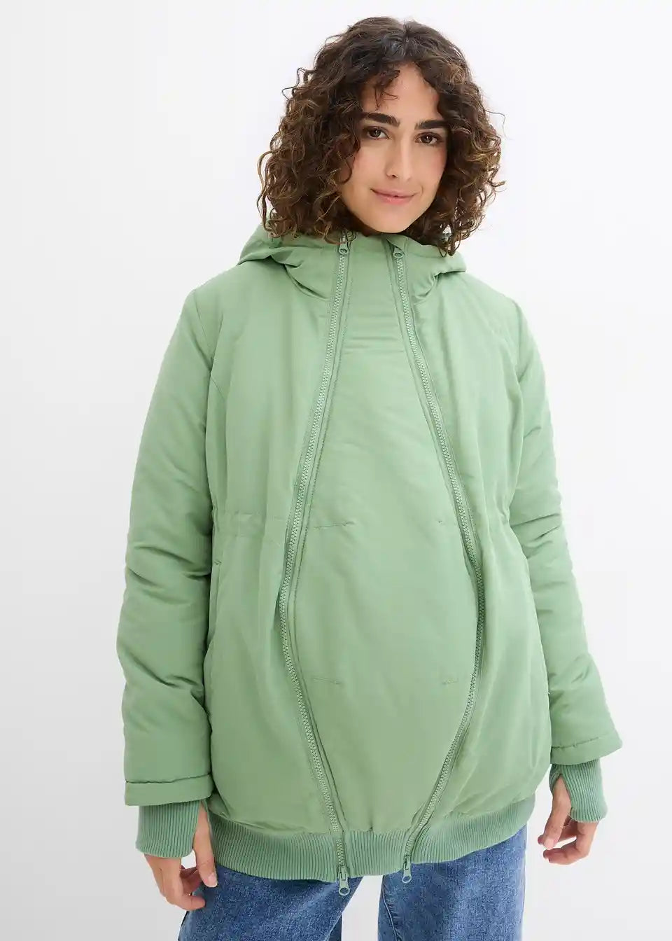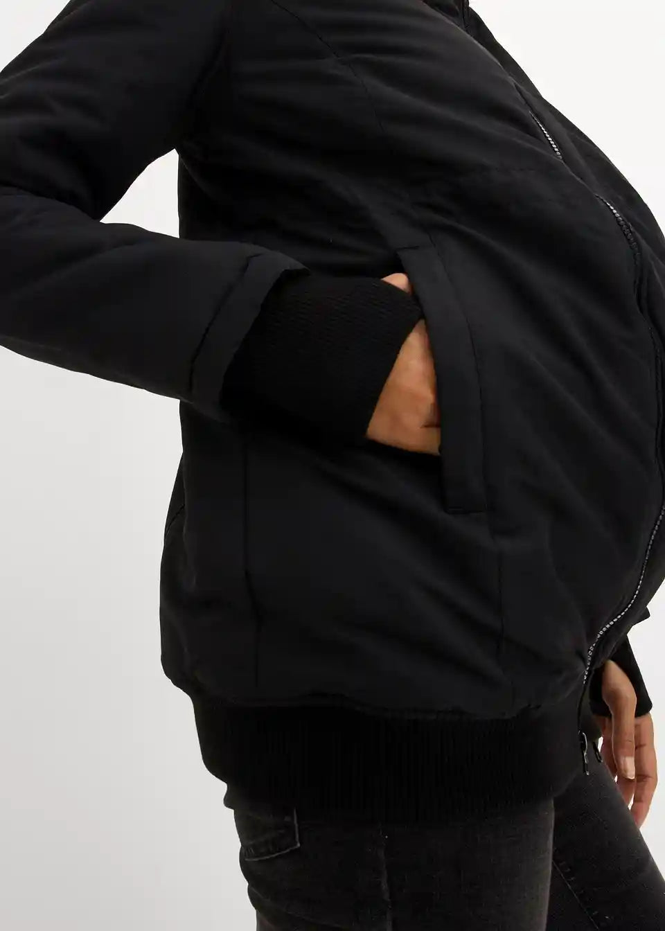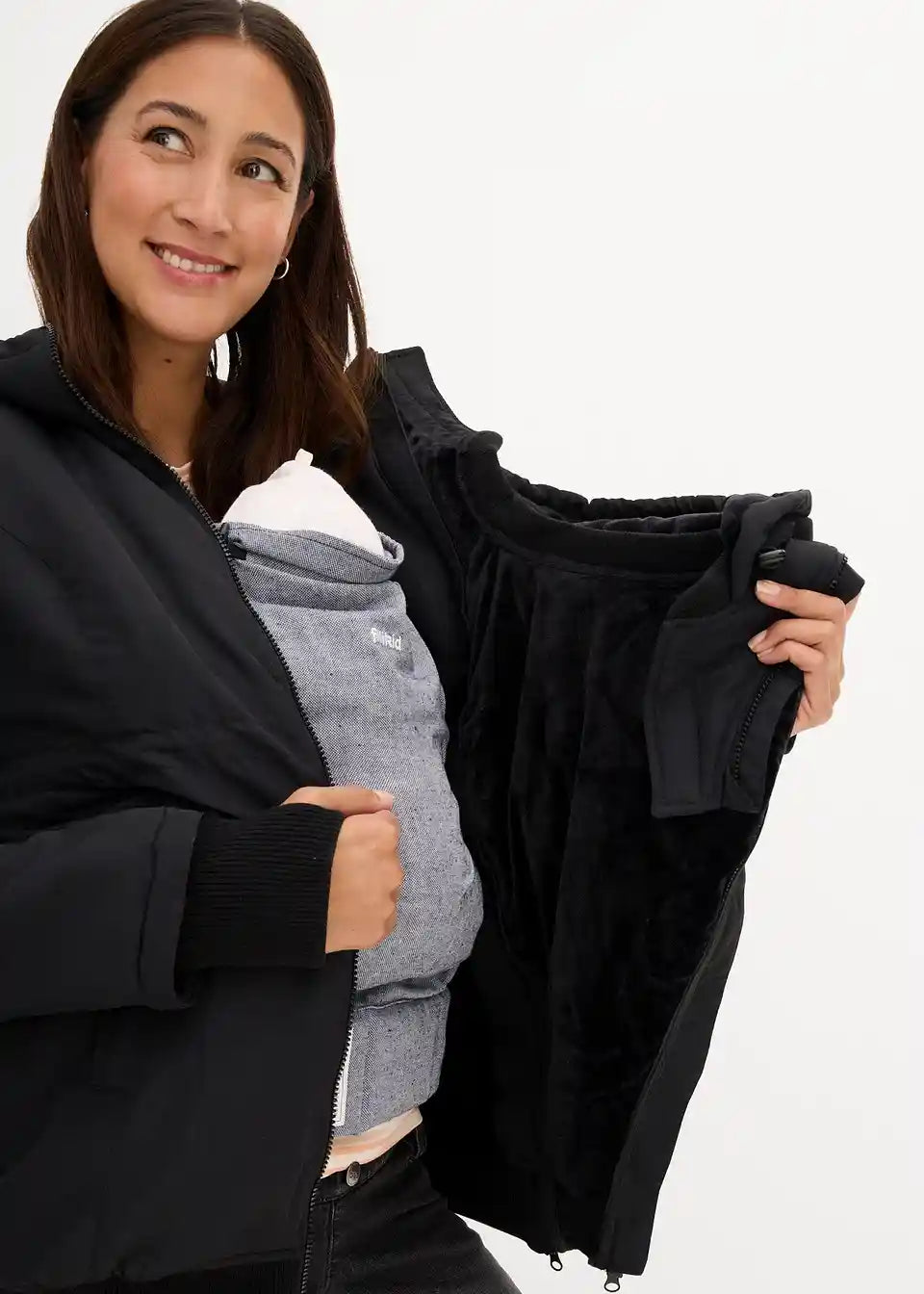 Funkcionalna jakna otporna na kišu i vjetar s dva umetka: proširivim umetkom za trudnoću i umetkom za nošenje bebe s kapuljačom. Mekani rebrasti rubovi na donjem dijelu i rukavima s otvorom za palac sprječavaju prodor hladnoće i vjetra. S praktičnim prednjim džepovima i skrivenim, podesivim vezicama u struku. Toplo podstavljena s flisom.