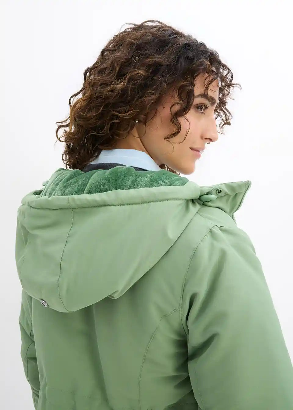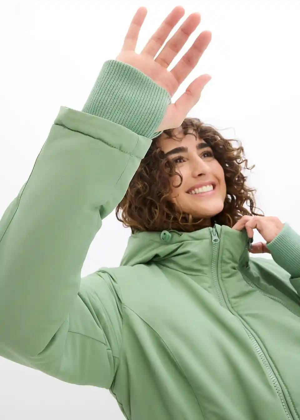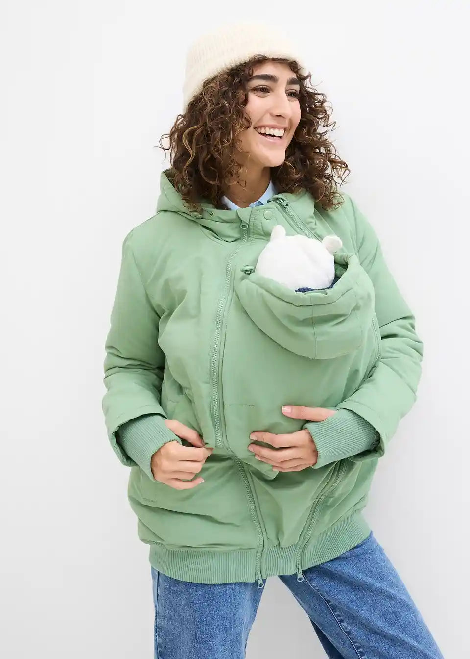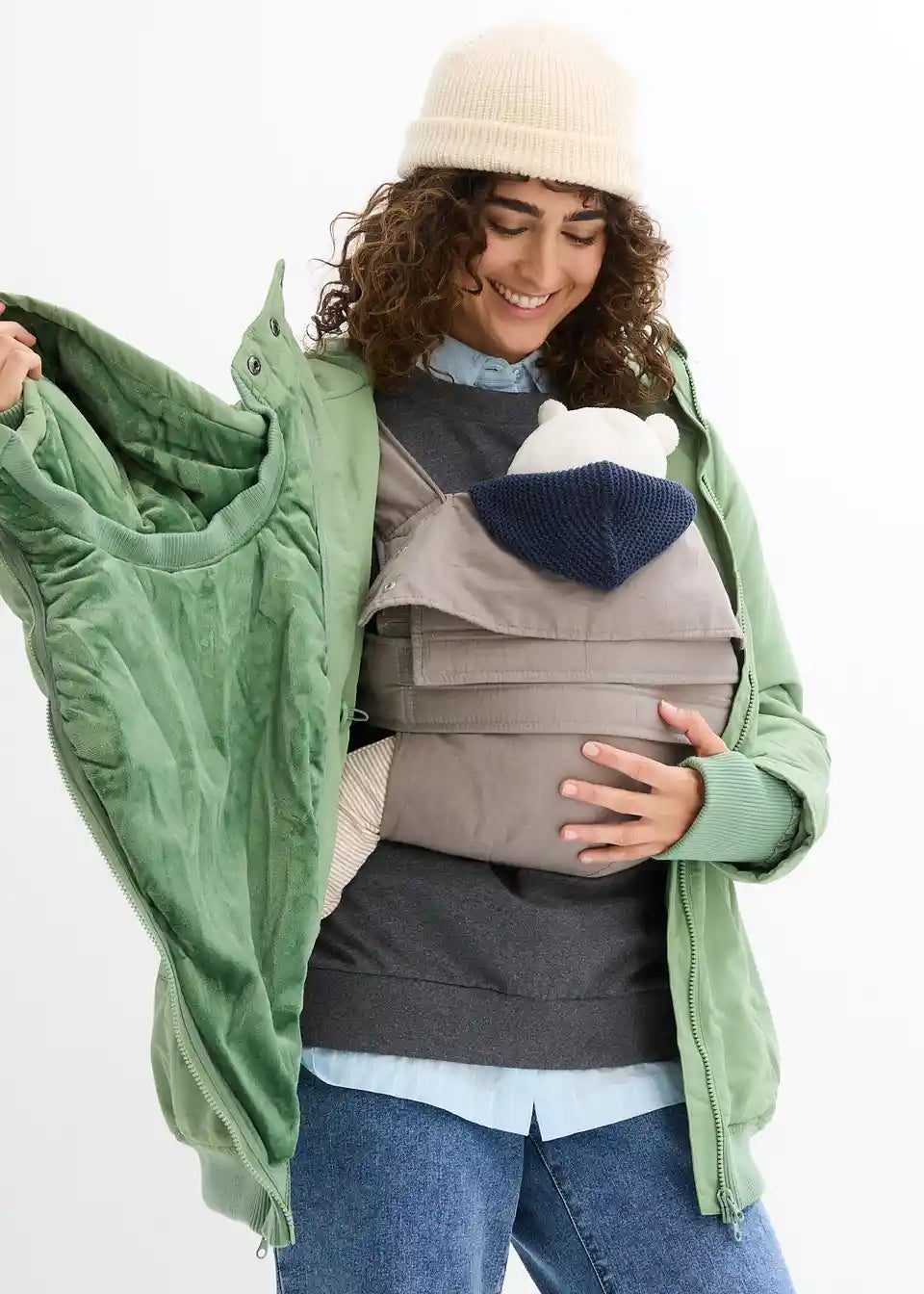 Funkcionalna jakna otporna na kišu i vjetar s dva umetka: proširivim umetkom za trudnoću i umetkom za nošenje bebe s kapuljačom. Mekani rebrasti rubovi na donjem dijelu i rukavima s otvorom za palac sprječavaju prodor hladnoće i vjetra. S praktičnim prednjim džepovima i skrivenim, podesivim vezicama u struku. Toplo podstavljena s flisom.