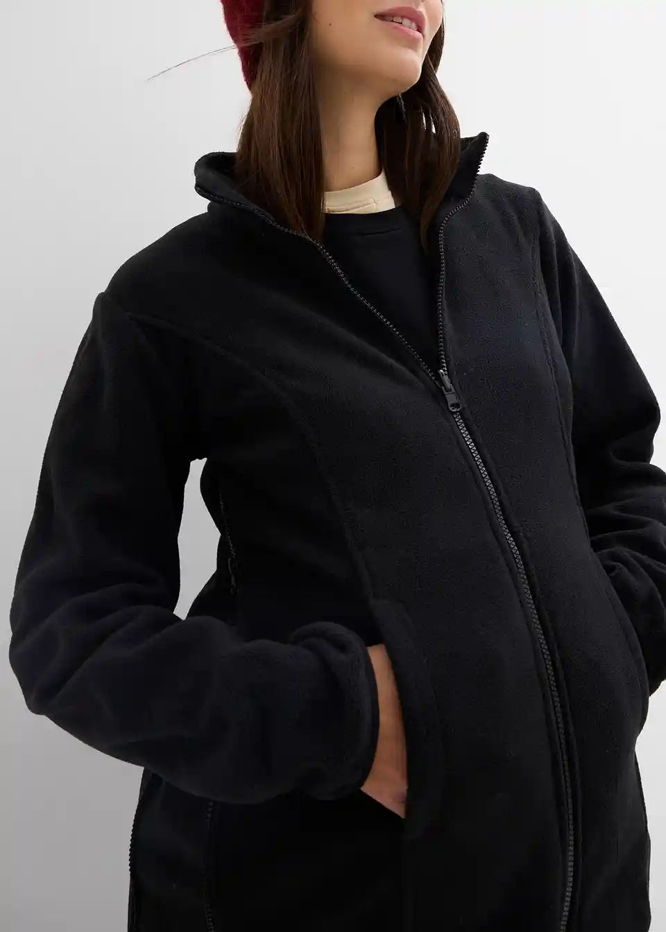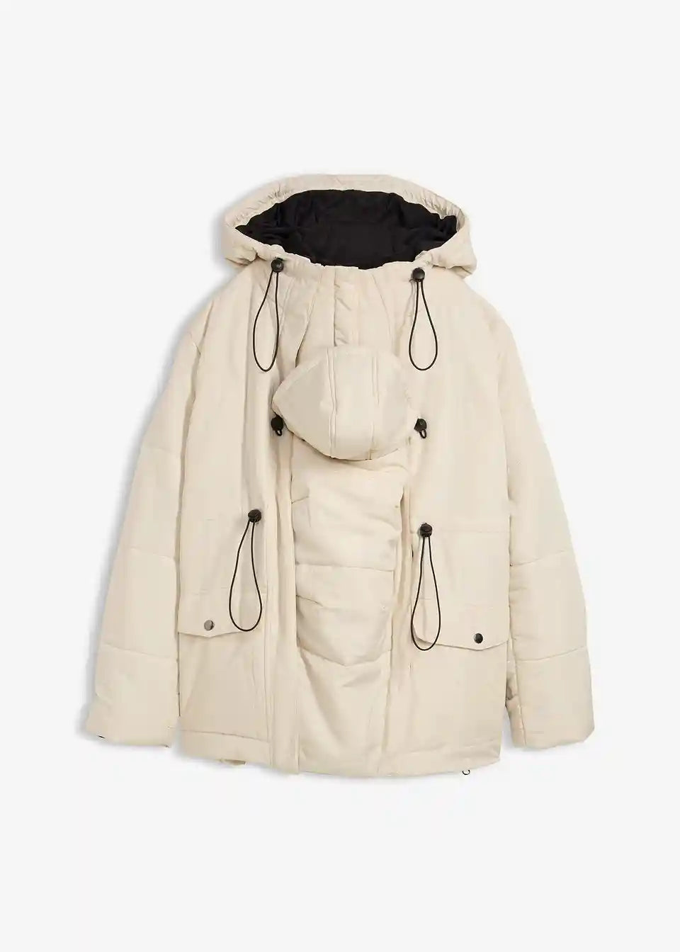 Ova svestrana jakna savršena je za trudnoću i razdoblje nošenja bebe. Ima izvadiv umetak za nošenje bebe, kao i kapuljače za majku i dijete, obje s podesivim vezicama. Umetak je dodatno opremljen drukerima kako bi ugodno grijao vrat majke. Bočni patentni zatvarači omogućuju fleksibilno podešavanje širine, tako da se jakna može nositi i tijekom i nakon trudnoće. Integrirana flis jakna također je opremljena bočnim patentnim zatvaračima i može se nositi zasebno. Praktični džepovi s kopčanjem na druker nude prostor za važne svakodnevne potrepštine. Elastična vezica u struku dodatno osigurava laskavu siluetu.