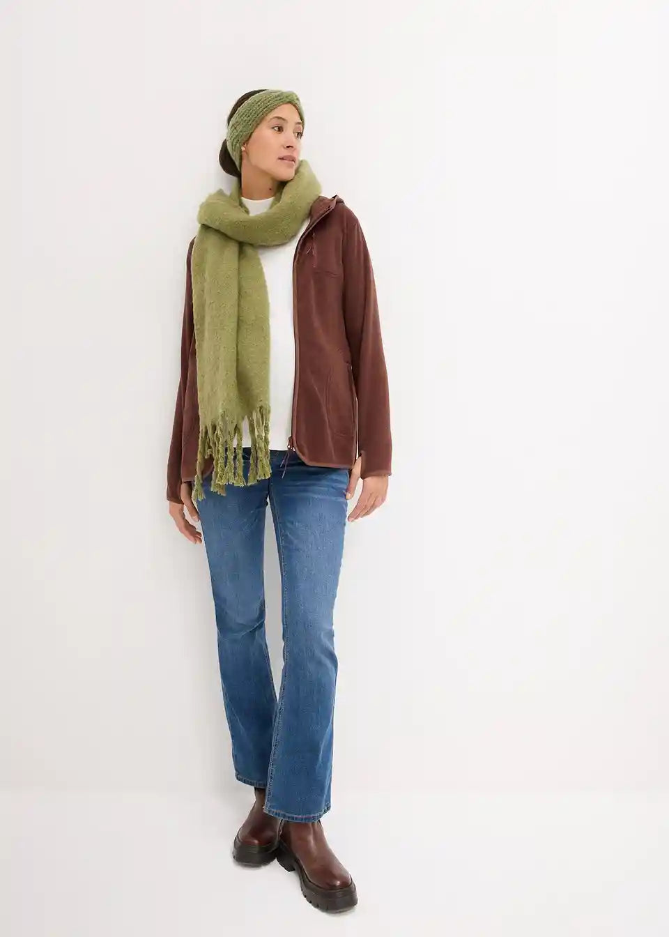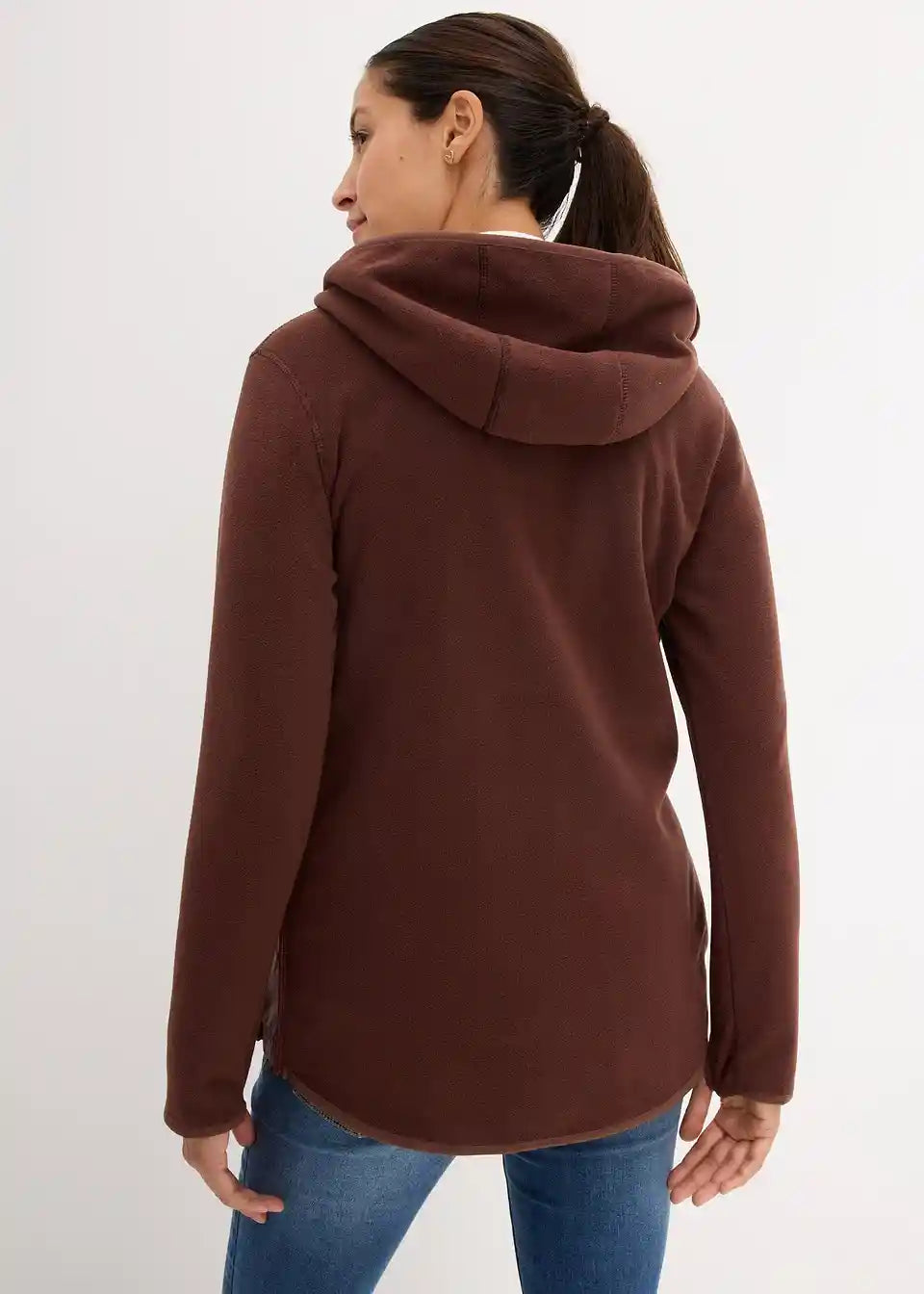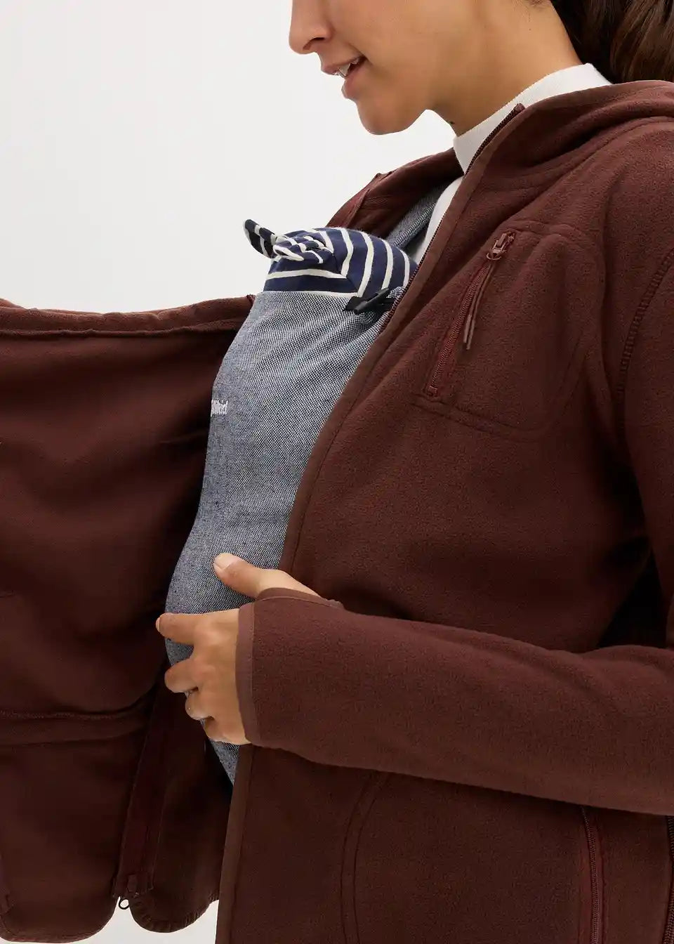 Topla flis jakna ima kapuljaču i duge rukave s otvorom za palac. Bočni patentni zatvarači omogućuju regulaciju širine, što omogućuje nošenje tokom i nakon trudnoće. Ima praktične džepove na patentni zatvarač i mali džep na prsima. Ugrijavajući umetak za bebe je opremljen malom kapuljačom s vezicama.